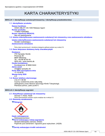 Sporządzona zgodnie z rozporządzeniem 2015/830 KARTA CHARAKTERYSTYKI SEKCJA 1: Identyfikacja substancji/mieszaniny i identyfikacja przedsiebiorstwa 1.1. Identyfikator produktu Nazwa handlowa ASSA ABLOY CS-1300 Release Agent Numer produktu 17395C+Q002983 Numer rejestracji (REACH) Nie ma zastosowania 1.2. Istotne zidentyfikowane zastosowania substancji lub mieszaniny oraz zastosowania odradzane Istotne zidentyfikowane zastosowania substancji lub mieszaniny Środek rozdzielający Zastosowania odradzane Pełny tekst wymienionych i określone kategorie aplikacji podane są w sekcji 16. 1.3. Dane dotyczace dostawcy karty charakterystyki Dostawca ITW Spraytec Nordic Priorsvej 36 8600 Silkeborg Tlf.: +45 86 82 64 44 SDS info.: www.itwinfo.dk Osoba kontaktowa Kundeservice: tlf 8682 6444 Adres email [email protected] Karta SDS sporządzona dnia 17-10-2016 Wersja karty SDS 2.0 1.4. Numer telefonu alarmowego (12) 411 99 99 Czynny codziennie przez całą dobę, obsługiwany przez lekarza dyżurnego Kliniki Toksykologii. Pierwsza pomoc, patrz punkt 4. SEKCJA 2: Identyfikacja zagrożeń 2.1. Klasyfikacja substancji lub mieszaniny Aerosol 1; H222, H229 Pełne sformułowanie zwrotów ryzyka znajduje się w sekcja 2.2. 2.2. Elementy oznakowania Piktogram Hasło ostrzegawcze Niebezpieczeństwo Zwrot wskazujący rodzaj zagrożenia Skrajnie łatwopalny aerozol. (H222) Pojemnik pod ciśnieniem: Ogrzanie grozi wybuchem. (H229) Zwroty wskazujące środki ostrożności ASSA ABLOY CS-1300 Release Agent 1/8 Sporządzona zgodnie z rozporządzeniem 2015/830 Ogólne Zapobieganie Przechowywać z dala od źródeł ciepła, gorących powierzchni, źródeł iskrzenia, otwartego ognia i innych źródeł zapłonu. Nie palić. (P210). Nie rozpylać nad otwartym ogniem lub innym źródłem zapłonu. (P211). Nie przekłuwać ani nie spalać, nawet po zużyciu. (P251). Stosować wyłącznie na zewnątrz lub w dobrze wentylowanym pomieszczeniu (P271). Stosować odzież ochronną/rękawice ochronne/ochronę ocz/ochronę twarzy. (P280). Chronić przed światłem słonecznym. Nie wystawiać na działanie temperatury przekraczającej 50 °C/122 °F. (P410+P412). - Reagowanie Przechowywanie Usuwanie Zawiera 2.3. Inne zagrożenia Produkt zawiera organiczny rozpuszczalnik. Wielokrotne wystawienie na działanie organicznych rozcieńczalników może spowodowań uszkodzenia systemu nerwowego i narządów wewnętrznych, np. wątroby i nerek. Informacje uzupełniające na etykiecie Inne VOC SEKCJA 3: Skład/ informacja o składnikach 3.1/3.2. Substancje/ Mieszaniny NAZWA: NUMERY IDENTYFIKACYJNE: ZAWARTOŚĆ: CLP KLASYFIKACJA: NAZWA: NUMERY IDENTYFIKACYJNE: ZAWARTOŚĆ: CLP KLASYFIKACJA: UWAGA: Gazy z ropy naftowej, skroplone (<0,1 % w/w 1,3-butadiene (EINECS No. 203-450-8)) CAS-nr: 68476-85-7 WEr-nr: 270-704-2 Nr indeksowy: 649-202-00-6 60-80% Comp. Gas, Flam. Gas 1 H220, H280 cyklopentan CAS-nr: 287-92-3 WEr-nr: 206-016-6 Nr indeksowy: 601-030-00-2 15-25% Flam. Liq. 2, Aquatic Chronic 3 H225, H412 S (*) Pełne sformułowanie zwrotów ryzyka znajduje się w sekcji 16. Wartości graniczne dotyczące higieny pracy wymienione są w sekcji 8, jeśli są dostępne. S = organiczny rozpuszczalnik. Inne informacje N chronic (CAT 4) Sum = Sum(Ci/M(chronic)i*25*0.1*10^CAT4) = 0,6192 - 0,9288 SEKCJA 4: Środki pierwszej pomocy 4.1. Opis środków pierwszej pomocy Ogólnie W razie wypadku: skontaktować się z lekarzem lub pogotowiem – zabrać ze sobą etykietę lub niniejszą kartę bezpieczeństwa. Lekarz może się zwrócić do Kliniki Medycyny Pracy i Środowiska w szpitalu. Jeśli objawy nie ustają, lub jeśli są wątpliwości co do stanu osoby poszkodowanej, trzeba się zwrócić po pomoc lekarską. Nigdy nie podawaj wody ani podobnych płynów osobie nieprzytomnej. Wdychanie Osobę należy umieścić na świeżym powietrzu i trzymać pod obserwacją. Kontakt ze skórą Należy natychmiast usunąć zanieczyszczone ubranie i obuwie. Skórę, która zetknęła się z materiałem, należy dokładnie umyć wodą z mydłem. Można zastosować środki do czyszczenia skóry. NIE używać rozpuszczalników ani rozcieńczalników. ASSA ABLOY CS-1300 Release Agent 2/8 Sporządzona zgodnie z rozporządzeniem 2015/830 Kontakt z oczami Usunąć ewentualne szkła kontaktowe. Natychmiast spłukać oczy dużą ilością wody (20-30 °C), aż minie podrażnienie i przez przynajmniej 15 minut. Należy zadbać o to, aby przepłukiwać pod górną i pod dolną powieką. Jeśli podrażnienie nie przechodzi, trzeba się zwrócić po pomoc lekarską. Połknięcia Dać osobie dużo płynu do picia i trzymać ją pod obserwacją. W przypadku złego samopoczucia: należy się natychmiast skontaktować z lekarzem i mieć przy sobie niniejszą kartę bezpieczeństwa lub etykietę produktu. Nie należy wywoływać wymiotów, jeśli lekarz tego nie zalecił. Ułożyć głowę nisko, tak, aby w razie wymiotów ich zawartość nie wróciła do ust i gardła. Oparzenie Płukać dużą ilością wody do ustania bólu i kontynuować 30 minut po ustaniu bólu. 4.2. Najważniejsze ostre i opóźnione objawy oraz skutki narażenia Działania neurotoksyczne: produkt zawiera rozpuszczalniki, które mogą wpływać na układ nerwowy. Do objawów neurotoksyczności należą: utrata apetytu, ból głowy, zawroty głowy, szum w uszach, mrowienie skóry, wrażliwość na zimno, skurcze, trudności z koncentracją, zmęczenie itp. Wielokrotne wystawienie na działanie organicznych rozpuszczalników może prowadzić do rozkładu naturalnej podściółki tłuszczowej skóry. W wyniku tego skóra będzie bardziej podatna na wchłanianie szkodliwych substancji, np. alergenów. 4.3. Wskazania dotyczące wszelkiej natychmiastowej pomocy lekarskiej i szczególnego postępowania z poszkodowanym Nie ma specjalnych Informacja dla lekarza Pokazać kartę charakterystyki. SEKCJA 5: Postępowanie w przypadku pożaru 5.1. Środki gaśnicze Zalecane są: odporna na alkohol piana, kwas węglowy, pros