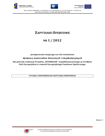 Biuro Projektu INTERBLOK: ul. Stradomska 10, 31-058 Kraków, Tel: 12-422-26-08 Fax.: 12-421-67-45 Bank PKO bp I/O Kraków; 10 1020 2892 0000 5902 0427 5400 ZAPYTANIE OFERTOWE NR 1 / 2012 post powania maj cego na celu wy onienie dostawcy materia ów biurowych eksploatacyjnych dla potrzeb realizacji Projektu „INTERBLOK” wspó finansowanego ze rodków Unii Europejskiej ramach Europejskiego Funduszu Spo ecznego. PYTANIA ODPOWIEDZI DO ZAPYTANIA OFERTOWEGO Strona | 1 Projekt wspó finansowany ze rodków Unii Europejskiej ramach Europejskiego Funduszu Spo ecznego Biuro Projektu INTERBLOK: ul. Stradomska 10, 31-058 Kraków, Tel: 12-422-26-08 Fax.: 12-421-67-45 Bank PKO bp I/O Kraków; 10 1020 2892 0000 5902 0427 5400 PYTANIA 30.01.2012 a. Poz. czy zamienniki mog by innej firmy ni Black Point b. Poz. 87 do jakich piecz tek ma by wk ad tuszuj cy c. Poz. 115 czy chodzi koszulki numerze katalogowym 56093 d. Poz. 116 koszulki katalogowe Leitz czy 10 opakowa po 10 sztuk e. Poz. 188 119 prosz okre li rodzajów skoroszytów pakowane po 10 sztuk czy nale jaki si skoroszyty chodzi wyceni 10 sztuk ofercie firmy Elba wyst puje 10 ODPOWIEDZI 31.01.2012 Ad. a. Zgodnie punktem 5.3. Zamawiaj cy nie dopuszcza mo liwo ci enia oferty wariantowej, co oznacza, nie przyjmuje zamienników wykazanych zapytaniu ofertowym. Ad. b. Zamawiaj cy wskazuje, wk ady winny by do piecz tki typu wagraf POLAN 4 Ad. c. Katalog produktów potencjalnego oferenta nie jest znany Zamawiaj cemu. powy szym Zamawiaj cy przedstawia charakterystyk koszulek pozycji 115. zwi zku Koszulki Esselte A4 krystaliczne. Do przechowywania dokumentów formacie A4. Multiperforowane. Koszulki otwierane góry. Wykonane mocnej folii polipropylenowej krystalicznej, grubo 105 mic. opakowaniu kartonowym 100szt. Ad. d. Zamawiaj cy wskazuje, wyceny nale dokona oparciu sztuki. zwi zku powy szym nale przedstawi cen jednostkow za sztuk uwagi na fakt, Zamawiaj cy mo dokona zakupu tylko wy cznie wybranej ilo ci sztuk bez konieczno ci zamówienia ca ego opakowania. Poni ej przedstawia si charakterystyk koszulek katalogowych zamieszczonych pkt. 116. Koszulki Leitz A4 poszerzane. poszerzanym brzegiem do przechowywania katalogów, cenników grubych ofert (harmonijkowy brzeg). Multiperforowane. Pasek perforowany wzmocniony. Otwierane góry. Wykonane mocnej folii polipropylenowej. Strona | 2 Projekt wspó finansowany ze rodków Unii Europejskiej ramach Europejskiego Funduszu Spo ecznego Biuro Projektu INTERBLOK: ul. Stradomska 10, 31-058 Kraków, Tel: 12-422-26-08 Fax.: 12-421-67-45 Bank PKO bp I/O Kraków; 10 1020 2892 0000 5902 0427 5400 Ad. e. zapytaniu skierowanym do Zamawiaj cego przedstawiono tpliwo ci do punktu 188 zestawienia. Zamawiaj cy nie wskaza zapytaniu pozycji 188, zwi zku tym udziela odpowiedzi na punkt 118. Zamawiaj cy wskazuje, pozycji 118 oferent powinien uj skoroszyt nast puj cej charakterystyce: Skoroszyt do przechowywania dokumentów formatu A4 typu 1/2 przedniej ok adki. Posiada zaczep hakowy, umo liwiaj cy atwe wpi cie do segregatora. kartonu 250 g. Na frontowej ok adce pola do opisów. Metalowe zapi cie skoroszytowe. Kolory: ty, zielony, niebieski, pomara czowy, czerwony, szary. Zamawiaj cy wskazuje, pozycji 119 oferent powinien uj nast puj cej charakterystyce: skoroszyt Trwa skoroszyt PCV. przezroczyst bezbarwn ok adk otworami umo liwiaj cymi wpinanie do segregatora. Wymienna etykieta ugo ci ca ego grzbietu. Kolory: czerwony, czarny, niebieski, zielony, ty, bia y. PYTANIA 31.01.2012 a. pozycja 83 co znaczy zszywki du e, prosz poda rozmiar b. Prosz jeszcze wyja nienie pozycji nr 51 do tej drukarki jest tusz czarna kolorowy ale maj ró ne ceny. Który nale wyceni ODPOWIEDZI 01.02.2012 Ad. a. Zamawiaj cy wskazuje, zszywki winny by odpowiednie do modelu Zszywacza LEITZ 5551 Blok-Heftgerat Heavy Duty stapler. Ad. b. Zamawiaj cy wskazuje, nale wyceni tusz czarny. Strona | 3 Projekt wspó finansowany ze rodków Unii Europejskiej ramach Europejskiego Funduszu Spo ecznego