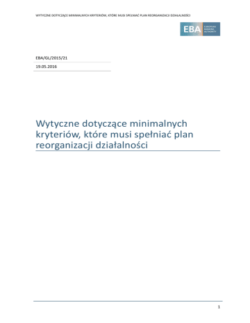 WYTYCZNE DOTYCZĄCE MINIMALNYCH KRYTERIÓW, KTÓRE MUSI SPEŁNIAĆ PLAN REORGANIZACJI DZIAŁALNOŚCI EBA/GL/2015/21 19.05.2016 Wytyczne dotyczące minimalnych kryteriów, które musi spełniać plan reorganizacji działalności 1 WYTYCZNE DOTYCZĄCE MINIMALNYCH KRYTERIÓW, KTÓRE MUSI SPEŁNIAĆ PLAN REORGANIZACJI DZIAŁALNOŚCI 1. Zgodność i obowiązki sprawozdawcze Status niniejszych wytycznych 1. Niniejszy dokument zawiera wytyczne wydane zgodnie z art. 16 rozporządzenia (UE) nr 1093/2010 1. Zgodnie z art. 16 ust. 3 rozporządzenia (UE) nr 1093/2010 właściwe organy i instytucje finansowe dokładają wszelkich starań, aby zastosować się do tych wytycznych i zaleceń. 2. 2. Wytyczne przedstawiają stanowisko EUNB w sprawie odpowiednich praktyk nadzoru w ramach Europejskiego Systemu Nadzoru Finansowego lub tego, jak należy stosować prawo europejskie w konkretnym obszarze. Właściwe organy określone w art. 4 ust. 2 rozporządzenia (UE) nr 1093/2010, do których wytyczne mają zastosowanie, powinny stosować się do wytycznych poprzez wprowadzenie ich odpowiednio do swoich praktyk (np. poprzez dostosowanie swoich ram prawnych lub procesów nadzorczych), również jeżeli wytyczne są skierowane przede wszystkim do instytucji. Wymogi dotyczące sprawozdawczości 3. Zgodnie z art. 16 ust. 3 rozporządzenia (UE) nr 1093/2010 właściwe organy muszą poinformować EUNB, czy stosują się lub czy zamierzą zastosować się do niniejszych wytycznych lub danego zalecenia lub podają powody niestosowania się do dnia 19.07.2016. W przypadku braku informacji w tym terminie właściwe organy zostaną uznane przez EUNB za niestosujące się do niniejszych wytycznych. Informacje należy przekazać poprzez wysłanie formularza dostępnego na stronie internetowej EUNB na [email protected] z dopiskiem „EBA/GL/2015/21”. Informacje przekazują osoby upoważnione do informowania o niestosowaniu się do wytycznych w imieniu właściwych organów. Wszelkie zmiany dotyczące stosowania się do wytycznych także należy zgłaszać do EUNB. Zgodnie z art. 16 ust. 3 przekazywane informacje publikuje się na stronie internetowej EUNB. 1 Rozporządzenie Parlamentu Europejskiego i Rady (UE) nr 1093/2010 z dnia 24 listopada 2010 r. w sprawie ustanowienia Europejskiego Urzędu Nadzoru (Europejskiego Urzędu Nadzoru Bankowego), zmiany decyzji nr 716/2009/WE oraz uchylenia decyzji Komisji 2009/78/WE (Dz.U. L 331 z 15.12.2010, s. 12). 2 WYTYCZNE DOTYCZĄCE MINIMALNYCH KRYTERIÓW, KTÓRE MUSI SPEŁNIAĆ PLAN REORGANIZACJI DZIAŁALNOŚCI Tytuł I - Przedmiot, zakres i definicje 1. Przedmiot Niniejsze wytyczne określają minimalne kryteria, które musi spełniać plan reorganizacji działalności, by mógł zostać zatwierdzony przez organ ds. restrukturyzacji i uporządkowanej likwidacji zgodnie z art. 52 ust. 7 dyrektywy 2014/59/UE. 2. Adresaci Niniejsze wytyczne są skierowane do organów ds. restrukturyzacji i uporządkowanej likwidacji oraz właściwych organów. 3. Definicje 3.1 „Scenariusz bazowy” ma znaczenie określone w [art. 1 ust. 4 EBA/RTS/2015/12]. 3.2 „Okres reorganizacji” ma znaczenie określone w [art. 1 ust. 3 EBA/RTS/2015/12]. 3.3 „Plan restrukturyzacji” oznacza plan przedkładany przez instytucję lub podmiot w związku z udzieleniem pomocy państwa zgodnie z art. 107 i 108 TFUE. Tytuł II – Określenie minimalnych kryteriów na potrzeby oceny planu reorganizacji działalności Do celów zatwierdzenia planu reorganizacji działalności zgodnie z art. 52 ust. 7 organ ds. restrukturyzacji i uporządkowanej likwidacji oraz właściwy organ powinny ocenić plan reorganizacji działalności co najmniej według minimalnych kryteriów określonych w pkt 2 – 5 niniejszego tytułu II. 1. Świadomość i zaangażowanie Plan reorganizacji działalności powinien wykazywać, że organ zarządzający lub osoba bądź osoby wyznaczone zgodnie z art. 72 ust. 1 dyrektywy 2014/59/UE instytucji lub podmiotu, o których mowa w lit. b), c) i d) art. 1 ust. 1 dyrektywy 2014/59/UE: 1. popierają plan reorganizacji działalności i angażują się na rzecz jego realizacji; 2. wskazały jeden lub kilka działów odpowiedzialnych za realizację planu reorganizacji działalności i wyznaczyły osobę lub osoby, którym powierzono wyższe funkcje kierownicze w tym dziale bądź działach. 3. podejmują współpracę i udzielają wsparcia na rzecz planu reorganizacji działalności wśród najważniejszych wewnętrznych i zewnętrznych interesariuszy, takich jak: 3 WYTYCZNE DOTYCZĄCE MINIMALNYCH KRYTERIÓW, KTÓRE MUSI SPEŁNIAĆ PLAN REORGANIZACJI DZIAŁALNOŚCI 3.1. zarząd lub komitet wykonawczy instytucji lub podmiotu, o których mowa w lit. b), c) i d) art. 1 ust. 1 dyrektywy 2014/59/UE, które będą ostatecznie odpowiadały za strategię reorganizacji; 3.2. właściwe organy i organy ds. restrukturyzacji i uporządkowanej likwidacji spoza UE, które mogą odpowiadać za części instytucji lub podmiotu. 2. Wiarygodność 2.1 Plan reorganizacji działalności powinien wykazywać, z wysoką wiarygodnością, że jego realizacja doprowadzi do przywrócenia długoterminowej rentowności instytucji lub podmiotu, o których mowa w lit. b), c) i d) art. 1 ust. 1 dyrektywy 2014/59/UE. Należy to wykazać na podstawie wiarygodnych założeń, analizy opartej na scenariuszach i odpowiednich oraz konkretnych wskaźników efektywności obejmujących wyniki całej grupy, poszczególnych podmiotów i linii biznesowych, które nie mają być przedmiotem likwidacji lub zbycia. 2.2 Wszelkie założenia i wskaźniki efektywności powinny być porównywane z odpowiednimi wskaźnikami ogólnosektorowymi i powinny być zgodne z dostępnymi prognozami makroekonomicznym. 2.3 W przypadku gdy plan reorganizacji działalności zawiera opis, w jaki sposób instytucja lub podmiot, o których mowa w lit. b), c) i d) art. 1 ust. 1 dyrektywy 2014/59/UE, zdoła zapewnić akceptowalny zwrot finansowy, wówczas zwrot ten nal