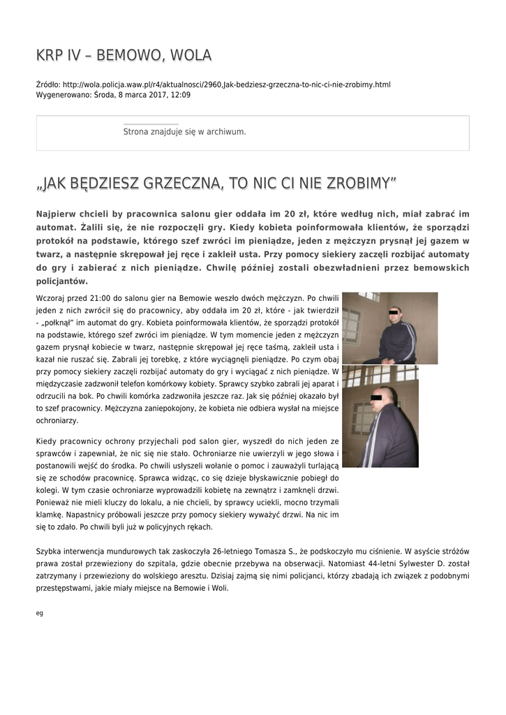 KRP IV – BEMOWO, WOLA Źródło: http://wola.policja.waw.pl/r4/aktualnosci/2960,Jak-bedziesz-grzeczna-to-nic-ci-nie-zrobimy.html Wygenerowano: Środa, 8 marca 2017, 12:09 Strona znajduje się w archiwum. „JAK BĘDZIESZ GRZECZNA, TO NIC CI NIE ZROBIMY” Najpierw chcieli by pracownica salonu gier oddała im 20 zł, które według nich, miał zabrać im automat. Żalili się, że nie rozpoczęli gry. Kiedy kobieta poinformowała klientów, że sporządzi protokół na podstawie, którego szef zwróci im pieniądze, jeden z mężczyzn prysnął jej gazem w twarz, a następnie skrępował jej ręce i zakleił usta. Przy pomocy siekiery zaczęli rozbijać automaty do gry i zabierać z nich pieniądze. Chwilę później zostali obezwładnieni przez bemowskich policjantów. Wczoraj przed 21:00 do salonu gier na Bemowie weszło dwóch mężczyzn. Po chwili jeden z nich zwrócił się do pracownicy, aby oddała im 20 zł, które - jak twierdził - „połknął” im automat do gry. Kobieta poinformowała klientów, że sporządzi protokół na podstawie, którego szef zwróci im pieniądze. W tym momencie jeden z mężczyzn gazem prysnął kobiecie w twarz, następnie skrępował jej ręce taśmą, zakleił usta i kazał nie ruszać się. Zabrali jej torebkę, z które wyciągnęli pieniądze. Po czym obaj przy pomocy siekiery zaczęli rozbijać automaty do gry i wyciągać z nich pieniądze. W międzyczasie zadzwonił telefon komórkowy kobiety. Sprawcy szybko zabrali jej aparat i odrzucili na bok. Po chwili komórka zadzwoniła jeszcze raz. Jak się później okazało był to szef pracownicy. Mężczyzna zaniepokojony, że kobieta nie odbiera wysłał na miejsce ochroniarzy. Kiedy pracownicy ochrony przyjechali pod salon gier, wyszedł do nich jeden ze sprawców i zapewniał, że nic się nie stało. Ochroniarze nie uwierzyli w jego słowa i postanowili wejść do środka. Po chwili usłyszeli wołanie o pomoc i zauważyli turlającą się ze schodów pracownicę. Sprawca widząc, co się dzieje błyskawicznie pobiegł do kolegi. W tym czasie ochroniarze wyprowadzili kobietę na zewnątrz i zamknęli drzwi. Ponieważ nie mieli kluczy do lokalu, a nie chcieli, by sprawcy uciekli, mocno trzymali klamkę. Napastnicy próbowali jeszcze przy pomocy siekiery wyważyć drzwi. Na nic im się to zdało. Po chwili byli już w policyjnych rękach. Szybka interwencja mundurowych tak zaskoczyła 26-letniego Tomasza S., że podskoczyło mu ciśnienie. W asyście stróżów prawa został przewieziony do szpitala, gdzie obecnie przebywa na obserwacji. Natomiast 44-letni Sylwester D. został zatrzymany i przewieziony do wolskiego aresztu. Dzisiaj zajmą się nimi policjanci, którzy zbadają ich związek z podobnymi przestępstwami, jakie miały miejsce na Bemowie i Woli. eg Ocena: 0/5 (0) Tweetnij