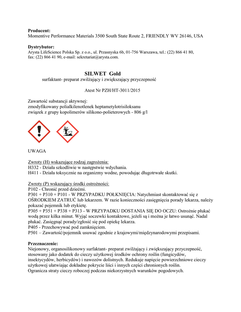 Producent: Momentive Performance Materials 3500 South State Route 2, FRIENDLY WV 26146, USA Dystrybutor: Arysta LifeScience Polska Sp. z o.o., ul. Przasnyska 6b, 01-756 Warszawa, tel.: (22) 866 41 80, fax: (22) 866 41 90, e-mail: [email protected]. SILWET Gold surfaktant- preparat zwilżający i zwiększający przyczepność Atest Nr PZH/HT-3011/2015 Zawartość substancji aktywnej: zmodyfikowany polialkilenotlenek heptametylotrisiloksanu związek z grupy kopolimerów silikono-polieterowych - 806 g/l UWAGA Zwroty (H) wskazujące rodzaj zagrożenia: H332 - Działa szkodliwie w następstwie wdychania. H411 - Działa toksycznie na organizmy wodne, powodując długotrwałe skutki. Zwroty (P) wskazujący środki ostrożności: P102 - Chronić przed dziećmi. P301 + P310 + P101 - W PRZYPADKU POŁKNIĘCIA: Natychmiast skontaktować się z OŚRODKIEM ZATRUĆ lub lekarzem. W razie konieczności zasięgnięcia porady lekarza, należy pokazać pojemnik lub etykietę. P305 + P351 + P338 + P313 - W PRZYPADKU DOSTANIA SIĘ DO OCZU: Ostrożnie płukać wodą przez kilka minut. Wyjąć soczewki kontaktowe, jeżeli są i można je łatwo usunąć. Nadal płukać. Zasięgnąć porady/zgłosić się pod opiekę lekarza. P405 - Przechowywać pod zamknięciem. P501 – Zawartość/pojemnik usuwać zgodnie z krajowymi/międzynarodowymi przepisami. Przeznaczenie: Niejonowy, organosilikonowy surfaktant- preparat zwilżający i zwiększający przyczepność, stosowany jako dodatek do cieczy użytkowej środków ochrony roślin (fungicydów, insektycydów, herbicydów) i nawozów dolistnych. Redukuje napięcie powierzchniowe cieczy użytkowej ułatwiając dokładne pokrycie liści i innych części chronionych roślin. Ogranicza straty cieczy roboczej podczas niekorzystnych warunków pogodowych. Dawkowanie: - Uprawy rolnicze stosować w dawce 0,1 l/ha, przy użyciu 200-300 l wody. - Uprawy sadownicze, uprawy warzywnicze, rośliny ozdobne stosować w stężeniu 0,015% (150 ml preparatu na 1000 l wody). UWAGI: 1. Silwet Gold stosować w cieczy użytkowej o pH 5-8 2. Ciecz użytkową wykorzystać w ciągu 24 godzin po przygotowaniu. SPORZĄDZANIE CIECZY UŻYTKOWEJ Ciecz użytkową przygotować bezpośrednio przed zastosowaniem. Przygotować obliczoną ilość środka Silwet Gold zgodnie z zalecanym dawkowaniem. Napełnić zbiornik wodą w około 2/3 jego pojemności, wlać odmierzoną ilość środka ochrony roślin i dokładnie wymieszać. Uzupełnić wodą do 90% pojemności, dodać odmierzoną ilość preparatu Silwet Gold i mieszać przez 1-2 minuty, uzupełnić wodą do 100 % pojemności i zamieszać. Opróżnione opakowania przepłukać trzykrotnie wodą, a popłuczyny wlać do zbiornika opryskiwacza z cieczą użytkową. Po pracy aparaturę dokładnie wymyć. PRZECHOWYWANIE Przechowywać pod zamknięciem i chronić przed dziećmi. Nie przechowywać razem z żywnością, napojami i paszami dla zwierząt. Przechowywać wyłącznie w oryginalnym opakowaniu w temperaturze nie niższej niż 5o C i nie wyższej niż 30o C. WARUNKI BEZPIECZNEGO STOSOWANIA PREPARATU Nie jeść i nie pić oraz nie palić tytoniu podczas stosowania preparatu. Nie wdychać rozpylonej cieczy użytkowej. Unikać zanieczyszczenia oczu. Zanieczyszczone oczy przemyć natychmiast dużą ilością wody i zasięgnąć porady lekarza. Nosić odpowiednią odzież ochronną, odpowiednie rękawice ochronne i okulary/ochronę twarzy. W przypadku awarii lub jeżeli źle się poczujesz, niezwłocznie zasięgnij porady lekarza jeżeli to możliwe, pokaż etykietę. Resztki cieczy użytkowej rozcieńczyć wodą i wypryskać na powierzchni poprzednio opryskiwanej. Wodę zużytą do mycia aparatury wypryskać na powierzchni uprzednio opryskiwanej, stosując te same środki ochrony osobistej. Opróżnione opakowania po produkcie zwrócić do sprzedawcy, u którego produkt został zakupiony. Zabrania się spalania opakowań po preparacie we własnym zakresie. Podczas postępowania ze środkami ochrony roślin należy ściśle przestrzegać zapisów zawartych w etykietach-instrukcjach stosowania tych środków. UWAGA ZABRANIA SIĘ WYKORZYSTYWANIA OPRÓŻNIONYCH OPAKOWAŃ PO PREPARACIE DO INNYCH CELÓW, W TYM TAKŻE TRAKTOWANIA ICH JAKO SUROWCE WTÓRNE. ANTIDOTUM: brak, stosować leczenie objawowe. Pomoc medyczna W zaistniałych sytuacjach, kiedy wymagana jest lub konieczna inna pomoc medyczna niż ujęta w wyżej wymienionych ostrzeżeniach skontaktować się z najbliższym ośrodkiem toksykologicznym. Okres ważności - 2 lata Data produkcji - ........ Zawartość netto - ........ Nr partii .....
