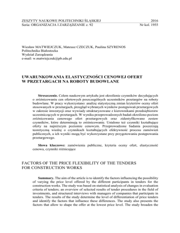 ZESZYTY NAUKOWE POLITECHNIKI ŚLĄSKIEJ Seria: ORGANIZACJA I ZARZĄDZANIE z. 92 2016 Nr kol. 1955 Wiesław MATWIEJCZUK, Mateusz CZECZUK, Paulina SZYRENOS Politechnika Białostocka Wydział Zarządzania e-mail: [email protected] UWARUNKOWANIA ELASTYCZNOŚCI CENOWEJ OFERT W PRZETARGACH NA ROBOTY BUDOWLANE Streszczenie. Celem naukowym artykułu jest określenie czynników decydujących o zróżnicowaniu cen ofertowych poszczególnych uczestników przetargów na roboty budowlane. W pracy wykorzystano: analizę statystyczną zmian kryteriów oceny ofert stosowanych w przetargach, przegląd wybranych wyników postępowań przetargowych w zakresie inwestycji oraz wywiady strukturyzowane z kierownikami przedsiębiorstw uczestniczących w przetargach. W wyniku przeprowadzonych badań określono poziom zróżnicowania cenowego ofert przetargowych oraz zidentyfikowano zestaw czynników, które determinują to zróżnicowanie. Ustalono też czynniki kształtujące oferty na najniższym poziomie cenowym. Przeprowadzone badania poszerzają teoretyczną wiedzę o czynnikach kształtujących efektywność procesu zamówień publicznych, a ich wyniki mogą być wykorzystane przy przygotowaniu postępowania przetargowego. Słowa kluczowe: zamówienia publiczne, kryteria oceny ofert, elastyczność cenowa, czynniki różnicujące FACTORS OF THE PRICE FLEXIBILITY OF THE TENDERS FOR CONSTRUCTION WORKS Summary. The aim of the article is to identify the factors influencing the possibility of varying the price level offered by the different participants in tenders for the construction works. The study was based on statistical analysis of changes in evaluation criteria of tenders; an overview of selected results of tender procedures in the field of investments, and structured interviews with managers of companies that participate in tenders. The results of the study determine the level of differentiation of price tenders and identify the factors that influence these differences. The study also presents the factors that allow to shape the offer at the lowest price level. The study broaden the W. Matwiejczuk, M. Czeczuk, P. Szyrenos 204 understanding about the determinants of the effectiveness of the procurement process, and the results can be used in the preparation of the tender procedure. Keywords: public procurement, evaluation criteria of tender, price flexibility, differentiating factors 1. Wstęp Poziom cenowy ofert w przetargach publicznych budzi zawsze duże zainteresowanie społeczne. Jednak tylko specjaliści rozpatrują obiektywne czynniki, które decydują o wartości oferty i wyborze oferenta. Realizacja celu gospodarczego – czyli wyborów najkorzystniejszej oferty, prowadzony za pomocą postępowań o udzielenie zamówień publicznych – powinna zapewnić najwyższą efektywność wydatkowanych środków. W praktyce zamówień publicznych występuje wiele czynników determinujących sporządzenie najkorzystniejszej oferty, w tym i określenie ceny ofertowej zadania. Szczególnie wiele ich występuje przy realizacji zamówień związanych z wykonywaniem robót budowlanych, które ze swej natury mają indywidualny i złożony charakter. Określenie przez zamawiającego warunków przetargowych, a szczególnie kryteriów oceny ofert, stanowi jeden z ważniejszych elementów postępowania przetargowego, który dotyczy wszystkich uczestników ubiegających się o zamówienie. Jednak możliwość zróżnicowania ceny ofertowej, która stanowi jeden z ważniejszych kryteriów oceny, jest indywidualną decyzją każdego z wykonawców. Dlatego celem tego artykułu jest określenie czynników decydujących o możliwości zróżnicowania poziomu cenowego ofert poszczególnych uczestników przetargów na roboty budowlane. 2. Teoretyczne i prawne podstawy oceny ofert przetargowych – przegląd literatury oraz aktów prawnych Podstawy organizacyjno-prawne funkcjonowania systemu zamówień publicznych w Polsce wynikają z podstawowych celów, jakim mają one służyć i nie różnią się zbytnio od tych obowiązujących w pozostałych państwach Unii Europejskiej. W literaturze przedmiotu analizującej problematykę funkcjonowania prawa zamówień publicznych dominuje pogląd o tym, że zasady prawa mają charakter dyrektyw optymalizacyjnych, a ich zadaniem jest określenie idealnego wzorca, zgodnie z którym powinien postępować stosujący prawo, uwzględniając istniejące możliwości prawne i faktyczne 1. Regulująca w naszym kraju 1 Alexy R.: On the Structure of Legal Principles. „Ratio Iuris”, No. 13, 2000. Uwarunkowania elastyczności cenowej… 205 zamówienia publiczne ustawa Prawo zamówień publicznych (Pzp) 2 określa podstawy ogólne, takie jak zasada konkurencyjności, jawności czy równości, nie zamykając jednocześnie funkcjonowania innych racjonalnych zasad z zakresu np. gospodarności. Wydaje się zasadne twierdzenie, że na gruncie regulacji prawnych definiujących procedury wydatków publicznych zasada wydajnej i skutecznej gospodarności powinna mieć podstawowe znaczenie w zamówieniach publicznych 3. Z powyższego założenia może wynikać też, że „celem postępowania o udzielenie zamówienia nie jest dokonanie wyboru oferty najbardziej zgodnej formalnie z postanowieniami specyfikacji, lecz tej, na podstawie której wykonanie zamówienia stosownie do wymagań jest najkorzystniejsze” 4. O tym, która oferta jest najkorzystniejsza dla zamawiającego, decydują przyjęte w postępowaniu przetargowym kryteria oceny. Chcąc wziąć udział w postępowaniu przetargowym, wykonawcy muszą spełnić określone przez zamawiającego kryteria zarówno podmiotowe, jak i przedmiotowe. Zamawiający jest zobowiązany do opisania sposobu oceny ofert oraz wskazania dokumentów, które będą wymagane w celu potwierdzenia ich spełnienia 5. Do pierwszej grupy należą wszystkie warunki odnoszące się do właściwości wykonawcy i jego szeroko rozumianej zdolności do wykonania zamówienia. 