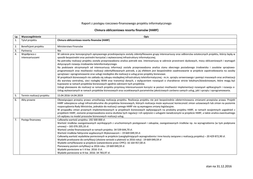 Raport z postępu rzeczowo-finansowego projektu informatycznego Chmura obliczeniowa resortu finansów (HARF) Lp. 1. Wyszczególnienie Tytuł projektu Chmura obliczeniowa resortu finansów (HARF) Opis 2. Beneficjent projektu Ministerstwo Finansów 3. 4. Partnerzy Współpraca z interesariuszami Nie W zakresie prac koncepcyjnych opisywanego przedsięwzięcia zostały zidentyfikowane grupy interesariuszy oraz odbiorców ostatecznych projektu, którzy będą w sposób bezpośredni oraz pośredni korzystać z wytworzonej infrastruktury informatycznej. Na potrzeby realizacji projektu została przeprowadzona analiza potrzeb ww. interesariuszy w zakresie przestrzeni dyskowych, mocy obliczeniowych i wymagań dotyczących rozwoju środowiska teleinformatycznego. Na podstawie otrzymanych od interesariuszy informacji została przeprowadzona analiza stanu obecnego posiadanego środowiska i zasobów sprzętowoprogramowych oraz możliwości realizacji zidentyfikowanych potrzeb, a jej efektem jest bezpośrednie zaadresowanie w projekcie zapotrzebowania na zasoby sprzętowe i oprogramowanie oraz usługi niezbędne dla realizacji e-usług przez projekty biznesowe. W projektach biznesowych nie zakłada się zakupu niezbędnej infrastruktury teleinformatycznej - m.in. sprzętu serwerowego i pamięci masowych oraz archiwizacji dla warstwy centralnej, sieci rozległej WAN oraz transmisji danych, z wyłączeniem rozwiązań o charakterze stricte lokalnym/dziedzinowym, które mogą być kupowane w ramach projektów biznesowych zgodnie zakresem tych projektów. Usługi planowane do realizacji w ramach projektu przyniosą interesariuszom korzyści w postaci możliwości implementacji rozwiązań aplikacyjnych i rozwoju eUsług wytwarzanych w ramach projektów biznesowych oraz oczekiwanych parametrów jakościowych zarówno samych usług, jaki i sprzętu i oprogramowania. 5. Termin realizacji projektu 15.04.2016-14.04.2019 6. Akty prawne 7. Postęp finansowy Obowiązujące przepisy prawa umożliwiają realizację projektu. Realizacja projektu nie jest bezpośrednio zdeterminowana zmianami przepisów prawa. Projekt HARF zabezpiecza usługi infrastrukturalne dla projektów biznesowych, których realizacja może wymuszać konieczność zmian ustawowych lub zmian na poziomie rozporządzenia Rady Ministrów, jednakże do realizacji samego HARF nie są wymagane zmiany legislacyjne. W przypadku zmian prawnych implementowanych w projektach biznesowych wpływających na produkty projektu HARF, w ramach wzajemnych uzgodnień z projektem HARF, zostanie przeprowadzona ocena skutków tych regulacji i ich spójności z usługami świadczonymi w projekcie HARF, a także analiza ewentualnego ich wpływu na model procesów biznesowych realizacji usług. Całkowita wartość projektu: 192 500 000 zł. Wartość środków zaangażowanych wynikających z uruchomionych postępowań i zakupów, zaangażowanych środków np. na wynagrodzenia (w tym podpisane umowy) – 165 076 205,33 zł. Wartość umów finansowanych w ramach projektu: 34 539 644,70 zł. Wartość środków faktycznie wypłaconych Wykonawcom – 19 669 049,59 zł. Całkowitą wartość wydatków poniesionych w projekcie (uwzględniających wynagrodzenia i inne koszty związane z realizacją projektu) – 20 429 872,90 zł. Wydatki przekazane do certyfikacji (złożone wnioski o płatność w 2016 roku) : 19 669 049,59 zł Wydatki certyfikowane w projekcie (zatwierdzone przez CPPC): 16 164 957,00 zł. Planowany poziom certyfikacji w 2016 roku: 19 669 049,59 zł. Wydatki poniesione w I i II kw. 2016: 0 zł. Wydatki poniesione w III kw. 2016: 34 783,97 zł. stan na 31.12.2016 8. Postęp rzeczowy Wydatki poniesione w IV kw. 2016: 20 395 088,93 zł. Kamień milowy Data OD Zadanie 1 2016-04-16 Rozbudowa Systemu transmisji danych U1 - Usługa anonimowego dostępu do Internetu U3 - Profilowana usługa dostępu do sieci transmisji danych resortu finansów U2 - Usługa dostępu z Internetu dla 2016-04-16 systemów centralnych U4 - Dedykowana usługa transmisji danych do zewnętrznych rejestrów, usług publicznych oraz usług replikacji DWDM Zadanie 2 Rozbudowa centralnej chmury obliczeniowej resortu finansów U5 - Usługa odtworzenia po katastrofie dla kluczowych usług elektronicznych resortu finansów (DR) U6 - Usługi migracji systemów do CPD MF 2016-04-16 2016-04-16 U7 - Usługa zintegrowanego środowiska teleinformatycznego dla nowych rozwiązań biznesowych Stan realizacji 2019-04-14 Zadanie realizowane zgodnie z harmonogramem. 2019-04-14 Realizacja, zgodnie z harmonogramem, umowy nr PN/13/12/VBC z dnia 23 listopada 2012r. w przedmiocie Świadczenie usługi transmisji danych w lokalizacjach resortu finansów oraz świadczenie usługi dostępu do Internetu A i B dla użytkowników w lokalizacjach resortu finansów. Opóźnienia w zawarciu umowy były spowodowane toczącą się sprawą przed Sądem Okręgowym w Lublinie. Ostatecznie umowa nr PN/16/15/VAD została zawarta w dniu 30 grudnia 2016r. w przedmiocie Świadczenia Usługi dostępu do Internetu dla systemów centralnych (U2) oraz Dedykowanej usługi transmisji danych do zewnętrznych rejestrów, usług publicznych oraz usług replikacji SWDM (U4). 2019-04-14 2016-11-10 2016-11-10 2019-01-29 Zadanie realizowane zgodnie z harmonogramem. 2019-01-02 Postępowanie zostało unieważnione w związku z wpływem ofert o wartości przewyższającej kwotę, którą Zamawiający zamierzał przeznaczyć na zadanie. Ogłoszenie zostało ponownie opublikowane 28 grudniu 2016r. Zadanie prowadzone jest w dwóch częściach. Pierwsza część obejmująca systemy niejawne obecnie jest na etapie aktualizacji SIWZ. Postępowanie zostało ogłoszone przez MF w dniu 05.02.2016r. Druga część w zakresie systemów jawnych została ogłoszona przez MF w dniu 27.10.2016r. Planowane termin otwarcia ofert: 04 styczeń 2017r. W zakresie U7 cz. I w dniu 22 grudnia 2016r wpłynęło odwołanie do KIO złożone przez Konsorcjum firm Asseco Data S