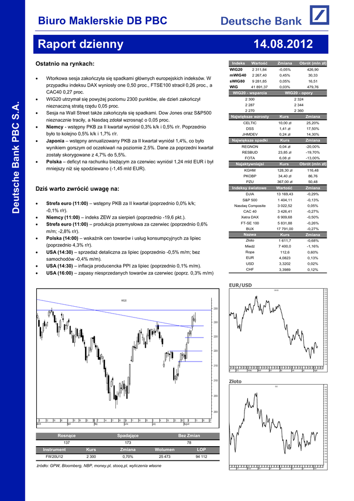 Biuro Maklerskie DB PBC ww Raport dzienny 14.08.2012 Ostatnio na rynkach: Deutsche Bank PBC S.A. Zmiana Obrót (mln zł) 2 311,84 -0,05% 426,90 mWIG40 2 267,40 0,45% 30,33 sWIG80 9 281,85 0,05% 16,51 WIG 41 891,37 0,03% 479,76 Indeks Wtorkowa sesja zakończyła się spadkami głównych europejskich indeksów. W przypadku indeksu DAX wyniosły one 0,50 proc., FTSE100 stracił 0,26 proc., a CAC40 0,27 proc. WIG20 utrzymał się powyżej poziomu 2300 punktów, ale dzień zakończył nieznaczną stratą rzędu 0,05 proc. Sesja na Wall Street także zakończyła się spadkami. Dow Jones oraz S&P500 nieznacznie traciły, a Nasdaq zdołał wzrosnąć o 0,05 proc. Niemcy - wstępny PKB za II kwartał wyniósł 0,3% k/k i 0,5% r/r. Poprzednio było to kolejno 0,5% k/k i 1,7% r/r. Japonia – wstępny annualizowany PKB za II kwartał wyniósł 1,4%, co było wynikiem gorszym od oczekiwań na poziomie 2,5%. Dane za poprzedni kwartał zostały skorygowane z 4,7% do 5,5%. Polska – deficyt na rachunku bieżącym za czerwiec wyniósł 1,24 mld EUR i był mniejszy niż się spodziewano (-1,45 mld EUR). WIG20 - wsparcia WIG20 - opory 2 300 2 324 2 287 2 344 2 270 Dziś warto zwrócić uwagę na: Wartość WIG20 Strefa euro (11:00) – wstępny PKB za II kwartał (poprzednio 0,0% k/k; -0,1% r/r). Niemcy (11:00) – indeks ZEW za sierpień (poprzednio -19,6 pkt.). Strefa euro (11:00) – produkcja przemysłowa za czerwiec (poprzednio 0,6% m/m; -2,8% r/r). Polska (14:00) – wskaźnik cen towarów i usług konsumpcyjnych za lipiec (poprzednio 4,3% r/r). USA (14:30) – sprzedaż detaliczna za lipiec (poprzednio -0,5% m/m; bez samochodów -0,4% m/m). USA (14:30) – inflacja producencka PPI za lipiec (poprzednio 0,1% m/m). USA (16:00) – zapasy niesprzedanych towarów za czerwiec (poprz. 0,3% m/m) 2 360 Największe wzrosty Kurs Zmiana CELTIC 10,00 zł 25,20% DSS 1,41 zł 17,50% JHMDEV 0,24 zł 14,30% Największe spadki Kurs Zmiana REGNON 0,04 zł -20,00% RESBUD 23,85 zł -19,70% FOTA 6,08 zł -13,00% Najaktywniejsi Kurs Obrót (mln zł) KGHM 128,30 zł 116,48 PKOBP 34,40 zł 86,76 PZU 367,00 zł 50,48 Indeksy światowe Wartość Zmiana DJIA 13 169,43 -0,29% S&P 500 1 404,11 -0,13% Nasdaq Composite 3 022,52 0,05% CAC 40 3 426,41 -0,27% Xetra DAX 6 909,68 -0,50% FT-SE 100 5 831,88 -0,26% BUX 17 791,00 -0,27% Nazwa Kurs Zmiana Złoto 1 611,7 -0,68% Miedź 7 400,0 -1,16% Ropa 112,6 0,60% EUR 4,0823 0,13% USD 3,3202 0,02% CHF 3,3989 0,12% EUR/USD 1.360 1.355 1.350 1.345 1.340 1.335 1.330 1.325 1.320 1.315 1.310 1.305 1.300 1.295 1.290 1.285 1.280 1.275 1.270 1.265 1.260 1.255 1.250 1.245 1.240 1.235 1.230 1.225 1.220 1.215 1.210 1.205 1.200 1.195 EUR/USD WIG20 2350 2300 2250 2200 2150 2100 12 19 26 2 9 16 23 30 6 13 20 27 5 12 19 26 2 9 16 23 30 7 14 21 28 4 11 18 25 2 9 16 23 30 6 13 20 27 December 2012 February March April May June July August Złoto GOLD 1810 1800 1790 1780 1770 1760 1750 1740 1730 1720 1710 1700 1690 1680 1670 1660 1650 1640 1630 1620 2050 2000 5 March 12 19 26 2 10 April 16 23 30 7 May 14 21 28 4 June 11 18 25 2 July 9 16 23 30 6 August 13 Rosnące Spadające Bez Zmian 137 173 78 20 27 1610 1600 1590 1580 1570 Instrument Kurs Zmiana Wolumen LOP FW20U12 2 300 0,70% 25 473 94 112 1560 1550 1540 1530 1520 1510 źródło: GPW, Bloomberg, NBP, money.pl, stooq.pl, wyliczenia własne 12 19 27 3 9 December 2012 16 23 30 6 13 20 27 5 12 19 26 2 9 February March April 16 23 30 7 May 14 21 28 4 11 18 25 2 9 June July 16 23 30 6 13 20 27 August Inwestorzy czekają na impuls S&P500 1440 Deutsche Bank PBC S.A. S&P500 Wtorkowa sesja zakończyła się spadkami głównych europejskich indeksów. W przypadku indeksu DAX wyniosły one 0,50 proc., FTSE100 stracił 0,26 proc., a CAC40 0,27 proc. WIG20 utrzymał się powyżej poziomu 2300 punktów, ale dzień zakończył nieznaczną stratą rzędu 0,05 proc. Wśród niewielu informacji jakie napłynęły wczoraj na rynki warty uwagi był raport Europejskiego Banku Centralnego z którego wynika, że ECB w ostatnim tygodniu nie kupował obligacji krajów strefy euro w ramach programu SMP (Securities Market Programme). Brak aktywności ECB był oczekiwany przez rynek, choć inwestorzy spodziewali się, że Mario Monti wznowi ten program w reakcji na rosnące rentowności obligacji Włoch i Hiszpanii. Dziś inwestorzy rozpoczną sesję w świetle wstępnych danych makroekonomicznych z Niemiec. W II kwartale 2012 roku tamtejsza gospodarka rozwijała się mocniej niż spodziewały się rynki. Produktu Krajowego Brutto Niemiec, po uwzględnieniu czynników sezonowych, wzrósł w okresie kwiecień-czerwiec br. o 0,3 proc. k/k. Rynek prognozował wzrost o 0,2 proc. w relacji kwartalnej, po tym jak kwartał wcześniej gospodarka zanotowała wzrost o 0,5 proc. Znacząco wyhamowała natomiast roczna dynamika wzrostu gospodarczego. W II kwartale PKB, bez uwzględnienia czynników sezonowych, wprawdzie dalej rósł, ale jedynie o 0,5 proc. r/r. To najgorszy wynik od ostatniego kwartału 2009 roku, gdy skurczył się on o 1,6 proc. r/r. Jutro giełda w Warszawie nie pracuje, stąd można się spodziewać niższych obrotów z powodu długiego weekendu. Z punktu widzenia oceny kondycji polskiej gospodarki ważna będzie publikacja krajowych danych o inflacji konsumenckiej. Jej spadek byłby czynnikiem, który otworzy Radzie Polityki Pieniężnej możliwość obniżek stóp procentowych w perspektywie najbliższych miesięcy. Warto jednak pamiętać, że perspektywa obniżek stóp procentowych obniży atrakcyjność polskich aktywów opartych na stopach procentowych, co potencjalnie może mieć negatywny wpływ na kurs złotego. 1430 1420 1410 1400 1390 1380 1370 1360 1350 1340 1330 1320 1310 1300 1290 1280 1270 1260 1250 1240 1230 1220 1210 1200 1190 12 19 27 3 9 17 23 30 6 13 21 27 5 12 19 26 2 9 16 23 30 7 14 21 29 4 11 18 25 2 9 16 23 30 6 13 20 27 December 2012 February March April May June July August mWIG 40 MWIG40 2600 2550 2500 2450 2400 2350 2300 2250 2200 2150 Recesj