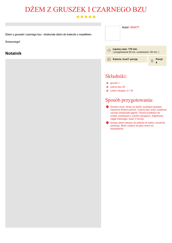 DŻEM Z GRUSZEK I CZARNEGO BZU Autor: 554477 Dżem z gruszek i czarnego bzu doskonały dżem do bułeczki z masełkiem. Smacznego! Łączny czas: 170 min. Notatnik ( przygotowanie 50 min. oczekiwanie 120 min. ) Kalorie: kcal/1 porcję Porcji: 8 Składniki: gruszki 1 czarny bez 30 cukier żelujący 3:1 35 Sposób przygotowania: Gruszki umyć, obrać ze skórki, wydrążyć gniazda nasienne drobno pokroić. Czarny bez umyć, przebrać usunąć niedojrzałe jagody. Owoce przełożyć do rondla, wymieszać z cukrem żelującym. Zagotować ciągle mieszając, dusić 3 minuty. Gorący dżem nałożyć do słoików do pełna, szczelnie zamknąć. Słoiki ustawić do góry dnem do wystudzenia.