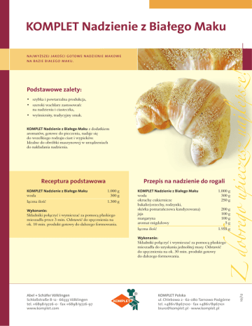 KOMPLET Nadzienie z Białego Maku NA JW YŻSZ EJ JA KOŚCI GOTOWE NADZI EN I E MAKOWE Podstawowe zalety: • szybka i powtarzalna produkcja, • szeroki wachlarz zastosowań: na nadzienia i ciasteczka, • wyśmienity, tradycyjny smak. KOMPLET Nadzienie z Białego Maku z dodatkiem aromatów, gotowe do pieczenia, nadaje się do wszelkiego rodzaju ciast i wypieków. Idealne do obróbki maszynowej w urządzeniach do nakładania nadzienia. Receptura podstawowa Przepis na nadzienie do rogali woda 1.000 g 300 g łączna ilość 1.300 g KOMPLET Nadzienie z Białego Maku dobrego upieczesz najlepsze! N A BA Z I E B I A Ł EGO MAKU. Wykonanie: Składniki połączyć i wymieszać za pomocą płaskiego mieszadła przez 3 min. Odstawić do spęcznienia na ok. 10 min. produkt gotowy do dalszego formowania. KOMPLET Nadzienie z Białego Maku woda okruchy cukiernicze bakalie(orzechy, rodzynki, skórka pomarańczowa kandyzowana) jaja margaryna aromat migdałowy łączna ilość Wykonanie: 1.000 g 300 g 250 g 200 g 100 g 100 g 5g 1.955 g Abel + Schäfer Völklingen Schloßstraße 8-12 · 66333 Völklingen tel. +6898/9726-0 · fax +6898/9726-97 www.komplet.com KOMPLET Polska ul. Chlebowa 2 · 62-080 Tarnowo Podgórne tel. +4861/8967100 · fax +4861/8967101 [email protected] · www.komplet.pl 10/12 Z Składniki połączyć i wymieszać za pomocą płaskiego mieszadła do uzyskania jednolitej masy. Odstawić do spęcznienia na ok. 30 min. produkt gotowy do dalszego formowania.