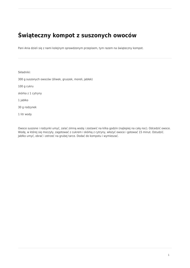 Świąteczny kompot z suszonych owoców Pani Ania dzieli się z nami kolejnym sprawdzonym przepisem, tym razem na świąteczny kompot. Składniki: 300 g suszonych owoców (śliwek, gruszek, moreli, jabłek) 100 g cukru skórka z 1 cytryny 1 jabłko 30 g rodzynek 1 litr wody Owoce suszone i rodzynki umyć, zalać zimną wodą i zostawić na kilka godzin (najlepiej na całą noc). Odcedzić owoce. Wodę, w której się moczyły, zagotować z cukrem i skórką z cytryny, włożyć owoce i gotować 15 minut. Ostudzić. Jabłko umyć, obrać i zetrzeć na grubej tarce. Dodać do kompotu i wymieszać. 1