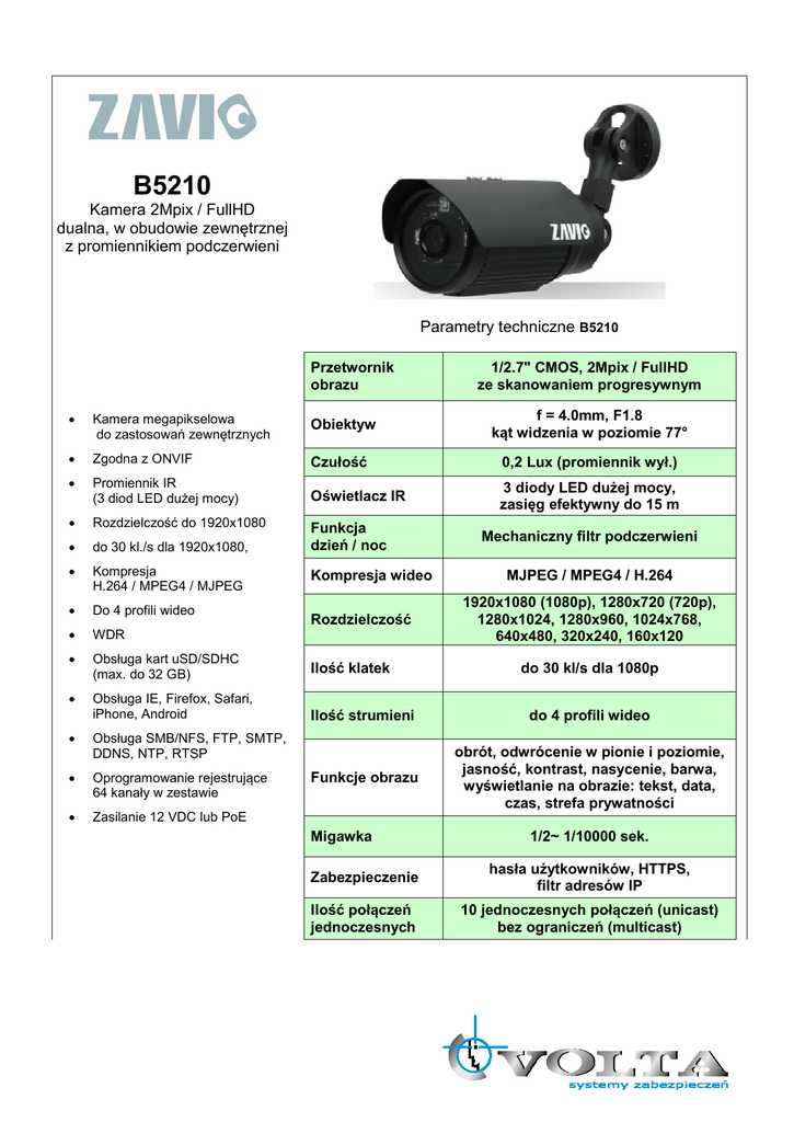 B5210 Kamera 2Mpix / FullHD dualna, w obudowie zewnętrznej z promiennikiem podczerwieni Parametry techniczne B5210 Przetwornik obrazu 1/2.7" CMOS, 2Mpix / FullHD ze skanowaniem progresywnym • Kamera megapikselowa do zastosowań zewnętrznych Obiektyw f = 4.0mm, F1.8 kąt widzenia w poziomie 77° • Zgodna z ONVIF Czułość 0,2 Lux (promiennik wył.) • Promiennik IR (3 diod LED dużej mocy) Oświetlacz IR 3 diody LED dużej mocy, zasięg efektywny do 15 m • Rozdzielczość do 1920x1080 • do 30 kl./s dla 1920x1080, • Kompresja H.264 / MPEG4 / MJPEG • Do 4 profili wideo • WDR • Obsługa kart uSD/SDHC (max. do 32 GB) Ilość klatek • Obsługa IE, Firefox, Safari, iPhone, Android Ilość strumieni do 4 profili wideo Funkcje obrazu obrót, odwrócenie w pionie i poziomie, jasność, kontrast, nasycenie, barwa, wyświetlanie na obrazie: tekst, data, czas, strefa prywatności • Obsługa SMB/NFS, FTP, SMTP, DDNS, NTP, RTSP • Oprogramowanie rejestrujące 64 kanały w zestawie • Zasilanie 12 VDC lub PoE Funkcja dzień / noc Kompresja wideo Rozdzielczość Migawka Mechaniczny filtr podczerwieni MJPEG / MPEG4 / H.264 1920x1080 (1080p), 1280x720 (720p), 1280x1024, 1280x960, 1024x768, 640x480, 320x240, 160x120 do 30 kl/s dla 1080p 1/2~ 1/10000 sek. Zabezpieczenie hasła użytkowników, HTTPS, filtr adresów IP Ilość połączeń jednoczesnych 10 jednoczesnych połączeń (unicast) bez ograniczeń (multicast) Zdarzenia alarmowe Reakcja na alarm Złącza Zasilanie Temperatura pracy detekcja ruchu, harmonogram zapis na dysk sieciowy (SMB), wysłanie wiadomości email (SMTP), wysyłanie plików na serwer FTP, powiadomienie na serwer HTTP aktywacja wyjścia alarmowego RJ-45 (Ethernet 10/100 Base-T), gniazdo zasilania (12VDC), przycisk Reset (ustawienia fabryczne), 12 VDC, 1A lub PoE (IEEE 802.3af) -10℃ ℃ ~ +50℃ ℃ Dołączone oprogramowanie Intelligent IP Installer (wyszukanie urządzenia, konfiguracja), CamGraba2.0 Surveillance Software (rejestracja do 64 kamer IP) Min. wymagania dla komputera klienckiego (przeglądarka www) Pentium 4 2.8 GHz (lub odpowiednik) karta graficzna min. 256MB, 2 GB pamięci RAM Windows 2000/2003/XP/Vista/7 Mac OS Leopard 10.5 (Safari) Protokoły sieciowe Bonjour, TCP/IP, DHCP, PPPoE, ARP, ICMP, FTP, SMTP, DNS, NTP, UPnP, RTSP, RTP, RTCP, HTTP, TCP, UDP, 3GPP/ISMA RTSP Wymiary 270 x 69(φ) mm Waga 0,9 kg