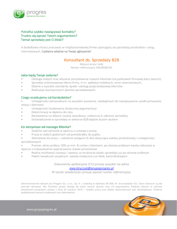 Potrafisz szybko nawiązywać kontakty? Trudno się oprzeć Twoim argumentom? Temat sprzedaży jest Ci bliski? A dodatkowo chcesz pracować w międzynarodowej firmie zajmującej się sprzedażą produktów i usług internetowych. Czekamy właśnie na Twoje zgłoszenie! Konsultant ds. Sprzedaży B2B Miejsce pracy: Łódź Numer referencyjny: KDS/B2B/LDZ Jakie będą Twoje zadania? • • • • Obsługa stałych oraz aktywne pozyskiwanie nowych klientów (na podstawie firmowej bazy danych) Sprzedaż zróżnicowanej oferty firmy, m.in. aplikacji mobilnych, stron internetowych, Dbanie o wysokie standardy opieki i obsługi posprzedażowej klientów Realizacja wyznaczonych planów sprzedażowych. Czego oczekujemy od Kandydatów? • Umiejętności personalnych na wysokim poziomie, niezbędnych do nawiązywania i podtrzymywania relacji z klientami • Umiejętności budowania skutecznej argumentacji • Determinacji w dążeniu do celu • Nastawienia na własny rozwój zawodowy, zwłaszcza w zakresie sprzedaży • Doświadczenie w sprzedaży w sektorze B2B będzie dużym atutem. Co otrzymasz od naszego Klienta? • Stabilne zatrudnienie w oparciu o umowę o pracę • Pracę w stałych godzinach od poniedziałku do piątku • Wdrożenie do pracy – szkolenie wstępne (5 dni) dotyczące wiedzy produktowej i umiejętności sprzedażowych • Premie: okres próbny 10% za min. 8 umów z klientami, po okresie próbnym kwoty naliczane w oparciu o indywidualnie wypracowane stawki procentowe • Realna możliwość rozwoju i awansu w strukturze działu sprzedaży już po okresie próbnym • Pakiet świadczeń socjalnych: opieka medyczna Lux Med, karta Multisport. Dokumenty aplikacyjne (CV) proszę wysyłać na adres [email protected] W tytule wiadomości proszę wpisać numer referencyjny. Administratorem danych jest Progres Sp. z o.o., Sp. K. z siedzibą w Gdańsku 80-309, Al. Grunwaldzka 411. Dane zbierane są dla potrzeb rekrutacji. Ma Pani/Pan prawo dostęp do treści swoich danych oraz ich poprawiania. Podanie danych w zakresie określonym przepisami ustawy z dnia 26 czerwca 1974 r. Kodeks pracy oraz aktów wykonawczych jest obowiązkowe. Podanie dodatkowych danych osobowych jest dobrowolne.