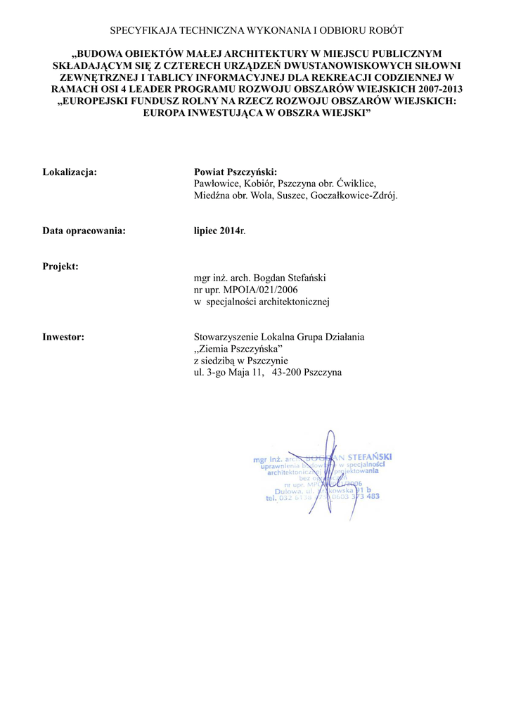 SPECYFIKAJA TECHNICZNA WYKONANIA I ODBIORU ROBÓT ,,BUDOWA OBIEKTÓW MAŁEJ ARCHITEKTURY W MIEJSCU PUBLICZNYM SKŁADAJĄCYM SIĘ Z CZTERECH URZĄDZEŃ DWUSTANOWISKOWYCH SIŁOWNI ZEWNĘTRZNEJ I TABLICY INFORMACYJNEJ DLA REKREACJI CODZIENNEJ W RAMACH OSI 4 LEADER PROGRAMU ROZWOJU OBSZARÓW WIEJSKICH 2007-2013 ,,EUROPEJSKI FUNDUSZ ROLNY NA RZECZ ROZWOJU OBSZARÓW WIEJSKICH: EUROPA INWESTUJĄCA W OBSZRA WIEJSKI” Lokalizacja: Powiat Pszczyński: Pawłowice, Kobiór, Pszczyna obr. Ćwiklice, Miedźna obr. Wola, Suszec, Goczałkowice-Zdrój. Data opracowania: lipiec 2014r. Projekt: mgr inż. arch. Bogdan Stefański nr upr. MPOIA/021/2006 w specjalności architektonicznej Inwestor: Stowarzyszenie Lokalna Grupa Działania ,,Ziemia Pszczyńska” z siedzibą w Pszczynie ul. 3-go Maja 11, 43-200 Pszczyna Opis przedmiotu zamówienia wg Wspólnego Słownika Zamówień (CPV): 45212140-9 Obiekty rekreacyjne 45112710-5 Roboty w zakresie kształtowania terenów zielonych 45111200-0 Roboty w zakresie przygotowania terenu pod budowę i roboty ziemne SPIS TREŚCI 1. WYMAGANIA OGÓLNE 2. MONTAŻ URZADZEŃ 1. WYMAGANIA OGÓLNE 1.1.Przedmiot specyfikacji Przedmiotem niniejszej specyfikacji technicznej są wymagania ogólne dotyczące wykonania i odbioru robót związanych z montażem urządzeń sportoworekreacyjnych siłowni zewnętrznych. Inwestycja zlokalizowana jest w 6 wybranych lokalizacjach Powiatu Pszczyńskiego. 1.2.Zakres stosowania specyfikacji Specyfikacja techniczna wykonania i odbioru robót (STWiOR) stosowana jest jako dokument przetargowy i kontraktowy przy zlecaniu i realizacji robót. 1.3.Określenia podstawowe Użyte w specyfikacji technicznej wymienione poniżej określenia należy rozumieć w każdym przypadku następująco: Kierownik – osoba wyznaczona przez Wykonawcę, upoważniona do kierowania robotami. Polecenie Inwestora (IN)– wszelkie polecenia przekazane Wykonawcy przez IN, w formie pisemnej, dotyczące sposobu realizacji robót lub innych spraw związanych z prowadzeniem prac. Projektant – osoba prawna lub fizyczna będąca autorem dokumentacji projektowej uprawniona do wprowadzania zmian projektowych. Dokumentacja przetargowa– część dokumentacji projektowej, która wskazuje lokalizację, charakterystykę i wymiary obiektu będącego przedmiotem robót. Podłoże – grunt rodzimy lub nasypowy, leżący pod powierzchnią do głębokości przemarzania. STWiOR = ST – Specyfikacja Techniczna Wykonania i Odbioru Robót. 1.4. Ogólne wymagania dotyczące robót Wykonawca robót jest odpowiedzialny za jakość ich wykonania oraz za ich zgodność z dokumentacja projektową, Specyfikacją i poleceniami IN. 1.4.1.Zgodność robót z dokumentacją projektową i specyfikacją techniczną Dokumentacja projektowa, specyfikacja techniczna oraz dodatkowe dokumenty przekazane przez IN Wykonawcy stanowią część umowy, a wymagania szczegółowe w choćby jednym z nich są obowiązujące dla Wykonawcy tak jakby zawarte były w całej dokumentacji. Wykonawca nie może wykorzystywać błędów lub opuszczeń w dokumentach kontraktowych, a o ich wykryciu winien natychmiast powiadomić IN, który dokona odpowiednich zmian i poprawek. W przypadku rozbieżności opis wymiarów ważniejszy jest od odczytu ze skali rysunków. Wszystkie wykonane roboty i dostarczone materiały muszą być zgodne z dokumentacją projektową i specyfikacja techniczną. W przypadku, gdy materiały lub roboty nie będą w pełni zgodne z dokumentacją projektową lub specyfikacją techniczną i wpłynie to na niezadowalającą jakość urządzeń, to takie materiały zostaną zastąpione innymi, a roboty rozebrane i wykonane ponownie na koszt Wykonawcy. Dopuszczalne jest użycie tylko takich urządzeń jak opisane w projekcie lub równoważnych, porównywalnych, lepszych, opisane strefy bezpieczeństwa poszczególnych urządzeń muszą być uwzględnione i zachowane podczas montażu odrębnie dla każdego urządzenia. 1.4.2.Zabezpieczenie terenu prac a) Wykonawca jest zobowiązany do zabezpieczenia terenu budowy w okresie trwania realizacji kontraktu aż do zakończenia i odbioru ostatecznego robót. b) Zabezpieczenie drzew: Nie dopuszcza się: - składowania materiałów w obrębie systemu korzeniowego, - długotrwałego odkrywania korzeni bez zabezpieczenia, - wbijania jakichkolwiek elementów w pnie, prowadzenia robót wymagających otwartego ognia w pobliżu roślin, - usytuowania budynków tymczasowych w zasięgu korony drzew. Sposoby prawidłowego zabezpieczenia pnia drzewa (do wyboru): - deskami i elementami gumowymi, amortyzującymi uderzenia; - deskowanie skrzyniowe wiązane do drzewa za pomocą powrozów - słomą oraz jutą. Wysokość zabezpieczenia pnia powinna sięgać pierwszych gałęzi. Sposoby prawidłowego zabezpieczenia korony drzewa: - podwiązanie gałęzi narażonych na uszkodzenia, - wykonanie cięć redukujących rozmiar korony zgodnie z normami obowiązującymi w chirurgii drzew. Wszystkie prace w obrębie systemu korzeniowego w tym: - wymiana górnej warstwy gleby, - kształtowanie podbudowy, - zmiana nawierzchni powinny zostać wykonane ręcznie w obrębie rzutu korony drzew. Odsłonięta w tym czasie powierzchnia zasięgu korzeni powinna zostać przykryta wilgotną jutą lub matami słomianymi do czasu zakończenia prac. Koszt zabezpieczenia terenu budowy nie podlega odrębnej zapłacie i przyjmuje się, że jest włączony w cenę umowną. 1.4.4.Ochrona środowiska w czasie wykonywania robót Wykonawca ma obowiązek znać i stosować w czasie prowadzenia robót wszelkie przepisy dotyczące ochrony środowiska naturalnego. W okresie trwania prac Wykonawca będzie: - utrzymywać teren prac i wykopy w stanie bez wody stojącej, - podejmować wszelkie uzasadnione kroki mające na celu stosowanie się do przepisów i norm dotyczących ochrony środowiska na terenie i wokół terenu budowy oraz będzie unikać uszkodzeń lub uciążliwości dla osób lub własności społecznej i innych,