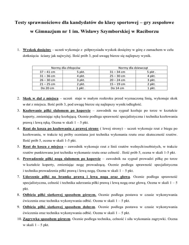 Testy sprawnościowe dla kandydatów do klasy sportowej – gry zespołowe w Gimnazjum nr 1 im. Wisławy Szymborskiej w Raciborzu 1. Wyskok dosiężny – uczeń wykonuje z półprzysiadu wyskok dosiężny w górę z zamachem w celu dotknięcia ściany jak najwyżej. Ilość prób 3, pod uwagę bierze się najlepszy wynik. Normy dla chłopców 37 – 41 cm 5 pkt. 31 – 36 cm 4 pkt. 26 – 30 cm 3 pkt. 21 – 25 cm 2 pkt. Do 20 cm 1 pkt . Normy dla dziewcząt 31 – 34 cm 5 pkt . 25 – 30 cm 4 pkt. 20 – 24 cm 3 pkt. 15 – 19 cm 2 pkt. Do 14 cm 1 pkt. 2. Skok w dal z miejsca – uczeń staje w małym rozkroku przed wyznaczoną linią, wykonuje skok w dal z miejsca. Ilość prób 3, pod uwagę bierze się najlepszy wynik/odległość. 3. Kozłowanie piłki slalomem po kopercie – zawodnik na sygnał kozłuje po torze w kształcie koperty, zmieniając rękę kozłującą. Ocenie podlega sprawność specjalistyczna i technika kozłowania prawą i lewą ręką. Ocena w skali 1 – 5 pkt. 4. Rzut do kosza po kozłowaniu z prawej strony ( lewej strony) – uczeń wykonuje rzut z biegu po kozłowaniu, w trakcie tej próby oceniana jest technika wykonania rzutu oraz skuteczność rzutów. Ilość prób 5, ocena w skali 1-5 pkt. 5. Rzut do kosza z miejsca – zawodnik wykonuje rzut z linii rzutów wolnych/osobistych, w trakcie rzutów punktowana jest technika wykonanie rzutu oraz celność . Ilość prób 5, ocena w skali 1-5 pkt. 6. Prowadzenie piłki nogą slalomem po kopercie – zawodnik na sygnał prowadzi piłkę po torze w kształcie koperty, zmieniając nogę prowadzącą. Ocenie podlega sprawność specjalistyczna i technika prowadzenia piłki prawą i lewą nogą. Ocena w skali 1 – 5 pkt. 7. Uderzenie piłki na bramkę prawą i lewą nogą oraz głową. Ocenie podlega sprawność specjalistyczna, celność i technika uderzania piłki prawą i lewą nogą oraz głową. Ocena w skali 1 – 5 pkt. 8. Odbicia piłki siatkowej sposobem górnym. Ocenie podlega postawa w czasie wykonywania ćwiczenia oraz technika wykonywania odbić. Ocena w skali 1 – 5 pkt. 9. Odbicia piłki siatkowej sposobem dolnym. Ocenie podlega postawa w czasie wykonywania ćwiczenia oraz technika wykonywania odbić. Ocena w skali 1 – 5 pkt. 10. Zagrywka sposobem górnym. Ocenie podlega technika, celność i siła wykonania zagrywki. Ocena w skali 1 – 5 pkt.
