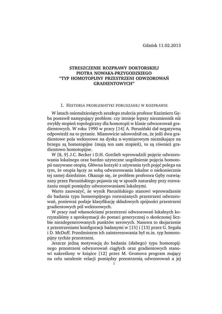 Gdańsk 11.02.2013 STRESZCZENIE ROZPRAWY DOKTORSKIEJ PIOTRA NOWAKA-PRZYGODZKIEGO ”TYP HOMOTOPIJNY PRZESTRZENI ODWZOROWAŃ GRADIENTOWYCH” 1. H ISTORIA PROBLEMATYKI PORUSZANEJ W ROZPRAWIE W latach osiemdziesiatych ˛ zeszłego stulecia profesor Kazimierz G˛eba postawił nast˛epujacy ˛ problem: czy istnieje lepszy niezmiennik niż zwykły stopień topologiczny dla homotopii w klasie odwzorowań gradientowych. W roku 1990 w pracy [14] A. Parusiński dał negatywna˛ odpowiedź na to pytanie. Mianowicie udowodnił on, że jeśli dwa gradientowe pola wektorowe na dysku n-wymiarowym nieznikajace ˛ na brzegu sa˛ homotopijne (maja˛ ten sam stopień), to sa˛ również gradientowo homotopijne. W [8, 9] J.C. Becker i D.H. Gottlieb wprowadzili poj˛ecie odwzorowania lokalnego oraz bardzo użyteczne uogólnienie poj˛ecia homotopii nazywane otopia. ˛ Główna korzyść z używania tych poj˛eć polega na tym, że otopia łaczy ˛ ze soba˛ odwzorowania lokalne o niekoniecznie tej samej dziedzinie. Okazuje si˛e, że problem profesora G˛eby rozwia˛ zany przez Parusińskiego pojawia si˛e w sposób naturalny przy rozważaniu otopii pomi˛edzy odwzorowaniami lokalnymi. Warto zauważyć, że wynik Parusińskiego stanowi wprowadzenie do badania typu homotopijnego rozważanych przestrzeni odwzorowań, ponieważ podaje klasyfikacj˛e składowych spójności przestrzeni gradientowych pól wektorowych. W pracy nad własnościami przestrzeni odwzorowań lokalnych korzystaliśmy z aproksymacji do postaci generycznej o skończonej liczbie niezdegenerowanych punktów zerowych. Nasuwa to skojarzenie z przestrzeniami konfiguracji badanymi w [15] i [13] przez G. Segala i D. McDuff. Przedmiotem ich zainteresowania był m.in. typ homotopijny tychże przestrzeni. Jeszcze jedna˛ motywacja˛ do badania (słabego) typu homotopijnego przestrzeni odwzorowań ciagłych ˛ oraz gradientowych stanowi nakreślony w ksiażce ˛ [12] przez M. Gromova program majacy ˛ na celu ustalenie relacji pomi˛edzy przestrzenia˛ odwzorowań a jej 1 2 podprzestrzeniami określonymi warunkami zadanymi za pomoca˛ pochodnych czastkowych. ˛ W szczególności gradientowość można wyrazić za pomoca˛ warunku Schwarza. Warto wspomnieć, że w pracy [1] autorzy zdefiniowali stopień topologiczny w przypadku ciagłym ˛ i gradientowym dla lokalnych odwzorowań G-współzmiennicznych. W niniejszym streszczeniu rozdział drugi składa si˛e z dwóch cz˛eści tematycznych. Każda cz˛eść omawia dwa artykuły, w sumie cztery (trzy opublikowane, jeden zaakceptowany), których dotyczy moja rozprawa. Natomiast w trzecim rodziale sa˛ krótko opisane dwa artykuły znajdujace ˛ si˛e jeszcze w recenzji, które stanowia˛ kontynuacj˛e wcześniejszych badań. W rozdziale tym wspominam również o otwartych pytaniach zwiazanych ˛ z rozważana˛ tematyka. ˛ Wszystkie omawiane artykuły powstały w wyniku współpracy z dr. Piotrem Bartłomiejczykiem. Chciałbym tu również podzi˛ekować za opiek˛e naukowa˛ mojemu promotorowi dr. hab. Grzegorzowi Graffowi, prof. nadzw. PG. 2. O MÓWIENIE WYNIKÓW PRAC SKŁADAJACYCH ˛ SI E˛ NA ROZPRAW E˛ 2.1. Gradientowe pola wektorowe na dysku. Wspomniane wcześniej twierdzenie Parusińskiego można również sformułować w nast˛epujacy ˛ sposób: inkluzja przestrzeni gradientowych pól wektorowych w przestrzeń wszystkich ciagłych ˛ pól wektorowych określonych na dysku Dn nieznikajacych ˛ na S n−1 indukuje bijekcj˛e pomi˛edzy zbiorami składowych spójności tych przestrzeni funkcyjnych. Oryginalny dowód twierdzenia Parusińskiego opiera si˛e na indukcji ze wzgl˛edu na wymiar dysku. W wymiarze n = 2 mamy dwa przypadki stopnia równego i różnego od 1. Trudniejszy jest ten pierwszy przypadek, w którym Parusiński pokazał, że każde pole gradientowe jest gradientowo homotopijne z identycznościa˛ lub minus identycznościa. ˛ W pracy [4] udało nam si˛e uzupełnić niewielka˛ luk˛e pokazujac ˛ (dwiema różnymi metodami), że identyczność i minus identyczność sa˛ również gradientowo homotopijne. Nasza praca zawiera pełny dowód przypadku n = 2 kładacy ˛ nacisk na przedstawienie geometrycznych aspektów rozumowania. W kolejnej pracy [5] rozwijamy te geometryczne idee, co pozwala nam wzmocnić wynik dla n = 2. Mianowicie wspomniana inkluzja jest faktycznie homotopijna˛ równoważnościa. ˛ Wyprowadzamy stad ˛ 3 wniosek, że obie przestrzenie pól wektorowych (gradientowych i cia˛ głych) sa˛ homotopijnie równoważne S 1 . Dokładnie rzecz ujmujac ˛ zostało to udowodnione w [14] dla przypadku stopnia różnego od 1. Nam si˛e udało przeprowadzić dowód w przypadku stopnia równego 1, który to przypadek okazał si˛e o wiele trudniejszy. 2.2. Gradientowe odwzorowania lokalne. Pytanie profesora G˛eby, którym zajał ˛ si˛e Parusiński, można postawić w odniesieniu do przestrzeni odwzorowań lokalnych: czy dwa gradientowe odzorowania lokalne o tym samym stopniu sa˛ gradientowo otopijne? Przypomnijmy, że odwzorowanie lokalne f : U ⊂ Rn → Rn nazywamy właściwym, jeśli przeciwobraz f każdego zbioru zwartego jest zwarty. Wprowadźmy nast˛epujace ˛ oznaczenia w wymiarze n: • F[n] – klasy otopii odwzorowań lokalnych, • F∇ [n] – klasy gradientowych otopii gradientowych odwzorowań lokalnych, • P[n] – klasy właściwych otopii właściwych odwzorowań lokalnych, • P∇ [n] – klasy właściwych gradientowych otopii właściwych gradientowych odwzorowań lokalnych. Odpowiednie inkluzje indukuja˛ nast˛epujacy ˛ diagram: a P∇ [n] −−−→ P[n] c by y d F∇ [n] −−−→ F[n]. Wprowadzenie przestrzeni właściwych odwzorowań lokalnych jest uzasadnione tym, że przetrzeń ta jest wyposażona w ładna, ˛ metryczna˛ topologi˛e (patrz [9]). W [2] pokazaliśmy, że funkcje a i b sa˛ surjekcjami, natomiast funkcje c i d sa˛ bijekcjami. Główna trudność polegała tutaj na udowodnieniu wersji twierdzenia Hopfa dla deg : F∇