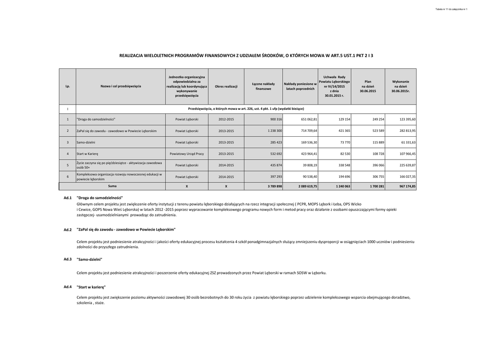 Tabela nr 11 do załącznika nr 1 REALIZACJA WIELOLETNICH PROGRAMÓW FINANSOWYCH Z UDZIAŁEM ŚRODKÓW, O KTÓRYCH MOWA W ART.5 UST.1 PKT 2 I 3 Lp. Nazwa i cel przedsięwzięcia Jednostka organizacyjna odpowiedzialna za realizację lub koordynująca wykonywanie przedsięwzięcia Okres realizacji Łączne nakłady finansowe Nakłady poniesione w latach poprzednich Uchwała Rady Powiatu Lęborskiego nr IV/14/2015 z dnia 30.01.2015 r. Plan na dzień 30.06.2015 Wykonanie na dzień 30.06.2015r. Przedsięwzięcia, o których mowa w art. 226, ust. 4 pkt. 1 ufp (wydatki bieżące) I 1 "Droga do samodzielności" Powiat Lęborski 2012-2015 900 316 651 062,81 129 154 249 254 123 395,60 2 ZaPal się do zawodu - zawodowo w Powiecie Lęborskim Powiat Lęborski 2013-2015 1 238 300 714 709,64 421 365 523 589 282 813,95 3 Samo-dzielni Powiat Lęborski 2013-2015 285 423 169 536,30 73 770 115 889 61 331,63 4 Start w Karierę Powiatowy Urząd Pracy 2013-2015 532 692 423 964,41 82 530 108 728 107 966,45 5 Życie zaczyna się po pięćdziesiątce - aktywizacja zawodowa osób 50+ Powiat Lęborski 2014-2015 435 874 39 808,19 338 548 396 066 225 639,87 6 Kompleksowa organizacja rozwoju nowoczesnej edukacji w powiecie lęborskim Powiat Lęborski 2014-2015 397 293 90 538,40 194 696 306 755 166 027,35 X X 3 789 898 2 089 619,75 1 240 063 1 700 281 967 174,85 Suma Ad.1 "Droga do samodzielności" Głównym celem projektu jest zwiększenie oferty instytucji z terenu powiatu lęborskiego działających na rzecz integracji społecznej ( PCPR, MOPS Lębork i Łeba, OPS Wicko i Cewice, GOPS Nowa Wieś Lęborska) w latach 2012 -2015 poprzez wypracowanie kompleksowego programu nowych form i metod pracy oraz działanie z osobami opuszczającymi formy opieki zastępczej- usamodzielnianymi prowadząc do zatrudnienia. Ad.2 "ZaPal się do zawodu - zawodowo w Powiecie Lęborskim" Celem projektu jest podniesienie atrakcyjności i jakości oferty edukacyjnej procesu kształcenia 4 szkół ponadgimnazjalnych służący zmniejszeniu dysproporcji w osiągnięciach 1000 uczniów i podniesieniu zdolności do przyszłego zatrudnienia. Ad.3 "Samo-dzielni" Celem projektu jest podniesienie atrakcyjności i poszerzenie oferty edukacyjnej ZSZ prowadzonych przez Powiat Lęborski w ramach SOSW w Lęborku. Ad.4 "Start w karierę" Celem projektu jest zwiększenie poziomu aktywności zawodowej 30 osób bezrobotnych do 30 roku życia z powiatu lęborskiego poprzez udzielenie kompleksowego wsparcia obejmującego doradztwo, szkolenia , staże. Tabela nr 11 do załącznika nr 1 Ad.5 Życie zaczyna się po pięćdziesiątce - aktywizacja zawodowa osób 50+ Głównym celem projektu jest zaktywizowanie grupy 30 osób zamieszkujących w powiecie lęborskim pozostających bez zatrudnienia pow. 50 roku życia, w tym co najmniej 30% osób w wieku 55 lat i więcej zgodnie z indywidualnymi predyspozycjami z uwzględnieniem panujących tendencji na lokalnym rynku pracy oraz podjęcia zatrudnienia. Ad.6 Kompleksowa organizacja rozwoju nowoczesnej edukacji w powiecie lęborskim Głównym celem projektu jest poprawa jakości doskonalenia nauczycieli, spójnego z rozwojem szkół w konsekwencji wdrożenia w powiecie lęborskim do 31.07.2015 r. nowego systemu doskonalenia nauczycieli i zewnętrznego wspomagania Lp. Nazwa i cel przedsięwzięcia Jednostka organizacyjna odpowiedzialna za realizację lub koordynująca wykonywanie przedsięwzięcia Okres realizacji Łączne nakłady finansowe Nakłady poniesione w latach poprzednich Uchwała Rady Powiatu Lęborskiego nr IV/14/2015 z dnia 30.01.2015 r. Plan na dzień 30.06.2015 Wykonanie na dzień 30.06.2015r. Przedsięwzięcia, o których mowa w art. 226, ust. 4 pkt. 1 ufp (wydatki majątkowe) II 1 ZaPal się do zawodu w Powiecie Lęborskim Powiat Lęborski 2013-2015 548 000 486 439,46 8 000 61 562 60 927,21 2 Samo-dzielni Powiat Lęborski 2013-2015 13 409 13 407,00 0 0 0,00 X X 561 409 499 846,46 8 000 61 562 60 927,21 Suma Ad.1 "ZaPal się do zawodu - zawodowo w Powiecie Lęborskim" Celem projektu jest podniesienie atrakcyjności i jakości oferty edukacyjnej procesu kształcenia 4 szkół ponadgimnazjalnych służący zmniejszeniu dysproporcji w osiągnięciach 1000 uczniów i podniesieniu zdolności do przyszłego zatrudnienia. Ad.2 "Samo-dzielni" Celem projektu jest podniesienie atrakcyjności i poszerzenie oferty edukacyjnej ZSZ prowadzonych przez Powiat Lęborski w ramach SOSW w Lęborku.