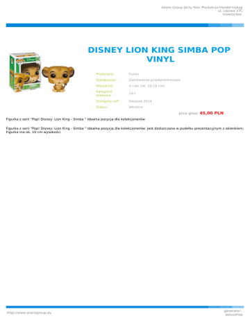 Aliens Group Jerzy Stec Produkcja-Handel-Usługi ul. Lipowa 17C Inowrocław DISNEY LION KING SIMBA POP VINYL Producent: Funko Dostępność: Zamówienie przedpremierowe Wysokość: 4 cale (ok. 10,16 cm) Kategoria wiekowa: 14+ Dostępny od*: listopad 2014 Status: Wkrótce price gross: 45,00 PLN Figurka z serii "Pop! Disney: Lion King - Simba " Idealna pozycja dla kolekcjonerów. Figurka z serii "Pop! Disney: Lion King - Simba " Idealna pozycja dla kolekcjonerów. Jest dostarczana w pudełku prezentacyjnym z okienkiem. Figurka ma ok. 10 cm wysokości http://www.aliensgroup.eu generator: aptusshop
