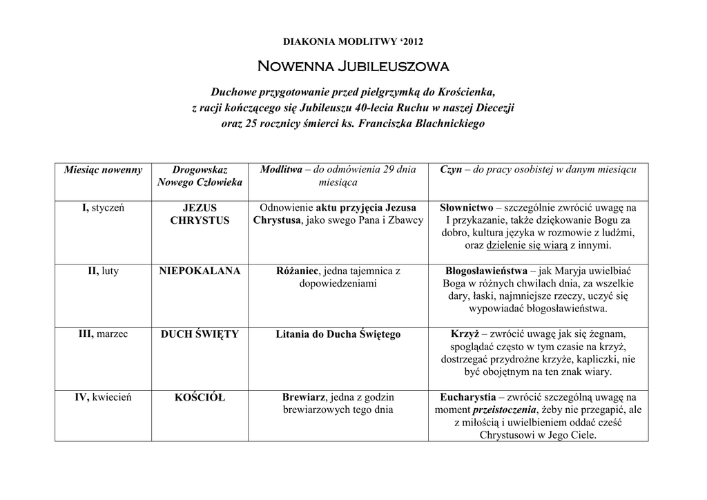 DIAKONIA MODLITWY ‘2012 Nowenna Jubileuszowa Duchowe przygotowanie przed pielgrzymką do Krościenka, z racji kończącego się Jubileuszu 40-lecia Ruchu w naszej Diecezji oraz 25 rocznicy śmierci ks. Franciszka Blachnickiego Miesiąc nowenny Drogowskaz Nowego Człowieka Modlitwa – do odmówienia 29 dnia miesiąca Czyn – do pracy osobistej w danym miesiącu I, styczeń JEZUS CHRYSTUS Odnowienie aktu przyjęcia Jezusa Chrystusa, jako swego Pana i Zbawcy Słownictwo – szczególnie zwrócić uwagę na I przykazanie, także dziękowanie Bogu za dobro, kultura języka w rozmowie z ludźmi, oraz dzielenie się wiarą z innymi. II, luty NIEPOKALANA Różaniec, jedna tajemnica z dopowiedzeniami Błogosławieństwa – jak Maryja uwielbiać Boga w różnych chwilach dnia, za wszelkie dary, łaski, najmniejsze rzeczy, uczyć się wypowiadać błogosławieństwa. III, marzec DUCH ŚWIĘTY Litania do Ducha Świętego Krzyż – zwrócić uwagę jak się żegnam, spoglądać często w tym czasie na krzyż, dostrzegać przydrożne krzyże, kapliczki, nie być obojętnym na ten znak wiary. IV, kwiecień KOŚCIÓŁ Brewiarz, jedna z godzin brewiarzowych tego dnia Eucharystia – zwrócić szczególną uwagę na moment przeistoczenia, żeby nie przegapić, ale z miłością i uwielbieniem oddać cześć Chrystusowi w Jego Ciele. V, maj SŁOWO BOŻE Namiot Spotkania wg Ps 23 Eucharystia – skupić się na Liturgii Słowa, spróbować zapamiętać jakieś słowo i ponieść je w dzień, często powtarzając, modląc się nim w ten sposób. VI, czerwiec MODLITWA Adoracja Najświętszego Sakramentu Zniewolenia – rozeznać, jakie mam i powierzać je z ufnością Panu; zwrócić uwagę na codzienną praktykę rachunku sumienia i stałą spowiedź jako narzędzie w drodze do życia w wolności. VII, lipiec LITURGIA Msza św. w intencji beatyfikacji ks. Franciszka Blachnickiego Moja wartość – dostrzec wszelkie dobro w sobie, talenty, zdolności itd. oraz zobaczyć na ile się nimi dzielę czy może zatrzymuję tylko dla siebie? VIII, sierpień ŚWIADECTWO i NOWA KULTURA Modlitwa KWC Świadectwo – zobaczyć źródła, z których czerpię, czym się karmię: TV, Internet, też pokarm w sensie jedzenie, jakie i ile? Nowa kultura – strój jaki noszę: na Eucharystię, w pracy lub inne spotkania z ludźmi, czy jest dostosowany? IX, wrzesień AGAPE Msza św. przy grobie Sługi Bożego ks. Franciszka Blachnickiego Agapa – po Mszy św. w Krościenku, lub u siebie w grupie w parafii lub po prostu zaproszenie kogoś i przeżycie agapy, choćby wypicie herbaty z drugą osobą w duchu miłości chrześcijańskiej. Pielgrzymka do Krościenka Schemat modlitwy jubileuszowej: 1. W ciągu miesiąca - Czyn, wg podanych propozycji, jako praca osobista. 2. 29 dnia, każdego miesiąca - Drogowskaz Nowego Człowieka z tekstem ks. F. Blachnickiego, jako zamyślenie; - Modlitwa, wg zaproponowanej formy tego dnia; - Modlitwa o cud, jako warunek potrzebny do beatyfikacji Sługi Bożego ks. F. Blachnickiego. DROGOWSKAZY Nowego Człowieka z tekstami ks. Franciszka Blachnickiego I. JEZUS CHRYSTUS jest moim Światłem i Życiem oraz jedyną Drogą do Ojca; Przyjąłem Go jako mojego Pana i Zbawiciela; oddaję Mu swoje życie, aby nim kierował. Całe życie Chrystusa jest proegzystencją tj. „istnieniem dla”. Chrystus istnieje dla Ojca, w oddaniu się Ojcu, istnieje w relacji do Ojca jako Syn, który miłuje Ojca, pełni Jego wolę i czyni to wszystko, co się Ojcu podoba. W proegzystencji jest Chrystus jako Syn Boży w pełni wolny. [PKW, 30] Wolność Chrystusa objawia się wtedy, kiedy konając na krzyżu mówi: „Ojcze w Twoje ręce powierzam ducha mojego” (Łk 23, 46). (…) Wyraża się w tym, że z miłości oddaje Ojcu siebie, oddaje swoje życie z miłości ku nam. [PKW, 34] Kiedy (…) przyszedł oczekiwany Mesjasz, Żydzi nie chcieli Go przyjąć, bo spodziewali się raczej króla, który będzie panował, a oni wraz z nim. Tymczasem przychodzi Sługa cichy, pokorny. [HONŻ I, 43] Chrystus nie jest dla wybranych, dla jakiejś arystokracji duchowej. On przyszedł zbawić wszystkich ludzi, a najwięcej kocha tych, którzy najbardziej potrzebują Jego pomocy. On nachyla się nad tymi, którzy są najbardziej chorzy, pragnie pomóc tym, którzy najbardziej są od Niego oddaleni. Przychodzi leczyć, wyzwalać, podnosić i ratować. [Now. III, 24] Nie ma takiego stanu, takiego skomplikowania, którego Chrystus nie mógłby zmienić. [RE, 76] II. NIEPOKALANA jest dla mnie najdoskonalszym wzorem Nowego Człowieka oddanego całkowicie w Duchu Świętym Chrystusowi, Jego słowu i dziełu; dlatego oddaję się Jej, rozważam z Nią w Różańcu tajemnice zbawienia i naśladuję Ją. Wprawdzie Maryja była zachowana od grzechu pierworodnego i od jego skutków, ale dobrze wiedziała o tym, że to nie jest Jej zasługa, że to jest łaska, którą otrzymała. Dlatego uwielbia Boga swego Zbawiciela. Nie staje przed Nim w poczuciu swojej niewinności i świętości, ale wielbi Go za to, że wejrzał na niskość swojej Służebnicy. Maryja ukazuje nam prawo dziania Bożego: Bóg strąca mocarzy z tronu, sytych i bogatych odrzuca, natomiast podnosi tych, którzy są ubodzy, opuszczeni, słabi. [SzM VI, 20] Maryja jest dla nas przykładem, jak i my powinniśmy swoje życie i wszystkie wydarzenia, których jesteśmy uczestnikami, przeżywać w świetle wielkiej, świętej historii zbawienia, w świetle Bożych planów zbawienia. [SzM IX, 11] Jeżeli mówimy o oddaniu się Maryi, o oddaniu się Niepokalanej, to jest to pewien skrót myślowy, bo trzeba zawsze dopowiadać: oddanie się z Niepokalaną, przez Nią, w zjednoczeniu z Nią, na Jej podobieństwo – Chrystusowi. Ona tylko po prostu jest pomocą do tego, żebyśmy na Jej podobieństwo pełniej oddali się Chrystusowi. [RWKChS, 51-52] III. DUCH SWIĘTY namaścił Jezusa; dzięki Chrystusowi i ja otrzymałem Ducha Świętego, który sprawił, że narodziłem się n