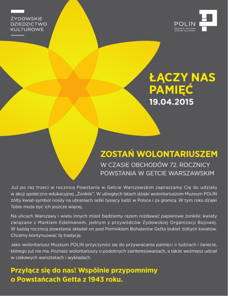 ŁĄCZY NAS PAMIĘĆ 19.04.2015 ZOSTAŃ WOLONTARIUSZEM W CZASIE OBCHODÓW 72. ROCZNICY POWSTANIA W GETCIE WARSZAWSKIM Już po raz trzeci w rocznicę Powstania w Getcie Warszawskim zapraszamy Cię do udziału w akcji społeczno-edukacyjnej „Żonkile”. W ubiegłych latach dzięki wolontariuszom Muzeum POLIN żółty kwiat-symbol nosiły na ubraniach setki tysięcy ludzi w Polsce i za granicą. W tym roku dzięki Tobie może być ich jeszcze więcej. Na ulicach Warszawy i wielu innych miast będziemy razem rozdawać papierowe żonkile: kwiaty związane z Markiem Edelmanem, jednym z przywódców Żydowskiej Organizacji Bojowej. W każdą rocznicę powstania składał on pod Pomnikiem Bohaterów Getta bukiet żółtych kwiatów. Chcemy kontynuować tę tradycję. Jako wolontariusz Muzeum POLIN przyczynisz się do przywracania pamięci o ludziach i świecie, którego już nie ma. Poznasz wolontariuszy o podobnych zainteresowaniach, a także weźmiesz udział w ciekawych warsztatach i wykładach. Przyłącz się do nas! Wspólnie przypomnimy o Powstańcach Getta z 1943 roku. W 2015 roku obchodzimy 72. rocznicę Powstania w Getcie Warszawskim, które było pierwszym miejskim powstaniem w okupowanej Europie. Po wielkiej akcji deportacyjnej latem 1942 r., w czasie której wywieziono do Treblinki prawie 300 tys. Żydów warszawskich, w getcie pozostało 60 tys. osób. Kiedy 19 kwietnia 1943 r. oddziały niemieckie przystąpiły do ostatecznej likwidacji getta, przeciwstawili im się członkowie Żydowskiej Organizacji Bojowej (ŻOB) i Żydowskiego Związku Wojskowego (ŻZW). W nierównej walce słabo uzbrojeni bojowcy wytrwali trzy tygodnie. W tym czasie Niemcy zrównali getto z ziemią, metodycznie paląc dom po domu, zabijając i wywożąc do obozów mieszkańców getta. 8 maja w otoczonym przez Niemców bunkrze przy ulicy Miłej przywódca powstania Mordechaj Anielewicz odebrał sobie życie wraz z grupą kilkudziesięciu ŻOB-owców. Nielicznym bojowcom udało się wydostać kanałami z płonącego getta. Jednym z nich był ostatni dowódca ŻOB Marek Edelman, który zmarł w 2009 r. Za symboliczną datę zakończenia powstania uznaje się 16 maja 1943 r., gdy Niemcy wysadzili Wielką Synagogę na Tłomackiem. Getto warszawskie przestało istnieć. Na zgłoszenia czekamy do 8 marca. Kontakt: Ewa Celińska-Spodar i Joanna Pitucha koordynatorki wolontariatu Muzeum POLIN tel. 22 471 03 89, 604 431 627 email: [email protected] Więcej informacji na stronach: www.polin.pl/wolontariat www.facebook.com/WolontariatMuzeumHistoriiZydowPolskich Wsparcie udzielone z funduszy norweskich i EOG przez Islandię, Liechtenstein i Norwegię. Partnerzy projektu: Wsparcie projektu: