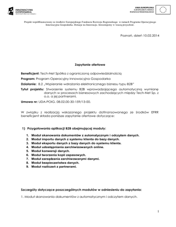 Projekt współfinansowany ze środków Europejskiego Funduszu Rozwoju Regionalnego w ramach Programu Operacyjnego Innowacyjna Gospodarka. Dotacje na Innowacje. Inwestujemy w waszą przyszłość. Poznań, dzień 10.02.2014 Zapytanie ofertowe Beneficjent: Tech-Net Spółka z ograniczoną odpowiedzialnością Program: Program Operacyjny Innowacyjna Gospodarka Działanie: 8.2 „Wspieranie wdrażania elektronicznego biznesu typu B2B” Tytuł projektu: Stworzenie systemu B2B wprowadzającego automatyczną wymianę danych w procesach biznesowych zachodzących między Tech-Net Sp. z o.o. a jej partnerami. Umowa nr: UDA-POIG. 08.02.00-30-159/13-00. W związku z realizacją wskazanego projektu dofinansowanego ze środków EFRR beneficjent składa poniższe zapytanie ofertowe dotyczące: 1) Przygotowania aplikacji B2B obejmującej moduły: 1. 2. 3. 4. 5. 6. 7. 8. 9. Moduł skanowania dokumentów z automatycznym i odczytem danych. Moduł importu danych z systemu klienta do bazy danych. Moduł eksportu danych z bazy danych do systemu klienta. Moduł udostępniania zarchiwizowanych online. Moduł konwersji danych. Moduł tworzenia kopii zapasowych. Moduł zarządzania zarchiwowanymi danymi. Moduł bezpieczeństwa danych. Moduł rozliczeń z partnerami. Szczegóły dotyczące poszczególnych modułów w odniesieniu do zapytania: 1. Moduł skanowania dokumentów z automatycznym i odczytem danych. 1 Projekt współfinansowany ze środków Europejskiego Funduszu Rozwoju Regionalnego w ramach Programu Operacyjnego Innowacyjna Gospodarka. Dotacje na Innowacje. Inwestujemy w waszą przyszłość. Opis: umożliwienie automatyzacji procesu archiwizacji cyfrowych dokumentów. Umożliwienie skanowania dokumentów papierowych oraz przekształcanie ich na dokumenty elektroniczne. Możliwe to będzie dzięki funkcji odczytu danych z dokumentu papierowego i zapisu w formie elektronicznej. Podstawowa funkcja: automatyczny odczyt danych ze skanowanych dokumentów. 2. Moduł importu danych z systemu klienta do bazy danych. Opis: umożliwienie automatycznego importu danych klienta do Wnioskodawcy, w celu ich archiwizacji. Podstawowa funkcja: Import danych 3. Moduł eksportu danych z bazy danych do systemu klienta. Opis: automatyczny eksport danych zarchiwizowanych u Wnioskodawcy do klienta bez zaangażowania czynnika ludzkiego. Podstawowa funkcja: eksport baz danych 4. Moduł udostępniania zarchiwizowanych danych online. Opis: dostęp do zarchiwizowanych dokumentów, nie tylko poprzez system informatyczny, ale również poprzez przeglądarkę www. Dostęp do cyfrowych danych możliwy z każdego miejsca, o dowolnej porze dnia. Podstawowa funkcja: Udostępnianie zarchiwizowanych danych. 5. Moduł konwersji danych. Opis: konwersja danych do jednego formatu pliku z kilku różnych baz danych w ramach zróżnicowanych systemów informatycznych partnerów Podstawowa funkcja: konwersja danych 6. Moduł tworzenia kopii zapasowych. Opis: tworzenie kopii zapasowych, wszystkich dokumentów importowanych do systemu. Kopie będą tworzone automatycznie podczas importu archiwizowanych danych. Podstawowa funkcja: tworzenie kopii zapasowych danych 7. Moduł zarządzania zarchiwowanymi danymi. Opis: zapewnienie pełnego zakresu możliwości zarządzania zarchiwizowanymi danymi, umożliwiając ustalanie poziomu dostępu poszczególnych partnerów do zasobów zgromadzonych w systemie. Zarządzanie treścią danych będących przedmiotem obiegu w ramach integracji, aby zapewnić odpowiedni poziom zarządzania systemem. Podstawowa funkcja: zarządzanie zarchiwizowanymi danymi. 2 Projekt współfinansowany ze środków Europejskiego Funduszu Rozwoju Regionalnego w ramach Programu Operacyjnego Innowacyjna Gospodarka. Dotacje na Innowacje. Inwestujemy w waszą przyszłość. 8. Moduł bezpieczeństwa danych. Opis: zapewnienie odpowiedniego poziomu bezpieczeństwa archiwizowanych danych. Konfiguracja według wymogów bezpieczeństwa danych obowiązujących zgodnie z Ustawą oraz GIODO. Podstawowa funkcja: bezpieczeństwo. 9. Moduł rozliczeń z partnerami. Opis: usprawnienie i automatyzacja finansowych aspektów współpracy z partnerami. Stworzenie działów finansowych i księgowości. Automatyzacja przepływu faktur, przypomnień i przelewów. Podstawowa funkcja: rozliczenia z partnerami. 2) przeprowadzenia działań wdrożeniowych, konfiguracyjnych, instalacyjnych i testowych poszczególnych modułów: Instalacja, konfiguracja, wdrożenie modułu skanowania dokumentów z automatycznym i odczytem danych. Instalacja, konfiguracja, wdrożenie modułu importu danych z systemu klienta do bazy danych. Instalacja, konfiguracja, wdrożenie modułu eksportu danych z bazy danych do systemu klienta. Instalacja, konfiguracja, wdrożenie modułu udostępniania zarchiwizowanych danych online. Instalacja, konfiguracja, wdrożenie modułu konwersji danych. Instalacja, konfiguracja, wdrożenie modułu tworzenia kopii zapasowych. Instalacja, konfiguracja, wdrożenie modułu zarządzania zarchiwowanymi danymi. Instalacja, konfiguracja, wdrożenie modułu bezpieczeństwa danych. Instalacja, konfiguracja, wdrożenie modułu rozliczeń z partnerami. 3 Projekt współfinansowany ze środków Europejskiego Funduszu Rozwoju Regionalnego w ramach Programu Operacyjnego Innowacyjna Gospodarka. Dotacje na Innowacje. Inwestujemy w waszą przyszłość. 3) Przeprowadzenie działań wdrożeniowych, konfiguracyjnych i testowych całego systemu B2B : Wdrożenie i konfiguracja całego systemu B2B. Testy wydajnościowe oraz obciążeniowe całego systemu B2B. Szczegóły w odniesieniu do zapytania: Wdrożenie jest niezbędną częścią implementacji każdego systemu informatycznego w firmie. Dla sprawnego i skutecznego przeprowadzenia wdrożenia niezwykle pomocnym jest: wdrażanie i odpowiednie zaprojektowanie systemu informatycznego, przygotowanie organizacyjne firmy do wdrożenia, systematyczne przeprowadzenie procesu wdrożeniowego. Jednocześnie elementem, który ni