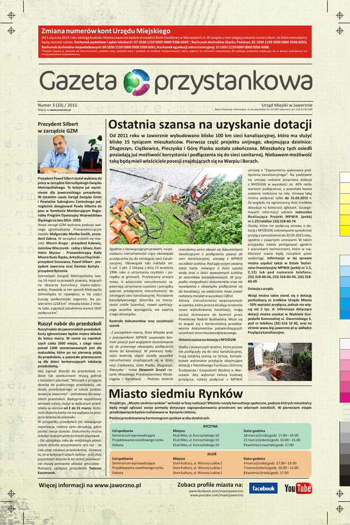 Zmiana numerów kont Urzędu Miejskiego Od 1 stycznia 2015 roku obsługę budżetu Miasta Jaworzna będzie prowadzić Bank Handlowy w Warszawie S.A. W związku z tym ulegają zmianie numery kont, na które mieszkańcy będą uiszczać opłaty. Rachunek podatków i opłat lokalnych: 07 1030 1159 0000 0000 9206 6045*; Rachunek dochodów Skarbu Państwa: 82 1030 1159 0000 0000 9206 6053; Rachunek dochodów niepodatkowych: 60 1030 1159 0000 0000 9206 6061; Rachunek egzekucji administracyjnej: 10 1030 1159 0000 0000 9206 6088. *Podatki lokalne tj. podatek od nieruchomości, podatek rolny, podatek leśny i podatek od środków transportowych należy wpłacać na rachunek indywidualny dla każdego podatnika znajdujący się w decyzji podatkowej lub w indywidualnym zawiadomieniu. Gazeta przystankowa Urząd Miejski w Jaworznie Numer 3 (33) / 2015 Biuro Promocji i Informacji, ul. Grunwaldzka 33, 43-600 Jaworzno, tel. (32) 61 81 585 Więcej na www.jaworzno.pl Prezydent Silbert w zarządzie GZM Prezydent Paweł Silbert został wybrany do pracy w zarządzie Górnośląskiego Związku Metropolitalnego. To kolejne już wyróżnienie dla jaworznickiego prezydenta. W ostatnim czasie Zarząd Związku Gmin i Powiatów Subregionu Centralnego jednogłośnie desygnował Pawła Silberta do prac w Komitecie Monitorującym Regionalny Program Operacyjny Województwa Śląskiego na lata 2014 - 2020. Nowy zarząd GZM wybrano podczas walnego zgromadzenia. Przewodniczącym została Małgorzata Mańka-Szulik, prezydent Zabrza. W zarządzie znaleźli się również: Marcin Krupa - prezydent Katowic, Jarosław Wieczorek - radny z Gliwic, Kazimierz Myszur - Przewodniczący Rady Miasta Ruda Śląska, Arkadiusz Chęciński prezydent Sosnowca, Paweł Silbert - prezydent Jaworzna oraz Damian Bartyla prezydent Bytomia. Górnośląski Związek Metropolitalny tworzy 14 miast na prawach powiatu, leżących na obszarze konurbacji śląsko-dąbrowskiej. Powstała w ten sposób Metropolia Górnośląska to największy w tej części Europy wielkomiejski organizm. Na po2 wierzchni 1218 km . mieszka blisko 2 miliony ludzi, a gęstość zaludnienia wynosi 1642 2 osoby na km . Ruszył nabór do przedszkoli Ruszył nabór do jaworznickich przedszkoli. Karty zgłoszeniowe będzie można składać do końca marca. W sumie na najmłodszych czeka 2600 miejsc, z czego nieco ponad 1200 zarezerwowanych jest dla maluszków, które po raz pierwszy pójdą do przedszkola, a pozostałe przeznaczone są dla dzieci kontynuujących edukację przedszkolną. Aby zapisać dziecko do przedszkola rodzice lub opiekunowie muszą pobrać z kancelarii placówki "Wniosek o przyjęcie dziecka do publicznego przedszkola, oddziału przedszkolnego w szkole podstawowej w Jaworznie" - jednakowy dla wszystkich przedszkoli. Następnie wypełniony wniosek należy złożyć w wybranym przedszkolu w okresie od 2 do 31 marca. Kolejność złożenia karty nie ma wpływu na przyjęcie dziecka do placówki. W przypadku przedszkoli nie obowiązuje rejonizacja, rodzice sami decydują, gdzie posłać swoje dziecko. Dokumenty można składać maksymalnie do trzech placówek. - Od ubiegłego roku do miejskiego przedszkola dziecko przyjmowane jest raz - na cały etap edukacji przedszkolnej. Oznacza to, że w kolejnych latach rodzice - jeśli chcą pozostawić dziecko w tej samej placówce nie muszą ponownie składać wniosków tłumaczy zastępca prezydenta Tadeusz Kaczmarek. Ostatnia szansa na uzyskanie dotacji Od 2011 roku w Jaworznie wybudowano blisko 100 km sieci kanalizacyjnej, która ma służyć blisko 15 tysiącom mieszkańców. Pierwsza część projektu unijnego, obejmująca dzielnice: Długoszyn, Ciężkowice, Pieczyska i Górę Piasku została zakończona. Mieszkańcy tych osiedli posiadają już możliwość korzystania i podłączenia się do sieci sanitarnej. Niebawem możliwość taką będą mieli właściciele posesji znajdujących się na Warpiu i Borach. Zgodnie z obowiązującym prawem, na posiadaczu nieruchomości ciąży obowiązek przyłączenia jej do istniejącej sieci kanalizacyjnej. Obowiązek taki nakłada art. 5 ust. 1 pkt. 2 Ustawy z dnia 13 września 1996 roku o utrzymaniu czystości i porządku w gminach. Przytoczony przepis mówi, iż właściciele nieruchomości zapewniają utrzymanie czystości i porządku poprzez przyłączenie nieruchomości do istniejącej sieci kanalizacyjnej. Posiadanie bezodpływowego zbiornika na nieczystości ciekłe (szamba), nawet spełniającego wszelkie wymagania, nie zwalnia z tego obowiązku. Kontrole dokumentów oraz szczelności szamb - Z początkiem marca, Straż Miejska wraz z pracownikami MPWiK rozpoczęła kontrole posesji pod względem dostosowania się do prawnego obowiązku podłączenia domu do kanalizacji. W pierwszej kolejności kontrolą objęte zostały wszystkie nieruchomości znajdujących się w dzielnicy: Ciężkowice, Góra Piasku, Długoszyn, Pieczyska - mówi Sławomir Grucel rzecznik Miejskiego Przedsiębiorstwa Wodociągów i Kanalizacji. - Podczas kontroli mieszkańcy winni okazać się dokumentami świadczącymi o podłączeniu posesji do sieci kanalizacyjnej, umową z MPWiK na odbiór ścieków. Pod lupę wzięte zostaną także kwity mówiące o ilości zużytej wody oraz o ilości wywożonych ścieków ze zbiorników bezodpływowych. W przypadku niezgodności dokumentów oraz nie wywiązania z obowiązku podłączenia się do kanalizacji, na właściciela może zostać nałożony mandat w wysokości 500 zł. Adresy nieruchomości wyposażonych w szamba, które jeszcze działają na terenie nowo wybudowanej kanalizacji, mogą zostać skierowane do kontroli przez Powiatowy Nadzór Budowlany. Może się to wiązać się z koniecznością przedstawienia dokumentów potwierdzających szczelność zbiornika bezodpływowego. umowę o "Zapewnieniu wykonania podłączenia kanalizacyjnego”. Na podstawie tej umowy zostanie przyznana dotacja z NFOŚiGW w wysokości ok. 40% netto wartości podłą
