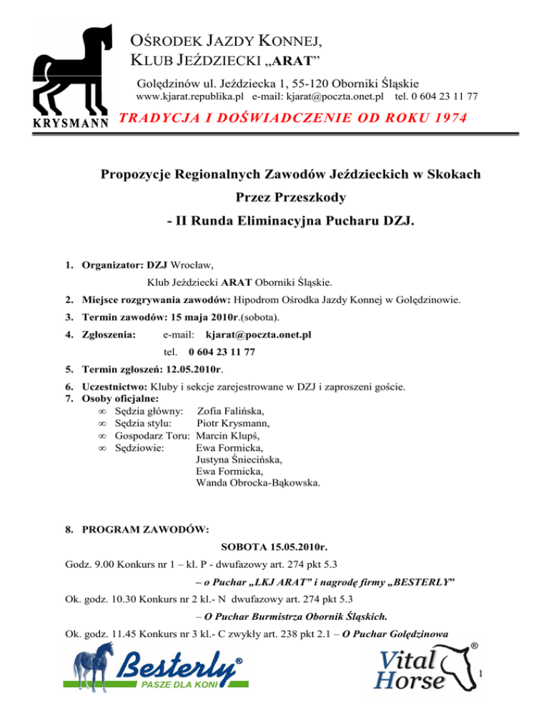 OŚRODEK JAZDY KONNEJ, KLUB JEŹDZIECKI „ARAT” Golędzinów ul. Jeździecka 1, 55-120 Oborniki Śląskie www.kjarat.republika.pl e-mail: [email protected] tel. 0 604 23 11 77 TRADYCJA I DOŚWIADCZENIE OD ROKU 1974 Propozycje Regionalnych Zawodów Jeździeckich w Skokach Przez Przeszkody - II Runda Eliminacyjna Pucharu DZJ. 1. Organizator: DZJ Wrocław, Klub Jeździecki ARAT Oborniki Śląskie. 2. Miejsce rozgrywania zawodów: Hipodrom Ośrodka Jazdy Konnej w Golędzinowie. 3. Termin zawodów: 15 maja 2010r.(sobota). 4. Zgłoszenia: e-mail: tel. [email protected] 0 604 23 11 77 5. Termin zgłoszeń: 12.05.2010r. 6. Uczestnictwo: Kluby i sekcje zarejestrowane w DZJ i zaproszeni goście. 7. Osoby oficjalne: • Sędzia główny: Zofia Falińska, • Sędzia stylu: Piotr Krysmann, • Gospodarz Toru: Marcin Klupś, • Sędziowie: Ewa Formicka, Justyna Śniecińska, Ewa Formicka, Wanda Obrocka-Bąkowska. 8. PROGRAM ZAWODÓW: SOBOTA 15.05.2010r. Godz. 9.00 Konkurs nr 1 – kl. P - dwufazowy art. 274 pkt 5.3 – o Puchar „LKJ ARAT” i nagrodę firmy „BESTERLY” Ok. godz. 10.30 Konkurs nr 2 kl.- N dwufazowy art. 274 pkt 5.3 – O Puchar Burmistrza Obornik Śląskich. Ok. godz. 11.45 Konkurs nr 3 kl.- C zwykły art. 238 pkt 2.1 – O Puchar Golędzinowa 1 Ok. godz. 13.00 Konkurs nr 4 kl. LL dla kucy - dwufazowy art. 274 pkt 5.3 - o puchar firmy „VITAL HORSE” Ok. godz. 13.30 Konkurs nr 5 – LL dokładności bez rozgrywki art. 238 pkt 1.1 Ok. godz. 15.00 Konkurs nr 6 – kl L dokładności bez rozgrywki art. 238 pkt 1.1 Ok. godz. 16.30 Konkurs nr 7 – LICENCYJNY art. P-3 9. Ostateczne godziny rozpoczęcia konkursów zostaną podane 13.05.2010 (czwartek) na stronie www.kjarat.republika.pl – po otrzymaniu ostatecznych zgłoszeń. 10. Dekoracje zwycięzców odbędą się bezpośrednio po zakończeniu konkursów. 11. Warunki techniczne: rozpręŜalnia: podłoŜe piaszczyste, hipodrom: podłoŜe piaszczyste. 12. Opłata organizacyjna: 40 zł od startu. Zamknięcie listy startowej na 1 godz. przed planowanym rozpoczęciem konkursu. Opłatę naleŜy uiścić przed zamknięciem listy. KAśDA ZMIANA NA LIŚCIE STARTOWEJ PO JEJ ZAMKNIĘCIU PODLEGA OPŁACIE 30 ZŁ. Zgłoszenia po terminie mogą być przyjęte za zwiększoną opłatą organizacyjną. 13. UWAGI: - zgłoszenie się do zawodów jest równoznaczne z zaakceptowaniem propozycji zawodów, - zgłoszenie e-mailem jest waŜne po otrzymaniu potwierdzenia o jego przyjęciu, - organizator nie odpowiada za wypadki i kradzieŜe w czasie zawodów i transportu, - organizator zastrzega sobie prawo do zmian programu zawodów oraz ograniczenia ilości startujących koni – decyduje kolejność zgłoszeń, - informacje dodatkowe pod numerem telefonu: 0 604 23 11 77, - organizator dysponuje ograniczoną ilością boksów dla koni na miejscu zawodów, - w trakcie trwania zawodów obowiązuje ruch okręŜny do Ośrodka. - listy startowe dostępne będą na stronie www.kjarat.republika.pl 14. Jeźdźców i konie obowiązuje dokumentacja PZJ. 15. Organizator przewiduje nagrody honorowe i rzeczowe oraz flot’s dla zwycięzców. 16. Do Pucharu DZJ zaliczane są konkursy nr 1,2,3,4,5,6. 17. Propozycje zatwierdzone przez DZJ we Wrocławiu w dniu 23.04.2010r. 2 KODEKS POSTĘPOWANIA Z KONIEM Międzynarodowa Federacja Jeździecka (FEI) oczekuje od wszystkich osób zaangaŜowanych w sport jeździecki respektowania wydanego przez FEI Kodeksu Postępowania z Końmi, jak równieŜ przestrzegania zasady, Ŝe dobro koni jest najwaŜniejsze. Dobro koni musi być zawsze uwzględniane we współzawodnictwie sportowym oraz nie moŜe być podporządkowane celom komercyjnym. 1. Na kaŜdym etapie przygotowań i treningu konia do zawodów jego dobro musi być stawiane na pierwszym miejscu. Dotyczy to stałej dbałości o konia, stosowanych metod treningowych, kucia i obrządzania oraz transportu. 2. Konie i zawodnicy muszą być dobrze przygotowani, zgrani ze sobą, odznaczać się dobrym zdrowiem, zanim zostaną dopuszczeni do startu w zawodach. Odnosi się to równieŜ do pomocy weterynaryjnej, zapewnienia bezpieczeństwa po operacjach , w czasie ciąŜy oraz interwencji w razie złego traktowania konia. 3. Zawody nie mogą zagraŜać dobru konia. Oznacza to, Ŝe naleŜy zwrócić szczególną uwagę na: prawidłowe przygotowanie terenu zawodów, rodzaj podłoŜa na hipodromie i trasach, warunki pogodowe, odpowiednie przygotowanie stajni, zapewnienie bezpieczeństwa i wygody koniom w drodze powrotnej z zawodów. 4. NaleŜy dołoŜyć wszelkich starań, aby zapewnić koniom prawidłową opiekę po starcie w zawodach, jak równieŜ humanitarne traktowanie po zakończeniu kariery sportowej. Dotyczy to zwłaszcza odpowiedniej opieki weterynaryjnej, wymaganych szczepień (eutanazji) oraz spokojnej starości. 5. FEI zobowiązuje wszystkie osoby zaangaŜowane w sport jeździecki do stałego podnoszenia na wyŜszy poziom swojej wiedzy i kwalifikacji w tym zakresie. 3