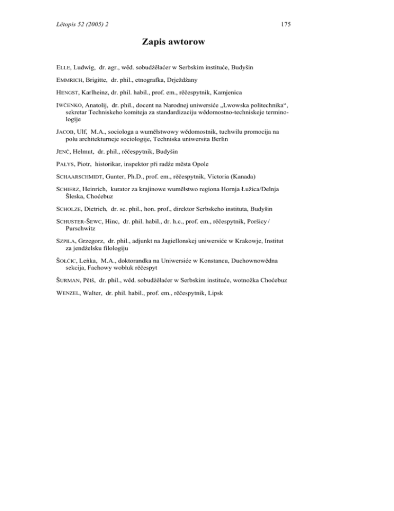 Lětopis 52 (2005) 2 175 Zapis awtorow ELLE, Ludwig, dr. agr., wěd. sobudźěłaćer w Serbskim instituće, Budyšin EMMRICH, Brigitte, dr. phil., etnografka, Drježdźany HENGST, Karlheinz, dr. phil. habil., prof. em., rěčespytnik, Kamjenica IWČENKO, Anatolij, dr. phil., docent na Narodnej uniwersiće „Lwowska politechnika“, sekretar Techniskeho komiteja za standardizaciju wědomostno-techniskeje terminologije JACOB, Ulf, M.A., sociologa a wuměłstwowy wědomostnik, tuchwilu promocija na polu architekturneje sociologije, Techniska uniwersita Berlin JENČ, Helmut, dr. phil., rěčespytnik, Budyšin PAŁYS, Piotr, historikar, inspektor při radźe města Opole SCHAARSCHMIDT, Gunter, Ph.D., prof. em., rěčespytnik, Victoria (Kanada) SCHIERZ, Heinrich, kurator za krajinowe wuměłstwo regiona Hornja Łužica/Delnja Šleska, Choćebuz SCHOLZE, Dietrich, dr. sc. phil., hon. prof., direktor Serbskeho instituta, Budyšin SCHUSTER-ŠEWC, Hinc, dr. phil. habil., dr. h.c., prof. em., rěčespytnik, Poršicy / Purschwitz SZPILA, Grzegorz, dr. phil., adjunkt na Jagiellonskej uniwersiće w Krakowje, Institut za jendźelsku filologiju ŠOŁĆIC, Leńka, M.A., doktorandka na Uniwersiće w Konstancu, Duchownowědna sekcija, Fachowy wobłuk rěčespyt ŠURMAN, Pětš, dr. phil., wěd. sobudźěłaćer w Serbskim instituće, wotnožka Choćebuz WENZEL, Walter, dr. phil. habil., prof. em., rěčespytnik, Lipsk