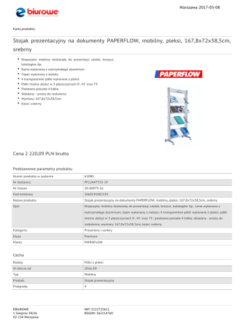 Warszawa 2017-03-08 Karta produktu: Stojak prezentacyjny na dokumenty PAPERFLOW, mobilny, pleksi, 167,8x72x38,5cm, srebrny Ekspozytor mobilny doskonały do prezentacji ulotek, broszur, katalogów itp. Rama wykonana z wytrzymałego aluminium Toper wykonany z metalu 4 transparentne półki wykonane z pleksi Półki można ułożyć w 3 płaszczyznach 0', 45' oraz 75' Podstawa posiada 4 kółka Składany - prosty do rozłożenia Wymiary: 167,8x72x38,5cm Kolor: srebrny Cena 2 220,09 PLN brutto Podstawowe parametry produktu Numer produktu w systemie 61080 Nr dostawcy PF12A4TT35-19 Nr Celcen 20-00979-16 Kod kreskowy 3660141882193 Nazwa produktu Stojak prezentacyjny na dokumenty PAPERFLOW, mobilny, pleksi, 167,8x72x38,5cm, srebrny Opis Ekspozytor mobilny doskonały do prezentacji ulotek, broszur, katalogów itp.; rama wykonana z wytrzymałego aluminium; toper wykonany z metalu; 4 transparentne półki wykonane z pleksi; półki można ułożyć w 3 płaszczyznach 0', 45' oraz 75'; podstawa posiada 4 kółka; składany - prosty do rozłożenia; wymiary: 167,8x72x38,5cm; kolor: srebrny Kategoria Prezentery i sortery Klasa Premium Marka PAPERFLOW Cecha Rodzaj Pólki z pleksi W ofercie od 2016-09 Typ Mobilny Produkt Stojak prezentacyjny Przegrody 4 EBIUROWE 1 Sierpnia 39/26 02-134 Warszawa NIP: 5222725611 REGON: 362214769 Warszawa 2017-03-08 Karta katalogowa produktu cd. Stojak prezentacyjny na dokumenty PAPERFLOW, mobilny, pleksi, 167,8x72x38,5cm, srebrny Wymiary Wymiary (mm) 1678x720x385 Rozmiar 4 półki Wspólny słownik zamówień CPV 30193500-3 Stojak na materiały reklamowe Certyfikaty Nowy produkt w ofercie Standard Hit Standard Kolor Kolor Srebrny Serdecznie zapraszamy do współpracy EBIUROWE zespół. EBIUROWE 1 Sierpnia 39/26 02-134 Warszawa NIP: 5222725611 REGON: 362214769