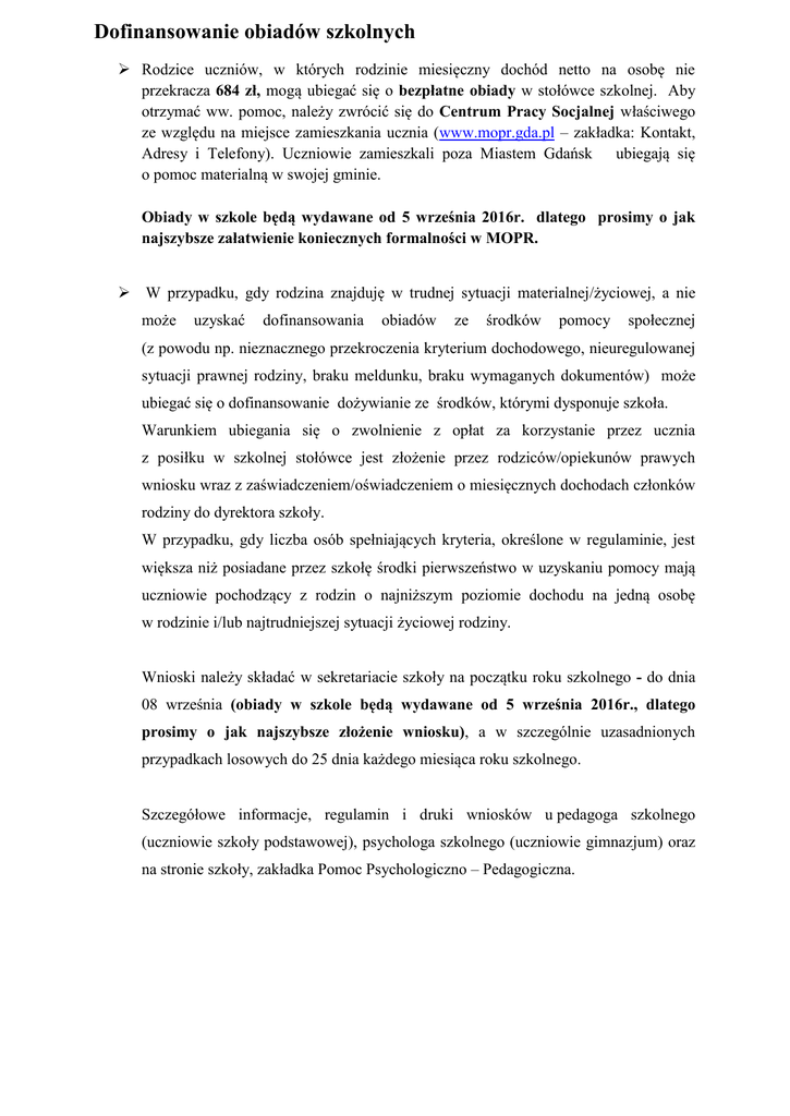 Dofinansowanie obiadów szkolnych Rodzice uczniów, w których rodzinie miesięczny dochód netto na osobę nie przekracza 684 zł, mogą ubiegać się o bezpłatne obiady w stołówce szkolnej. Aby otrzymać ww. pomoc, należy zwrócić się do Centrum Pracy Socjalnej właściwego ze względu na miejsce zamieszkania ucznia (www.mopr.gda.pl – zakładka: Kontakt, Adresy i Telefony). Uczniowie zamieszkali poza Miastem Gdańsk ubiegają się o pomoc materialną w swojej gminie. Obiady w szkole będą wydawane od 5 września 2016r. dlatego prosimy o jak najszybsze załatwienie koniecznych formalności w MOPR. W przypadku, gdy rodzina znajduję w trudnej sytuacji materialnej/życiowej, a nie może uzyskać dofinansowania obiadów ze środków pomocy społecznej (z powodu np. nieznacznego przekroczenia kryterium dochodowego, nieuregulowanej sytuacji prawnej rodziny, braku meldunku, braku wymaganych dokumentów) może ubiegać się o dofinansowanie dożywianie ze środków, którymi dysponuje szkoła. Warunkiem ubiegania się o zwolnienie z opłat za korzystanie przez ucznia z posiłku w szkolnej stołówce jest złożenie przez rodziców/opiekunów prawych wniosku wraz z zaświadczeniem/oświadczeniem o miesięcznych dochodach członków rodziny do dyrektora szkoły. W przypadku, gdy liczba osób spełniających kryteria, określone w regulaminie, jest większa niż posiadane przez szkołę środki pierwszeństwo w uzyskaniu pomocy mają uczniowie pochodzący z rodzin o najniższym poziomie dochodu na jedną osobę w rodzinie i/lub najtrudniejszej sytuacji życiowej rodziny. Wnioski należy składać w sekretariacie szkoły na początku roku szkolnego - do dnia 08 września (obiady w szkole będą wydawane od 5 września 2016r., dlatego prosimy o jak najszybsze złożenie wniosku), a w szczególnie uzasadnionych przypadkach losowych do 25 dnia każdego miesiąca roku szkolnego. Szczegółowe informacje, regulamin i druki wniosków u pedagoga szkolnego (uczniowie szkoły podstawowej), psychologa szkolnego (uczniowie gimnazjum) oraz na stronie szkoły, zakładka Pomoc Psychologiczno – Pedagogiczna.