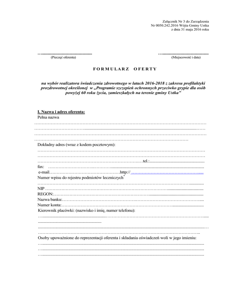 Załącznik Nr 3 do Zarządzenia Nr 0050.242.2016 Wójta Gminy Ustka z dnia 31 maja 2016 roku ….................................................. ….............................................. (Pieczęć oferenta) (Miejscowość i data) F O R M U LA R Z O FE RTY na wybór realizatora świadczenia zdrowotnego w latach 2016-2018 z zakresu profilaktyki prozdrowotnej określonej w „Programie szczepień ochronnych przeciwko grypie dla osób powyżej 60 roku życia, zamieszkałych na terenie gminy Ustka” I. Nazwa i adres oferenta: Pełna nazwa …………………………………………………………………………………………………… ……………………………...................................................................................................…… …………………………………………………………………………………………………… ………………………………………………………………………………………… Dokładny adres (wraz z kodem pocztowym): ………………………………………………………………………………………………… ………………………………………………………………………………………………… ………………………………………………………….…tel.:..................................................... fax: ………………………….…………........................................................................................... e-mail…………………………………………http:// ………………………………………..... Numer wpisu do rejestru podmiotów leczniczych* …………………………………………………………………………………………............. NIP ………………………………………………………………………….................................... REGON:…………………………………………………………........................................................ Nazwa banku:………………………………………….…………………………………….... Numer konta:………………………………………………………………….............................. Kierownik placówki: (nazwisko i imię, numer telefonu): ….............................................................…………………………………………………………..... ............................................................. ................................................................................................................................................................… ……………………………………………………………………………………………….. Osoby upoważnione do reprezentacji oferenta i składania oświadczeń woli w jego imieniu: …......................................................................................................................................................... …......................................................................................................................................................... …......................................................................................................................................................... Osoba odpowiedzialna za realizację zadań objętych konkursem ofert (nazwisko i imię, numer telefonu):………………………………………………………………………………………… ……………………………………………………………………………………........................... ...............…………………………………………………………....................................................... .............…………………………………………………………………………………………… ……... II. Dane dotyczące warunków lokalowych zapewniających realizacje świadczeń Opis warunków lokalowych, wyposażenia w aparaturę i sprzęt medyczny oraz w środki transportu i łączności, w których będzie realizowane zadanie: III. Informacja na temat personelu medycznego, który będzie realizował świadczenia zdrowotne Wykaz imienny personelu medycznego, który będzie realizował świadczenia z określeniem kwalifikacji zawodowych IV. Plan rzeczowo – finansowy: 1. Cena jednostkowa brutto za wykonanie pojedynczego świadczenia w ramach programu, zawierająca koszt szczepionki wraz z kosztem badania lekarskiego i iniekcji wynosi (zł brutto) Słownie złotych: 2. Cena za kampanię informacyjnoedukacyjną wynosi (zł brutto) Słownie złotych: Szacowana liczba osób objętych szczepieniem w ramach Programu: Szacowana liczba osób objętych szczepieniem w ramach Programu: Szacowana liczba osób objętych szczepieniem w ramach Programu: w 2016 roku: około 1660 osób powyżej 60 roku życia – jednokrotne szczepienie w 2017 roku (według danych ew.ludności-stan na dzień 31 grudnia 2016 rok) około …........... powyżej 60 roku życia – jednokrotne szczepienie w 2018 roku (według danych ew.ludności-stan na dzień 31 grudnia 2017 rok) około …........... powyżej 60 roku życia – jednokrotne szczepienie V. Proponowany czas trwania umowy: ………………………………………………………………………………………………… ……………………................................................................................................................... ………………………………………………………………………………………………… …………………....................................................................................................................... VI. Proponowany sposób przeprowadzenia intensywnej i skutecznej akcji informacyjno–edukacyjnej skierowanej