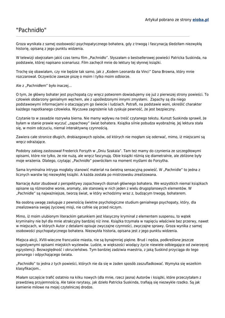 Artykuł pobrano ze strony eioba.pl "Pachnidło" Groza wynikała z samej osobowości psychopatycznego bohatera, gdy z trwogą i fascynacją śledziłam niezwykłą historię, opisaną z jego punktu widzenia. W telewizji obejrzałam jakiś czas temu film „Pachnidło”. Słyszałam o bestsellerowej powieści Patricka Suskinda, na podstawie, której napisano scenariusz. Film zachęcił mnie do lektury tej słynnej książki. Trochę się obawiałam, czy nie będzie tak samo, jak z „Kodem Leonarda da Vinci” Dana Browna, który mnie rozczarował. Oczywiście zawsze piszę o moim i tylko moim odbiorze. Ale z „Pachnidłem” było inaczej… O tym, że główny bohater jest psychopatą czy wręcz potworem dowiadujemy się już z pierwszej strony powieści. To człowiek obdarzony genialnym węchem, ale z upośledzonymi innymi zmysłami. Zapachy są dla niego podstawowymi informacjami o otaczającym go świecie i ludziach. Potrafi, na podstawie woni, określić charakter każdego napotkanego człowieka. Wyczuwa zagrożenie lub zyskuje pewność, że jest bezpieczny. Czytanie to w zasadzie rozrywka bierna. Nie mamy wpływu na treść czytanego tekstu. Kunszt Suskinda sprawił, że byłam w stanie prawie wyczuć „zapachowy” świat bohatera. Książka silnie pobudza wyobraźnię. Jej lektura stała się, w moim odczuciu, niemal interaktywną czynnością. Zawiera całe stronice długich, drobiazgowych opisów, od których nie mogłam się oderwać, mimo, iż miejscami są wręcz odrażające. Podobny zabieg zastosował Frederick Forsyth w „Dniu Szakala”. Tam też mamy do czynienia ze szczegółowymi opisami, które nie tylko, że nie nużą, ale wręcz fascynują. Obie książki różnią się diametralnie, ale zbliżone były moje wrażenia. Dlatego, czytając „Pachnidło” powróciłam na moment myślami do Forsytha. Sama kryminalna intryga mogłaby stanowić materiał na świetną sensacyjną powieść. W „Pachnidle” to jedna z licznych warstw tej niezwykłej książki. A każda została po mistrzowsku zrealizowana. Narrację Autor zbudował z perspektywy zapachowych doznań głównego bohatera. We wszystkich niemal książkach opisane są różnorodne wonie, aromaty, ale stanowią w nich jeden z wielu drugoplanowych elementów. W „Pachnidle” są najważniejsze, tworzą świat, w który wchodzimy wraz z, budzącym trwogę, bohaterem. Na osobną uwagę zasługuje z pewnością świetne psychologiczne studium genialnego psychopaty, który, dla zrealizowania swojej życiowej misji, nie cofnie się przed niczym. Mimo, iż moim ulubionym literackim gatunkiem jest klasyczny kryminał z elementem suspensu, to wątek kryminalny nie był dla mnie atrakcyjny bardziej niż inne. Książka trzymała w napięciu właściwie bez przerwy, nawet w miejscach, w których Autor z detalami opisuje zwyczajne czynności, zwyczajne sprawy. Groza wynika z samej osobowości psychopatycznego bohatera. Niezwykła historia, opisana jest z jego punktu widzenia. Miejsca akcji, XVIII-wieczne francuskie miasta, nie są bynajmniej piękne. Brud i nędza, podkreślone jeszcze sugestywnymi opisami miejskich wyziewów. Ludzie, w większości wiodący życie niewiele odbiegające od zwierzęcej egzystencji. Bezwzględność i okrucieństwo. Tym bardziej zadziwia maestria, z jaką Suskind przyciąga do tego ponurego i odpychającego świata. „Pachnidło” to jedna z tych powieści, których nie da się w żaden sposób zaszufladkować. Wymyka się wszelkim klasyfikacjom.. Miałam szczęście trafić ostatnio na kilku nowych (dla mnie, rzecz jasna) Autorów i książki, które przeczytałam z prawdziwą przyjemnością. Ale takie rarytasy, jak dzieło Patricka Suskinda, trafiają się niezwykle rzadko. Są jak kamienie milowe na mojej czytelniczej drodze. Alicja Minicka http://mysli-o-ludziach.blog.onet.pl Autor: Alicja Minicka Artykuł pobrano ze strony eioba.pl