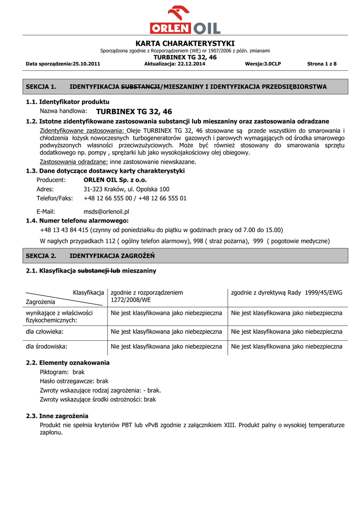 KARTA CHARAKTERYSTYKI Sporządzona zgodnie z Rozporządzeniem (WE) nr 1907/2006 z późn. zmianami TURBINEX TG 32, 46 Data sporządzenia:25.10.2011 SEKCJA 1. Aktualizacja: 22.12.2014 Wersja:3.0CLP Strona 1 z 8 IDENTYFIKACJA SUBSTANCJI/MIESZANINY I IDENTYFIKACJA PRZEDSIĘBIORSTWA 1.1. Identyfikator produktu Nazwa handlowa: TURBINEX TG 32, 46 1.2. Istotne zidentyfikowane zastosowania substancji lub mieszaniny oraz zastosowania odradzane Zidentyfikowane zastosowania: Oleje TURBINEX TG 32, 46 stosowane są przede wszystkim do smarowania i chłodzenia łożysk nowoczesnych turbogeneratorów gazowych i parowych wymagających od środka smarowego podwyższonych własności przeciwzużyciowych. Może być również stosowany do smarowania sprzętu dodatkowego np. pompy , sprężarki lub jako wysokojakościowy olej obiegowy. Zastosowania odradzane: inne zastosowanie niewskazane. 1.3. Dane dotyczące dostawcy karty charakterystyki Producent: ORLEN OIL Sp. z o.o. Adres: 31-323 Kraków, ul. Opolska 100 Telefon/Faks: +48 12 66 555 00 / +48 12 66 555 01 E-Mail: [email protected] 1.4. Numer telefonu alarmowego: +48 13 43 84 415 (czynny od poniedziałku do piątku w godzinach pracy od 7.00 do 15.00) W nagłych przypadkach 112 ( ogólny telefon alarmowy), 998 ( straż pożarna), 999 ( pogotowie medyczne) SEKCJA 2. IDENTYFIKACJA ZAGROŻEŃ 2.1. Klasyfikacja substancji lub mieszaniny Klasyfikacja zgodnie z rozporządzeniem 1272/2008/WE zgodnie z dyrektywą Rady 1999/45/EWG wynikające z właściwości fizykochemicznych: Nie jest klasyfikowana jako niebezpieczna Nie jest klasyfikowana jako niebezpieczna dla człowieka: Nie jest klasyfikowana jako niebezpieczna Nie jest klasyfikowana jako niebezpieczna dla środowiska: Nie jest klasyfikowana jako niebezpieczna Nie jest klasyfikowana jako niebezpieczna Zagrożenia 2.2. Elementy oznakowania Piktogram: brak Hasło ostrzegawcze: brak Zwroty wskazujące rodzaj zagrożenia: - brak. Zwroty wskazujące środki ostrożności: brak 2.3. Inne zagrożenia Produkt nie spełnia kryteriów PBT lub vPvB zgodnie z załącznikiem XIII. Produkt palny o wysokiej temperaturze zapłonu. KARTA CHARAKTERYSTYKI Sporządzona zgodnie z Rozporządzeniem (WE) nr 1907/2006 z późn. zmianami TURBINEX TG 32, 46 Data sporządzenia:25.10.2011 SEKCJA 3. Aktualizacja: 22.12.2014 Wersja:3.0CLP Strona 2 z 8 SKŁAD/INFORMACJA O SKŁADNIKACH 3.1. Substancje – nie dotyczy 3.2. Mieszaniny: mieszanina olejów mineralnych i dodatków uszlachetniających Niebezpieczne składniki, zakresy ich stężeń w mieszaninie: Nazwa substancji/ Nr rejestracji REACH Alkilofenol Nr CAS / Nr WE 128-39-2/ 204-884-0 % wag. 0,15<c<0,24 Nr indeksowy Klasyfikacja wg 67/548/EWG Klasyfikacja wg 1272/2008 (CLP) -- Xi;R38 N; R50/53 Skin Irrit 2; H315 Aquatic Acute 1; H400 Aquatic Chronic 1;H410 01-2119490822-33-0000 Stosowane oleje bazowe zawarte w mieszaninie na podstawie noty L nie są klasyfikowane jako rakotwórcze (zawartość ekstraktu DMSO (wg IP 346) < 3%). Opis zwrotów R i H podano w Sekcji 16 SEKCJA 4. ŚRODKI PIERWSZEJ POMOCY 4.1. Opis środków pierwszej pomocy Wdychanie: Poszkodowanego usunąć (wyprowadzić/wynieść) z miejsca narażenia na świeże powietrze; zapewnić spokój i ciepło. Nieprzytomnego ułożyć w pozycji bocznej ustalonej, rozluźnić uciskające części ubrania; kontrolować i utrzymywać drożność dróg oddechowych. W przypadku zaburzeń w oddychaniu podawać tlen, w przypadku braku oddechu stosować sztuczne oddychanie. W przypadku utraty przytomności, zaburzeń oddychania lub utrzymującego się złego samopoczucia natychmiast zapewnić pomoc lekarską.. Kontakt ze skórą: Natychmiast zdjąć zanieczyszczoną/nasiąkniętą odzież i buty. Zanieczyszczoną skórę umyć dokładnie wodą z mydłem lub łagodnym detergentem, a następnie spłukać wodą. W przypadku wystąpienia i utrzymywania się objawów podrażnienia skonsultować się z lekarzem. UWAGA: Zanieczyszczoną odzież usunąć w bezpieczne miejsce z dala od źródeł ciepła i źródeł zapłonu. Kontakt z oczami: Zanieczyszczone oczy natychmiast płukać ciągłym strumieniem wody, usunąć szkła kontaktowe (jeśli są) i kontynuować płukanie przez ok. 15 minut. Podczas płukania trzymać powieki szeroko rozwarte. W przypadku wystąpienia i utrzymywania się dolegliwości skonsultować się z lekarzem. Połknięcie: Nie prowokować wymiotów. W przypadku wystąpienia samoistnych wymiotów trzymać poszkodowanego w pozycji nachylonej do przodu z twarzą skierowaną do ziemi. Zapewnić pomoc medyczną. 4.2. Najważniejsze ostre i opóźnione objawy oraz skutki narażenia Nie określono. 4.3. Wskazania dotyczące wszelkiej natychmiastowej pomocy lekarskiej i szczególnego postępowania z poszkodowanym Nie prowokować wymiotów i nie podawać niczego doustnie osobie nieprzytomnej. Pokazać kartę charakterystyki lub etykietę/opakowanie personelowi medycznemu udzielającemu pomocy. Osoby udzielające pomocy w obszarze o nieznanym stężeniu par/mgły powinny być wyposażone w odpowiednie ochrony dróg oddechowych. Wskazówki dla lekarza: leczenie objawowe. SEKCJA 5. POSTĘPOWANIE W PRZYPADKU POŻARU 5.1. Środki gaśnicze Odpowiednie środki gaśnicze: dwutlenek węgla, proszek gaśniczy, piana, rozpylona woda KARTA CHARAKTERYSTYKI Sporządzona zgodnie z Rozporządzeniem (WE) nr 1907/2006 z późn. zmianami TURBINEX TG 32, 46 Data sporządzenia:25.10.2011 Aktualizacja: 22.12.2014 Wersja:3.0CLP Strona 3 z 8 Niewłaściwe środki gaśnicze: zwarty strumień wody. 5.2. Szczególne zagrożenia związane z substancją lub mieszaniną Produkt palny o wysokiej temperaturze zapłonu. W środowisku pożaru powstają niebezpieczne gazy zawierające tlenki węgla, tlenki azotu, tlenki siarki i inne niezidentyfikowane produkty termicznego rozkładu wyższych węglowodorów. Unikać wdychania produktów uwalniających się w środowisku pożaru. 5.3. Informacje dla straży pożarnej Postępować zgodnie z procedurami obowiązuj