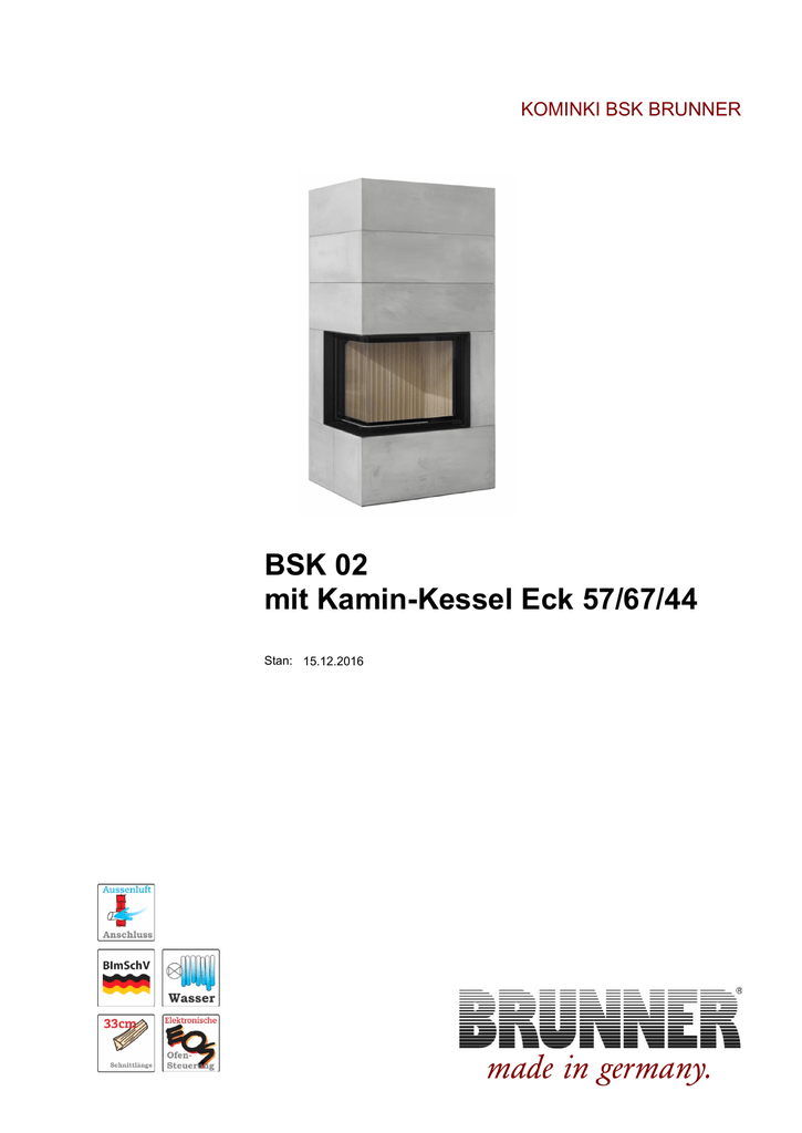 KOMINKI BSK BRUNNER BSK 02 mit Kamin-Kessel Eck 57/67/44 Stan: 15.12.2016 made in germany. Rysunki wymiarowe BSK 02 mit Kamin-Kessel Eck 57/67/44 ... lewostronny Rysunki potrzebne do planowania można znaleźć w programie PalleteCAD. Aktualne rysunki wymiarowe na stronie www.brunner.de Ramy / warianty frontów są oznaczone kolorami. Rysunki wymiarowe BSK 02 mit Kamin-Kessel Eck 57/67/44 ... prawostronny Rysunki potrzebne do planowania można znaleźć w programie PalleteCAD. Aktualne rysunki wymiarowe na stronie www.brunner.de Ramy / warianty frontów są oznaczone kolorami. Rysunki wymiarowe BSK 02 mit Kamin-Kessel Eck 57/67/44 … lewostronny z elementem podwyższającym Rysunki potrzebne do planowania można znaleźć w programie PalleteCAD. Aktualne rysunki wymiarowe na stronie www.brunner.de Ramy / warianty frontów są oznaczone kolorami. Rysunki wymiarowe BSK 02 mit Kamin-Kessel Eck 57/67/44 … prawostronny z elementem podwyższającym Rysunki potrzebne do planowania można znaleźć w programie PalleteCAD. Aktualne rysunki wymiarowe na stronie www.brunner.de Ramy / warianty frontów są oznaczone kolorami. Planowanie i montaż BSK 02 mit Kamin-Kessel Eck 57/67/44 Atest według EN 13229 Dane dotyczące sprawności Znamionowa moc cieplna (wkład grzewczy) Zużycie opału Masa przepływu spalin Temperatura spalin Wymagane ciśnienie tłoczenia 1) Pobór powietrza do spalania Przyłącze powietrza do spalania Ø kW kg/h g/s °C Pa m³/h mm 15 4,3 15 240 12 40 125 Elementy obudowy Wymiary podstawy (szerokość x głębokość) Wysokość całkowita Wysokość elementu podwyższającego mm mm mm 950 x 770 1935 300 Minimalne odstępy BSK/BSO do zwykłej ściany zabudowanej do zwykłej ściany zabudowanej, zabezpieczonej blaszanym ekranem do ściany wymagającej ochrony do ściany wymagającej ochrony, zabezpieczonej blaszanym ekranem od sufitu Termoizolacja przy podłączeniu w suficie bez/z kratkami wentylacyjnymi Przekroje kratek Wlot powietrza Wylot powietrza cm cm cm cm cm 5 0 10 5 40 cm 10 / 10 cm² cm² 965 900 kg 804 2) Masa Masa całkowita spełnia wymóg wartości dopuszczalne dla: Niemcy / Austria / Szwajcaria / Norwegii 1.BImSchV (Stufe 2) / 15a BVG (2015) / LRV / - 1) Zalecany szyber 2) Dostępny otwór wlotu powietrza Ulrich Brunner GmbH Zellhuber Ring 17 -18 D-84307 Eggenfelden Telefon: +49 / (0)87 21 / 7 71-0 Telefax: +49 / (0)87 21 / 7 71-100 [email protected] | www.brunner.eu Produkty firmy BRUNNER są oferowane i sprzedawane wyłącznie poprzez sieć zakładów zduńskich.Zastrzega się możliwość pomyłek, jak również zmian technicznych i asortymentowych. (12/16)