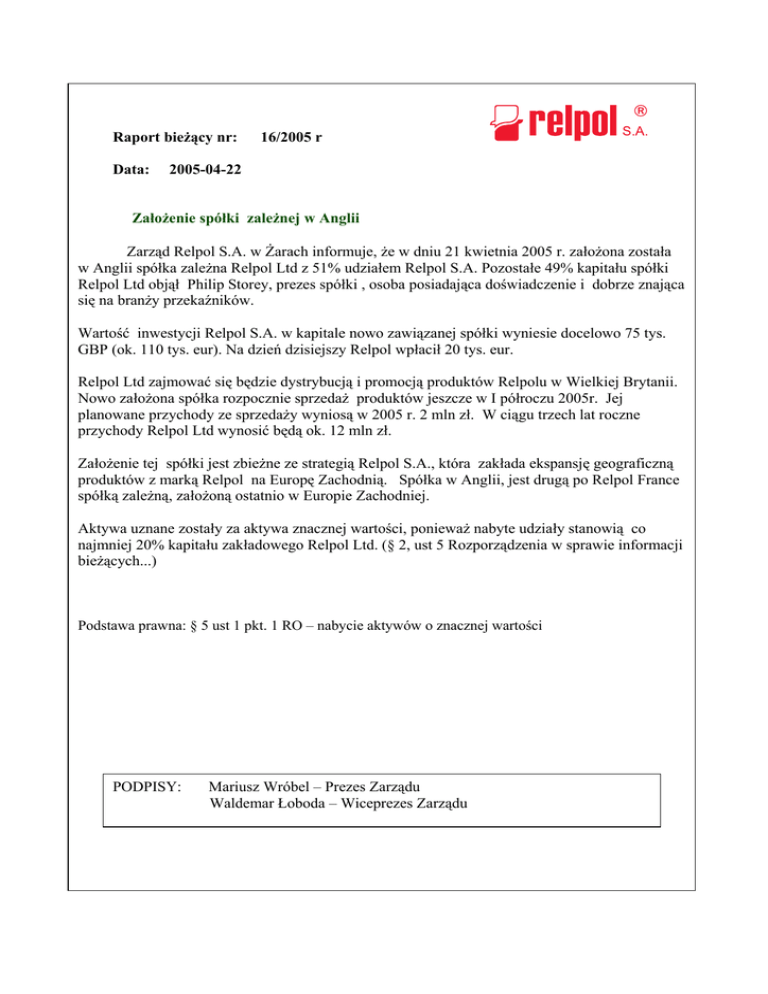 Raport bieżący nr: Data: 16/2005 r 2005-04-22 Założenie spółki zależnej w Anglii Zarząd Relpol S.A. w Żarach informuje, że w dniu 21 kwietnia 2005 r. założona została w Anglii spółka zależna Relpol Ltd z 51% udziałem Relpol S.A. Pozostałe 49% kapitału spółki Relpol Ltd objął Philip Storey, prezes spółki , osoba posiadająca doświadczenie i dobrze znająca się na branży przekaźników. Wartość inwestycji Relpol S.A. w kapitale nowo zawiązanej spółki wyniesie docelowo 75 tys. GBP (ok. 110 tys. eur). Na dzień dzisiejszy Relpol wpłacił 20 tys. eur. Relpol Ltd zajmować się będzie dystrybucją i promocją produktów Relpolu w Wielkiej Brytanii. Nowo założona spółka rozpocznie sprzedaż produktów jeszcze w I półroczu 2005r. Jej planowane przychody ze sprzedaży wyniosą w 2005 r. 2 mln zł. W ciągu trzech lat roczne przychody Relpol Ltd wynosić będą ok. 12 mln zł. Założenie tej spółki jest zbieżne ze strategią Relpol S.A., która zakłada ekspansję geograficzną produktów z marką Relpol na Europę Zachodnią. Spółka w Anglii, jest drugą po Relpol France spółką zależną, założoną ostatnio w Europie Zachodniej. Aktywa uznane zostały za aktywa znacznej wartości, ponieważ nabyte udziały stanowią co najmniej 20% kapitału zakładowego Relpol Ltd. (§ 2, ust 5 Rozporządzenia w sprawie informacji bieżących...) Podstawa prawna: § 5 ust 1 pkt. 1 RO – nabycie aktywów o znacznej wartości PODPISY: Mariusz Wróbel – Prezes Zarządu Waldemar Łoboda – Wiceprezes Zarządu