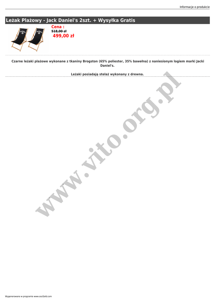 Informacje o produkcie Leżak Plażowy - Jack Daniel's 2szt. + Wysyłka Gratis Cena : 518,00 zł 499,00 zł Czarne leżaki plażowe wykonane z tkaniny Brogston (65% poliester, 35% bawełna) z naniesionym logiem marki Jacki Daniel's. w w w .v it o. or g. pl Leżaki posiadają stelaż wykonany z drewna. Wygenerowano w programie www.oscGold.com