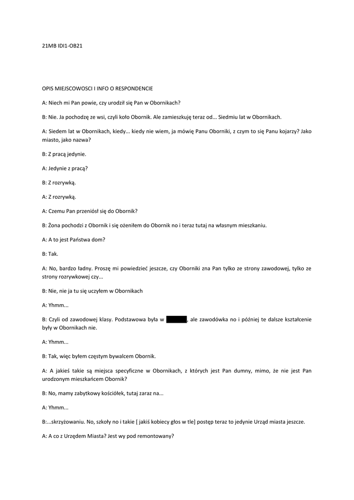 21MB IDI1-OB21 OPIS MIEJSCOWOSCI I INFO O RESPONDENCIE A: Niech mi Pan powie, czy urodził się Pan w Obornikach? B: Nie. Ja pochodzę ze wsi, czyli koło Obornik. Ale zamieszkuję teraz od... Siedmiu lat w Obornikach. A: Siedem lat w Obornikach, kiedy... kiedy nie wiem, ja mówię Panu Oborniki, z czym to się Panu kojarzy? Jako miasto, jako nazwa? B: Z pracą jedynie. A: Jedynie z pracą? B: Z rozrywką. A: Z rozrywką. A: Czemu Pan przeniósł się do Obornik? B: Żona pochodzi z Obornik i się ożeniłem do Obornik no i teraz tutaj na własnym mieszkaniu. A: A to jest Państwa dom? B: Tak. A: No, bardzo ładny. Proszę mi powiedzieć jeszcze, czy Oborniki zna Pan tylko ze strony zawodowej, tylko ze strony rozrywkowej czy... B: Nie, nie ja tu się uczyłem w Obornikach A: Yhmm... B: Czyli od zawodowej klasy. Podstawowa była w Kiszewie, ale zawodówka no i później te dalsze kształcenie były w Obornikach nie. A: Yhmm... B: Tak, więc byłem częstym bywalcem Obornik. A: A jakieś takie są miejsca specyficzne w Obornikach, z których jest Pan dumny, mimo, że nie jest Pan urodzonym mieszkańcem Obornik? B: No, mamy zabytkowy kościółek, tutaj zaraz na... A: Yhmm... B:...skrzyżowaniu. No, szkoły no i takie [ jakiś kobiecy głos w tle] postęp teraz to jedynie Urząd miasta jeszcze. A: A co z Urzędem Miasta? Jest wy pod remontowany? B: Yy.. No, no, no jest... po prostu... Tak teraz miałem problem z zarejestrowaniem kiedyś samochodu, tak teraz zatwierdza zarejestrowanie samochodu w piętnaście minut A: Nooo... no to jest różnica. A niech mi Pan powie czy ludzie w Obornikach są inni niż ludzie w Państwa, Pana miejscowości, w której się Pan urodził? Czy jak przeniósł się Pan tutaj zauważył Pan jakąś zmianę... B: Nooo... jest różnica. A: ...że jakoś się zmienili? A jacy są ludzie w Obornikach? B: No, na wsi to wiadomo są zawsze tacy... no, mniej przykładają uwagi do wyglądu i w ogóle nie. Nooo... w mieście jednak trzeba zawsze być ładnie ubranym. A: Czemu trzeba? B: No, tak wypada. A: A na wsi nie wypada? B: No też, ale tak jak już się mówi na tym, że... Na wsi to jest na wsi to jest inaczej. Tu się wyjdzie to zaraz wszyscy widzą, wiadomo. A: Mi się zawsze wydawało, że to na wsi właśnie jest jakaś taka większa kontrola ze strony otoczenia. B: Nie... to zależy jak tam się mieszka i gdzie się mieszka nie jeszcze... A: No właśnie... B: Jak się z sąsiadem ma. A: A tutaj jakich państwo macie sąsiadów? B: No, nie narzekam. A: Udało się zaprzyjaźnić z kimś z osiedla? B: Nooo, nie, tak, tutaj zaraz obok jest taki jest też fajny chłopak, kolega już teraz tak, że... A: Czyli jest Pan zadomowiony. B: Tak. A: A niech mi Pan powie, czym się zajmuje? B: Teraz? Pracuję fizycznie, jako ślusarz jestem nie. A: A co z Pana zawodem wyuczonym? B: Nie ja jestem mechanik samochodowy. A: A czemu nie jest Pan mechanikiem? B: No.. tak los potoczył.. A: A chciałby Pan? Wolałby Pan? B: no wiadomo, że własny warsztat zawsze można otworzyć nie. A: Czyli takie marzenie... B: no... a jak! A: No pewnie. B: W końcu mistrzem jestem nie. A: No szkoda by było, że by to gdzieś przepadło! A co Pan... co pańska żona robi? Czym się zajmuje? B: Teraz pracowała jako sprzedawczyni, A: Yhmm... B: Ale teraz akurat jest... okres ochronny czyli jest w ciąży. A: Jest w ciąży?! B: Nooo... A: To chyba jakiś wczesny etap? B: Nie.. to jest mmm... A: Zupełnie nie widać. B: To jest mmm... jak to się mówi nie studniówka ino.. przed co jest? Mmm... A: No chyba Panu nie pomogę… B: Mmmm.. jak to się.. poło.. nie! A: Połowinki?! B: Nie, nie... inaczej A: Nie studniówka nie połowinki, to nie wiem, co to może być. B: No dwadzieścia tygodni, czyli jest... półmetek tak jakby. A: Yhmm... I, i oprócz syna... i... a już wiecie państwo co to będzie? B: No dziecko. A: No dziecko to na pewno! Ale nie wiadomo jeszcze czy dziewczynka czy chłopiec? B: Nie, nie, nie chcemy nawet wiedzieć. A: Nie chcecie państwo. I rozumiem, że z dwójką prospektywnie, w przyszłości z dwójką dzieci Pan, żona i...? B: No i tutaj jest moja mama akurat teraz jeszcze zamieszkuje tutaj. A to tylko tak żeby pilnowała synka. A: Aha. Czyli taka... B: Niania. MAPA A: Niania. Czyli to jest ta cała Państwa, cała Państwa rodzina. No bardzo pięknie. Bardzo ładnie to wygląda. No dobrze to teraz przejdźmy do kwestii tutaj wstępnej. Nie powiem, że zasadniczej. Na pewno do wstępnej. Mam dla Pana takie zadanie, właśnie dosyć nietypowe. Trochę musi się Pan zastanowić nad tym. Wyobraźmy sobie, że ta kartka yhmm... jest to jakby Pana przestrzeń życiowa. To jest wszystko dla Pana, to jest Pan. Pan jest tą kropką. A tutaj mam listę taki bardzo ogólnych, podstawowych celów, dążeń życiowych. Takich do osiągnięcia. Jeśli tutaj Pan się im przyjrzy, może okazać się tak, że część z nich... nie będzie się Panu do końca podobała, z częścią nie będzie się Pan w ogóle utożsamiał. Natomiast, jeśli okaże się, ze jest coś ważnego w Pana życiu, a nie ma tego na tej liście tutaj są jeszcze cztery wolne pola może Pan sobie spokojnie coś dopisać. Na razie się niech Pan przeczyta, skomentuje. STRUKTURA ISTOTNOSCI B: Gdzie zdrowie? No podstawa. Chociaż mi trochę krzyże dolegają, ale chciałbym być zdrowy. A: Rozumiem. Przyklejać tutaj sobie wszystko ładnie. B: Życie zgodnie z wiarą, no oczywiście... Być użytecznym dla innych... No bez tego to ani by nie było pracy. Posiadanie władzy? Eee, władzy to aż tak nie trzeba... Posiadanie rodziny szczęśliwej, spokojne życie. Bogacenie się? No, pieniądze szczęścia nie dawają, ale bez nich jeszcze gorzej. A: To na pewno wymyślił to ktoś bogaty. B: Ja tak będę żartował nie, tam bycie wolnym no... być wolnym źle, ale być z żoną jeszcze gorzej jak się mówi A: Dobrze, że tak tylko się mówi. B: No, Podróżowanie?.. A: Czy jest tu coś? B: No, tak. A: 