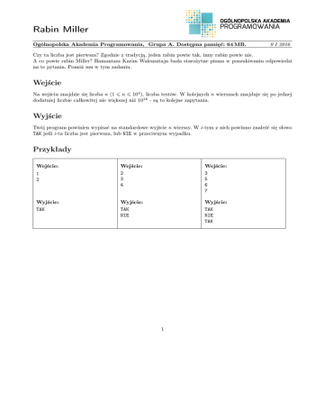 Rabin Miller Ogólnopolska Akademia Programowania, Grupa A. Dostępna pamięć: 64 MB. 9 I 2016 Czy ta liczba jest pierwsza? Zgodnie z tradycją, jeden rabin powie tak, inny rabin powie nie. A co powie rabin Miller? Hamantasz Karim Walensztajn bada starożytne pisma w poszukiwaniu odpowiedzi na te pytania. Pomóż mu w tym zadaniu. Wejście Na wejściu znajdzie się liczba n (1 6 n 6 104 ), liczba testów. W kolejnych n wierszach znajduje się po jednej dodatniej liczbie całkowitej nie większej niż 1018 - są to kolejne zapytania. Wyjście Twój program powinien wypisać na standardowe wyjście n wierszy. W i-tym z nich powinno znaleźć się słowo TAK jeśli i-ta liczba jest pierwsza, lub NIE w przeciwnym wypadku. Przykłady Wejście: 1 2 Wyjście: TAK Wejście: 2 3 4 Wejście: 3 5 6 7 Wyjście: TAK NIE Wyjście: TAK NIE TAK 1