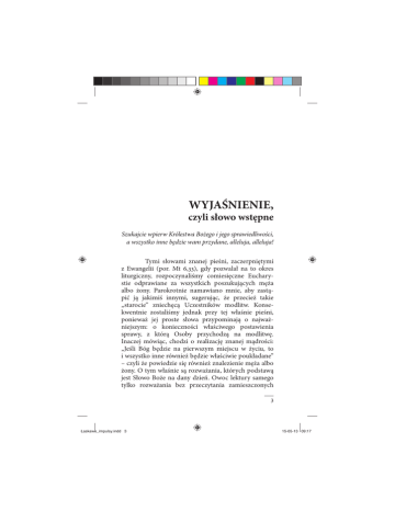 WYJAŚNIENIE, czyli słowo wstępne Szukajcie wpierw Królestwa Bożego i jego sprawiedliwości, a wszystko inne będzie wam przydane, alleluja, alleluja! Tymi słowami znanej pieśni, zaczerpniętymi z Ewangelii (por. Mt 6,33), gdy pozwalał na to okres liturgiczny, rozpoczynaliśmy comiesięczne Eucharystie odprawiane za wszystkich poszukujących męża albo żony. Parokrotnie namawiano mnie, aby zastąpić ją jakimiś innymi, sugerując, że przecież takie „starocie” zniechęcą Uczestników modlitw. Konsekwentnie zostaliśmy jednak przy tej właśnie pieśni, ponieważ jej proste słowa przypominają o najważniejszym: o konieczności właściwego postawienia sprawy, z którą Osoby przychodzą na modlitwę. Inaczej mówiąc, chodzi o realizację znanej mądrości: „Jeśli Bóg będzie na pierwszym miejscu w życiu, to i wszystko inne również będzie właściwie poukładane” – czyli że powiedzie się również znalezienie męża albo żony. O tym właśnie są rozważania, których podstawą jest Słowo Boże na dany dzień. Owoc lektury samego tylko rozważania bez przeczytania zamieszczonych 3 âaskawe_impulsy.indd 3 15-05-13 09:17 czytań mszalnych, do których odnosi się dana homilia, będzie dużo mniejszy. Niniejsza publikacja nie była planowana, i z pewnością nie doszłoby do niej, gdyby nie fakt, że bywałem pytany o możliwość uzyskania tekstu homilii, a po kilkunastu miesiącach obecny duszpasterz Osób poszukujących męża albo żony, Ojciec Robert Wawer SJ, zaskoczył mnie sugestią zebrania tych treści i wydania ich, za co niniejszym serdecznie Mu dziękuję. O tej publikacji nie byłoby mowy, podobnie jak i o Eucharystii w tej intencji, gdyby nie wydarzenie fundujące: w ciągu pierwszych kilku dni posługiwania w Sanktuarium przyszło na rozmowę duchową, niezależnie od siebie, kilkadziesiąt samotnych osób, młodych lub w średnim wieku (tak bywało z różnym natężeniem przez trzy lata). Szybko okazywało się, że często głównym problemem tych Osób była samotność i trudność odnalezienia „drugiej połowy”. Ponieważ była to właściwie moja pierwsza placówka, na której pracowałem duszpastersko jako niedawno wyświęcony ksiądz, po rozeznaniu, wykorzystując sprzyjające okoliczności, rozpoczęliśmy comiesięczne Eucharystie w intencji tych Osób. O tym, jak poważne było i jest zapotrzebowanie na modlitwę, duchowe wsparcie i towarzyszenie Osobom potrzebującym, może świadczyć frekwencja: przez dwadzieścia trzy kolejne miesiące, niezależnie od pogody (upał czy mróz, śnieg z deszczem czy susza), nigdy na tę Mszę św. (w każdy ostatni wtorek miesiąca o godzinie 20.00) nie przyszło mniej niż 200 Osób. Te fakty nie powinny dziwić, ponieważ jeszcze przed rozpoczęciem tego cyklu Eucharystii podczas sobotnich nabożeństw do Matki Bożej Łaskawej odczytywaliśmy intencje Wiernych, a wśród nich nierzadko prośby o dobrego męża albo o dobrą żonę, jak również podziękowania za znalezienie męża albo żony. Osoba, która szukałaby w tych tekstach oryginal4 âaskawe_impulsy.indd 4 15-05-13 09:17 nych konstrukcji czy specjalnych wrażeń, naraża się na rozczarowanie i zaśnięcie nad nimi (długie, ciężkawe, ze skandalicznie małą ilością życiowych przykładów). Na szczęście w Warszawie nie jest trudno w niedzielę trafić na kazanie, w którym znajduje się więcej efektownych przykładów niż we wszystkich zebranych tu homiliach razem wziętych. Biorąc więc pod uwagę fakt, iż pomimo takiego niezmienianego stylu przepowiadania na Mszach w intencji poszukujących męża albo żony przez ponad dwadzieścia miesięcy, niezależnie od pogody, utrzymywała się (i nadal się utrzymuje) stała frekwencja („pełen kościół”), wolno przypuszczać, że znaczna część Osób nie szuka samych estetycznych wrażeń, a prezentowane teksty mogą kogoś zainteresować. Najwidoczniej w Kościele jest miejsce na różne style, przy czym warto zadbać, aby w tej różnorodności nie zabrakło miejsca na to, co powinno być bardzo ludzkie – na myślenie – które niekiedy wydaje się zagrożone emocjonalnością (również ludzką). Prezentowane refleksje mają jasny cel: nie jest nim osiągnięcie natychmiastowej przyjemności (która n.b. z definicji wcale nie musi być czymś złym), ale pobudzenie do pracy intelektualnej. Oczekiwane jest zatem od Czytelnika zaangażowanie się we własne życie. Chodzi o ufne podjęcie dobrowolnej, świadomej i odpowiedzialnej decyzji o stałym pielęgnowaniu rozwijania się, aby nie wegetować w trwodze przed zmarnowaniem życia sobie i innym, a także aby uniknąć paraliżującego zniechęcenia z powodu dotychczasowych negatywnych doświadczeń. Niniejszym składam szczere wyrazy wdzięczności Osobom, z którymi mogłem współpracować w tym czasie. Serdecznie dziękuję Bratu Rafałowi Nierzwickiemu SJ, który swoją posługą w zakrystii Sanktuarium bardzo skutecznie i z życzliwą cierpliwością wspierał przedsięwzięcia organizowane dla Poszukujących. 5 âaskawe_impulsy.indd 5 15-05-13 09:17 Szczególne słowa podziękowania kieruję pod adresem Państwa Magdaleny i Adama Pietruchów, którzy jako wolontariusze wielkodusznie i profesjonalnie zainwestowali piękny wycinek życia w posługę Poszukującym prowadząc w podziemiach Sanktuarium spotkania formacyjno-rozwijające z serii Przyjemne pretexty po każdej z odprawionych Mszy w intencji poszukujących męża albo żony. Niniejszym serdecznie dziękuję Ojcu Superiorowi Wojciechowi Mikulskiemu SJ, duszpasterzowi grupy postakademickiej, który swoim talentem organizatorskim doprowadził do publikacji tych przemyśleń. 6 âaskawe_impulsy.indd 6 15-05-13 09:17
