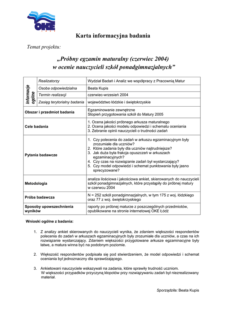 Karta informacyjna badania Temat projektu: Informacje ogólne „Próbny egzamin maturalny (czerwiec 2004) w ocenie nauczycieli szkół ponadgimnazjalnych” Realizatorzy Wydział Badań i Analiz we współpracy z Pracownią Matur Osoba odpowiedzialna Beata Kupis Termin realizacji czerwiec-wrzesień 2004 Zasięg terytorialny badania województwo łódzkie i świętokrzyskie Obszar i przedmiot badania Egzaminowanie zewnętrzne Stopień przygotowania szkół do Matury 2005 Cele badania 1. Ocena jakości próbnego arkusza maturalnego 2. Ocena jakości modelu odpowiedzi i schematu oceniania 3. Zebranie opinii nauczycieli o trudności zadań Pytania badawcze 1. Czy polecenia do zadań w arkuszu egzaminacyjnym były zrozumiałe dla uczniów? 2. Które zadania były dla uczniów najtrudniejsze? 3. Jak duża była frakcja opuszczeń w arkuszach egzaminacyjnych? 4. Czy czas na rozwiązanie zadań był wystarczający? 5. Czy model odpowiedzi i schemat punktowania były jasno sprecyzowane? Metodologia analiza ilościowa i jakościowa ankiet, skierowanych do nauczycieli szkół ponadgimnazjalnych, które przystąpiły do próbnej matury w czerwcu 2004 Próba badawcza N = 252 szkół ponadgimnazjalnych, w tym 175 z woj. łódzkiego oraz 77 z woj. świętokrzyskiego Sposoby upowszechnienia wyników raporty po próbnej maturze z poszczególnych przedmiotów, opublikowane na stronie internetowej OKE Łódź Wnioski ogólne z badania: 1. Z analizy ankiet skierowanych do nauczycieli wynika, że zdaniem większości respondentów polecenia do zadań w arkuszach egzaminacyjnych były zrozumiałe dla uczniów, a czas na ich rozwiązanie wystarczający. Zdaniem większości przygotowane arkusze egzaminacyjne były łatwe, a matura winna być na podobnym poziomie. 2. Większość respondentów podpisała się pod stwierdzeniem, że model odpowiedzi i schemat oceniania był jednoznaczny dla sprawdzającego. 3. Ankietowani nauczyciele wskazywali na zadania, które sprawiły trudność uczniom. W większości przypadków przyczyną kłopotów przy rozwiązywaniu zadań był niezrealizowany materiał. Sporządziła: Beata Kupis
