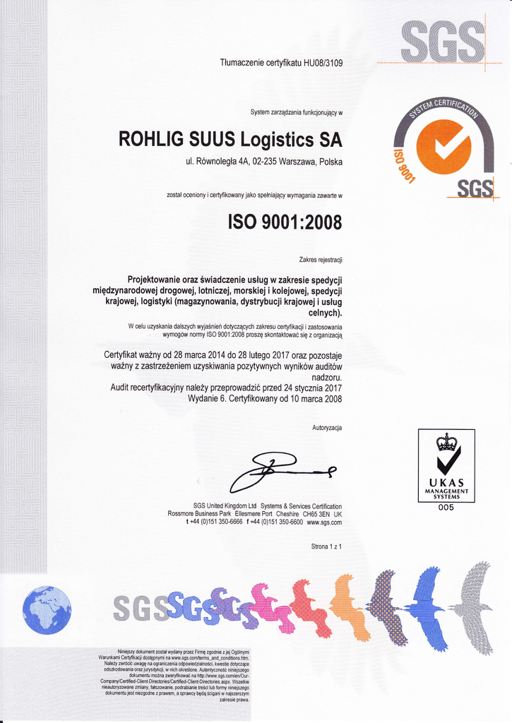 Tłumaczenie ceńyfikatu HU08/3 1 09 System zaządzania funkcjonu.jący w ROHLIG SUUS Logistics SA ul. Rownoległa 4A, 02-235 Warszawa, Polska został oceniony i ceńyfikowany jako spełniający wymagania zawańe w ISO 9001:2008 Zakres Ęestracji Projektowanie oraz świadczenie usług w zakresie spedycji międzynarodowej drogowej, lotn iczej, morskiej i kolejowej, spedycj i krajowej, logistyki (magazynowania, dystrybucji krajowej i usług celnych). W ce|u uzyskania dalszych wyjaśnień dotyczących zakresu certyfikacji i zastosowania wymogÓw normy lSo 9001:2008 proszę skontaktować się z organizacją Certyfikat wazny od 28 marca 2014 do 28 lutego 2017 oraz pozostaje Wazny z zastrzeŻeniem uzyskiwan a pozytywnyc h wyn i kÓw au d itow i nadzoru. Audit receńyfikacyjny naleŻy pzeprowadziÓ pzed 24 stycznia2017 Wydanie 6. Certyfrkowany od 10 marca 2008 Autoryzacja SGS United Kingdom Ltd Systems Rossmore Business Park E||esmere & Services Ceńification Poń Cheshire cH65 3EN UK t +44 (0)151 350-6666 f +44 (0)151 350-6600 www.sgs.com Strona'l z ffi@ Niniejszy dokumentzostałWydany przez Firmę zgodnie zjej 0gólnymi ceMkeji dostępnymi na M'sgs'mmńems-and-conditions.htrn' uwagę na ograniczenia odpowiedzialności' kwestie dotyczące odszkodowania oraziurysdykcji, w nich określone. Autentycznos niniejszego Warunkami Naleł rurociÓ dokurentu można eeMkowaĆ na http]iW'sgs'corven/ouF Company/Certilied-Client Dirtrtories/Certifed-ClientDirectories.aspl. Wszetkie nieautoryzowane zmiany, fałszowanie' podrabianie treści lub formy niniejszego dokumentu jest niezgodne z prawem' a sprilcy będąsigani W najszerszym zakresie prawa. 1 005