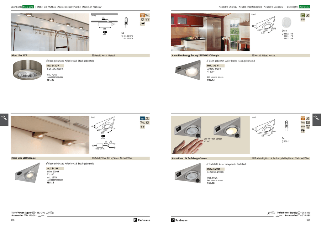 Möbel Ein-/Aufbau Meuble encastré/saillie Meubel in-/opbouw | Downlights Micro Line Downlights Micro Line | Möbel Ein-/Aufbau Meuble encastré/saillie Meubel in-/opbouw (mm) (mm) Halogen 12V 12V Energy Saver On/Off 23 R, C 44 178 ⌀66 G4 L 831.1510 W ⌀ 6 178 9 W 885.14 7 W 281.31 4 W 831.1720 W Micro Line 12V Micro Line Energy Saving 230V GX53 Triangle m Metall Métal Metaal f Eisen gebürstet Acier brossé Staal geborsteld GX53 L 883.23 m Metall Métal Metaal f Eisen gebürstet Acier brossé Staal geborsteld incl. 3×20 W 3×254 lm, 2900 K incl. 70 VA incl. 1×9 W 320 lm, 2700 K 5 100° EAN 4000870 984291 EAN 4000870 983430 984.29 983.43 (mm) (mm) LED Halogen 12V On/Off On/Off Stainless Steel 40 130 34 130 130 125 ⌀ 26 90 60 Sensor G4 L 831.17 Trafo 12V DC Micro Line LED Triangle m Metall/Glas Métal/Verre Metaal/Glas f Eisen gebürstet Acier brossé Staal geborsteld incl. 3×1 W 34 lm, 2700 K 5 120° incl. 12 VA EAN 4000870 985182 985.18 Trafo/Power Supply 6= 382-391 Accessories 6= 376-381 358 Micro Line 12V G4 Triangle Sensor m Edelstahl/Glas Acier inoxydable/Verre Edelstaal/Glas f Edelstahl Acier inoxydable Edelstaal incl. 3×20 W 3×254 lm, 2900 K incl. 60 VA EAN 4000870 935002 935.00 Trafo/Power Supply 6= 382-391 Accessories 6= 376-381 359