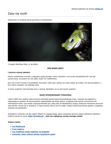 Artykuł pobrano ze strony eioba.pl Żaba się modli Zapraszam na kolejną porcję genialnych przypowieści Z książki Modlitwa Żaby, A. de Mello: MÓJ WUJEK JERZY I jeszcze więcej założeń: Pewne małżeństwo wracało z pogrzebu wujka Jerzego, który mieszkał z nimi przez dwadzieścia lat i był tak uprzykrzony, że prawie mu się udało rozbić ich małżeństwo. Jest coś o czym muszę Ci powiedzieć, kochanie, rzekł mąż. Gdyby nie moja miłość do Ciebie, nie wytrzymałbym, z tym twoim wujkiem, ani jednego dnia. Z moim wujkiem? wykrzyknęła żona z odrazą. Myślałam, że on jest twoim wujkiem. GŁÓD SPOWODOWANY POGŁOSKĄ Latem 1946 roku wzdłuż całej prowincji pewnego południowoamerykańskiego kraju, rozeszła się pogłoska o zagrażającym głodzie. W rzeczywistości zapowiadały się dobre zbiory, a pogoda była wprost wymarzona dla rekordowych żniw. Lecz wieść rozprzestrzeniała się z taką siłą, że dwadzieścia tysięcy drobnych farmerów porzuciło swą ziemię i skryło się w miastach. Z tego powodu zbiory się nie udały, tysiące ludzi przymierało głodem i pogłoska okazała się prawdziwa. Znalazłeś w artykule coś dla siebie? Wejdź na mojego bloga, gdzie znajdziesz jeszcze więcej ciekawych tekstów i krótkich porad na życie: http://brieftip.pl/ - stań się najlepszą wersją samego siebie Zobacz także: Lot Myśliwych Trzej mędrcy Czy modlitwa może wpływać na pogodę? Człowiek, który odkrył sztukę rozpalania ognia "Ojciec Zapomina" Adres do oryginalnego artykułu: http://brieftip.pl/2014/04/10/zaba-sie-modli/ Autor: Anthony de Mello Przedruk ze strony: http://brieftip.pl/2014/04/10/zaba-sie-modli/ Artykuł pobrano ze strony eioba.pl