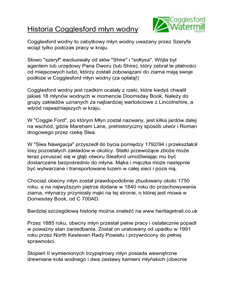 Historia Cogglesford młyn wodny Cogglesford wodny to zabytkowy młyn wodny uważany przez Szeryfa wciąż tylko podczas pracy w kraju. Słowo "szeryf" ewoluowały od słów "Shire" i "sołtysa". Wójta był agentem lub urzędowy Pana Dworu (lub Shire), który zebrał te płatności od miejscowych ludzi, którzy zostali zobowiązani do ziarna mają swoje podłoże w Cogglesford młyn wodny (za opłatą!) Cogglesford wodny jest rzadkim ocalały z rzeki, które kiedyś chwalił jakieś 18 młynów wodnych w momencie Doomsday Book. Należy do grupy zakładów uznanych za najbardziej wartościowe z Lincolnshire, a wśród najważniejszych w kraju. W "Coggle Ford", po którym Młyn został nazwany, jest kilka jardów dalej na wschód, gdzie Mareham Lane, prehistoryczny sposób utwór i Roman drogowego przez rzekę Slea. W "Slea Nawigacja" przyszedł do bycia pomiędzy 1792/94 i przekształcił losy pozostałych zakładów w okolicy. Statki przewożące zboże może teraz poruszać się w głąb otworu Sleaford umożliwiając mu być dostarczane bezpośrednio do młyna. Mąka i mączka może następnie być wytwarzane i transportowane luzem w całej sieci i poza nią. Chociaż obecny młyn został prawdopodobnie zbudowany około 1750 roku, a na najwyższym piętrze dodane w 1840 roku do przechowywania ziarna, młynarzy przyniosły mąki na tej stronie, o której jest mowa w Domesday Book, od C 700AD. Bardziej szczegółową historię można znaleźć na www.heritagetrail.co.uk Przez 1885 roku, obecny młyn przestał pełne pracy i ostatecznie popadł w poważny stan zaniedbania. Został on uratowany od upadku w 1991 roku przez North Kesteven Rady Powiatu i przywrócony do pełnej sprawności. Stopień II wymienionych trzypiętrowy młyn posiada wewnętrzne drewniane koła wodnego i dwa zestawy kamieni młyńskich (obecnie Derbyshire Grit kamienie), które zwiedzający mogą oglądać w pracy na specjalnych dni imprezy. Mąka razowa jest produkowany tak, jak byłoby to 200 lat temu, a kiedy frezowanie nie jest miejsce, materiały wideo z procesu może być nadal widoczne. Goście mogą zwiedzić fascynujące postacie i wydarzenia, które ukształtowały historię młyna, od jego początków anglosaskich do dzisiaj. Jedną z rzeczy, które fascynuje turystów jest graffiti zaznaczone na Mill część z nich pochodzi z 1663 roku! To była tradycja młynarzy, aby wyrzeźbić swoje nazwiska do starych drewnianych belek i ościeżnic. Nie wszystkie z nich są przestarzałe, ale w niektórych przypadkach, nazwy młynarzy i daty rzeźb są obecne. Możesz również dowiedzieć się oryginalne znaki liczenia w zewnętrznych kamiennych murów, gdzie młynarzy prowadzonego tally liczby worków ziarna są używane. Gdy ziarno jest podnoszony za pomocą mechanizmu wciągnik, na najwyższym piętrze, wspina się przez oryginalnych klapami kompletne z zawiasami oryginalnych skórzanych, które są ponad 160 lat. Wiele z oryginalnych cech Mill pozostają, a inne zostały starannie odrestaurowane.