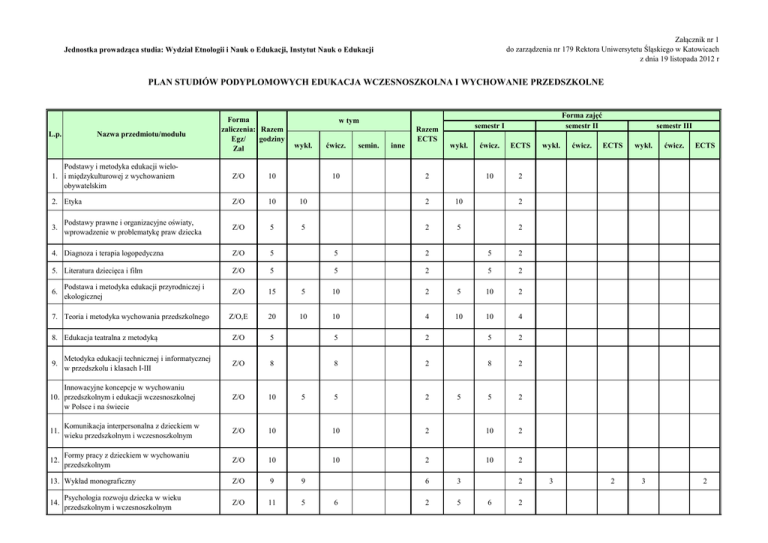 Załącznik nr 1 do zarządzenia nr 179 Rektora Uniwersytetu Śląskiego w Katowicach z dnia 19 listopada 2012 r Jednostka prowadząca studia: Wydział Etnologii i Nauk o Edukacji, Instytut Nauk o Edukacji PLAN STUDIÓW PODYPLOMOWYCH EDUKACJA WCZESNOSZKOLNA I WYCHOWANIE PRZEDSZKOLNE Nazwa przedmiotu/modułu L.p. Forma zaliczenia: Razem Egz/ godziny Zal w tym wykł. ćwicz. semin. inne Razem ECTS Forma zajęć semestr II semestr I wykł. ćwicz. ECTS 10 2 Podstawy i metodyka edukacji wielo1. i międzykulturowej z wychowaniem obywatelskim Z/O 10 2. Etyka Z/O 10 10 2 10 2 Z/O 5 5 2 5 2 4. Diagnoza i terapia logopedyczna Z/O 5 5 2 5 2 5. Literatura dziecięca i film Z/O 5 5 2 5 2 Z/O 15 5 10 2 5 10 2 Z/O,E 20 10 10 4 10 10 4 Z/O 5 5 2 5 2 Z/O 8 8 2 8 2 Z/O 10 5 2 5 2 3. 6. Podstawy prawne i organizacyjne oświaty, wprowadzenie w problematykę praw dziecka Podstawa i metodyka edukacji przyrodniczej i ekologicznej 7. Teoria i metodyka wychowania przedszkolnego 8. Edukacja teatralna z metodyką 9. Metodyka edukacji technicznej i informatycznej w przedszkolu i klasach I-III Innowacyjne koncepcje w wychowaniu 10. przedszkolnym i edukacji wczesnoszkolnej w Polsce i na świecie 10 5 2 5 11. Komunikacja interpersonalna z dzieckiem w wieku przedszkolnym i wczesnoszkolnym Z/O 10 10 2 10 2 12. Formy pracy z dzieckiem w wychowaniu przedszkolnym Z/O 10 10 2 10 2 Z/O 9 9 Z/O 11 5 13. Wykład monograficzny 14. Psychologia rozwoju dziecka w wieku przedszkolnym i wczesnoszkolnym 6 6 3 2 5 2 6 2 wykł. 3 ćwicz. semestr III ECTS wykł. 2 3 ćwicz. ECTS 2 L.p. 15. Nazwa przedmiotu/modułu Metodyka pracy wychowawczej w przedszkolu i edukacji wczesnoszkolnej Forma zaliczenia: Razem Egz/ godziny Zal w tym wykł. ćwicz. semin. inne Razem ECTS Forma zajęć semestr II semestr I wykł. ćwicz. ECTS wykł. semestr III ćwicz. ECTS Z/O 10 10 2 10 2 16. Warsztat pracy nauczyciela wychowawcy Z/O 10 10 2 10 2 17. Podstawy i metodyka edukacji plastycznej Z/O 15 10 2 10 2 5 5 wykł. ćwicz. ECTS 10 2 18. Wybrane metody i techniki formowania ceramiki artystycznej Z/O 9 9 2 9 2 19. Podstawy i metodyka zajęć muzyczno-ruchowych w przedszkolu i edukacji wczesnoszkolnej Z/O 10 10 3 10 3 20. Podstawy i metodyka edukacji zdrowotnej i ruchowej (wychowanie fizyczne) Z/O 15 10 3 10 3 21. Modele pracy zintegrowanej w wychowaniu przedszkolnym i edukacji wczesnoszkolnej Z/O 10 10 3 10 3 Profilaktyka i terapia zaburzeń emocjonalnych 22. dziecka w wieku przedszkolnym i wczesnoszkolnym Z/O 10 10 2 10 2 Wspomaganie rozwoju dziecka ze specjalnymi potrzebami edukacyjnymi Z/O 10 10 2 10 2 24. Podstawy i metodyka edukacji polonistycznej Z/O 20 15 4 15 4 25. Diagnozowanie sytuacji i potrzeb dziecka Z/O 10 10 2 Z/O,E 15 5 10 4 5 10 4 Z/O 10 4 6 2 4 6 2 28. Projektowanie edukacyjne i warsztaty z integracji Z/O 10 10 2 10 2 29. Podstawy i metodyka edukacji matematycznej Z/O 20 10 4 10 4 10 2 10 2 23. 26. Metodyka edukacji wczesnoszkolnej 27. Technologia informatyczna w nauczaniu dzieci w wieku przedszkolnym i wczesnoszkolnym 30. Profilaktyka z elementami poradnictwa i wczesnej interwencji Z/O 10 31. Programy i podręczniki w wychowaniu przedszkolnym i wczesnoszkolnym Z/O 5 32. Edukacja społeczna, wychowanie do zgodnego wspóldziałania Z/O 8 5 5 10 5 2 8 1 5 5 10 5 2 8 1 L.p. Forma zaliczenia: Razem Egz/ godziny Zal Nazwa przedmiotu/modułu Wspomaganie dzieci w rozwoju uzdolnień, 33. czynności intelektualnych i umiejętności uczenia się Z/O 8 34. Seminarium dyplomowe Z/O 10 Z/O 150 Praktyka pedagogiczna Razem: 508 Liczba godzin w semestrze w tym wykł. ćwicz. semin. 8 10 150 88 410 inne Razem ECTS Forma zajęć semestr II semestr I wykł. ćwicz. ćwicz. ECTS 2 8 2 4 10 4 75 3 157 30 ECTS wykł. ćwicz. 6 10 semestr III 90 43 84 30 127 18 197 ECTS 75 3 179 30 wykł. 27 184 Plan studiów zatwierdzony przez Radę Wydziału/Radę Naukową w dniu ………....……………… ………………………………………………………… (podpis i pieczęć Kierownik studiów podyplomowych Edukacja Wczesnoszkolna i Wychowanie Przedszkolne) ………………………………………………… (podpis i pieczęć Kierownika jednostki prowadzącej studia)