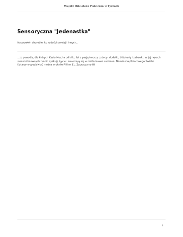 Miejska Biblioteka Publiczna w Tychach Sensoryczna "Jedenastka" Na przekór chorobie, ku radości swojej i innych... ...to powody, dla których Kasia Mucha od kilku lat z pasją tworzy ozdoby, dodatki, biżuterię i zabawki. W jej rękach skrawki barwnych tkanin zyskują życie i zmieniają się w materiałowe cudeńka. Namiastkę Kolorowego Świata Katarzyny podziwiać można w oknie Filii nr 11. Zapraszamy!!! 1