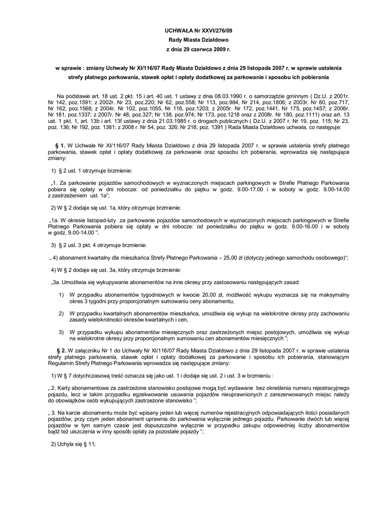 UCHWAŁA Nr XXVI/276/09 Rady Miasta Działdowo z dnia 29 czerwca 2009 r. w sprawie : zmiany Uchwały Nr XI/116/07 Rady Miasta Działdowo z dnia 29 listopada 2007 r. w sprawie ustalenia strefy płatnego parkowania, stawek opłat i opłaty dodatkowej za parkowanie i sposobu ich pobierania Na podstawie art. 18 ust. 2 pkt. 15 i art. 40 ust. 1 ustawy z dnia 08.03.1990 r. o samorządzie gminnym ( Dz.U. z 2001r. Nr 142, poz.1591; z 2002r. Nr 23, poz.220; Nr 62, poz.558; Nr 113, poz.984, Nr 214, poz.1806; z 2003r. Nr 80, poz.717, Nr 162, poz.1568; z 2004r. Nr 102, poz.1055, Nr 116, poz.1203; z 2005r. Nr 172, poz.1441, Nr 175, poz.1457; z 2006r. Nr 181, poz.1337; z 2007r. Nr 48, poz.327; Nr 138, poz.974; Nr 173, poz.1218 oraz z 2008r. Nr 180, poz.1111) oraz art. 13 ust. 1 pkt. 1, art. 13b i art. 13f ustawy z dnia 21.03.1985 r. o drogach publicznych ( Dz.U. z 2007 r. Nr 19, poz. 115; Nr 23, poz. 136; Nr 192, poz. 1381; z 2008 r. Nr 54, poz. 326; Nr 218, poz. 1391 ) Rada Miasta Działdowo uchwala, co następuje: § 1. W Uchwale Nr XI/116/07 Rady Miasta Działdowo z dnia 29 listopada 2007 r. w sprawie ustalenia strefy płatnego parkowania, stawek opłat i opłaty dodatkowej za parkowanie oraz sposobu ich pobierania, wprowadza się następujące zmiany: 1) § 2 ust. 1 otrzymuje brzmienie: „1. Za parkowanie pojazdów samochodowych w wyznaczonych miejscach parkingowych w Strefie Płatnego Parkowania pobiera się opłaty w dni robocze: od poniedziałku do piątku w godz. 9.00-17.00 i w soboty w godz. 9.00-14.00 z zastrzeżeniem ust. 1a”; 2) W § 2 dodaje się ust. 1a, który otrzymuje brzmienie: „1a. W okresie listopad-luty za parkowanie pojazdów samochodowych w wyznaczonych miejscach parkingowych w Strefie Płatnego Parkowania pobiera się opłaty w dni robocze: od poniedziałku do piątku w godz. 9.00-16.00 i w soboty w godz. 9.00-14.00 ”; 3) § 2 ust. 3 pkt. 4 otrzymuje brzmienie: „ 4) abonament kwartalny dla mieszkańca Strefy Płatnego Parkowania – 25,00 zł (dotyczy jednego samochodu osobowego)“; 4) W § 2 dodaje się ust. 3a, który otrzymuje brzmienie: „3a. Umożliwia się wykupywanie abonamentów na inne okresy przy zastosowaniu następujących zasad: 1) W przypadku abonamentów tygodniowych w kwocie 20,00 zł, możliwość wykupu wyznacza się na maksymalny okres 3 tygodni przy proporcjonalnym sumowaniu ceny abonamentu, 2) W przypadku kwartalnych abonamentów mieszkańca, umożliwia się wykup na wielokrotne okresy przy zachowaniu zasady wielokrotności okresów kwartalnych i cen, 3) W przypadku wykupu abonamentów miesięcznych oraz zastrzeżonych miejsc postojowych, umożliwia się wykup na wielokrotne okresy przy proporcjonalnym sumowaniu cen abonamentów miesięcznych ”; § 2. W załączniku Nr 1 do Uchwały Nr XI/116/07 Rady Miasta Działdowo z dnia 29 listopada 2007 r. w sprawie ustalenia strefy płatnego parkowania, stawek opłat i opłaty dodatkowej za parkowanie i sposobu ich pobierania, stanowiącym Regulamin Strefy Płatnego Parkowania wprowadza się następujące zmiany: 1) W § 7 dotychczasową treść oznacza się jako ust. 1 i dodaje się ust. 2 i ust. 3 w brzmieniu : „ 2. Karty abonamentowe za zastrzeżone stanowisko postojowe mogą być wydawane bez określenia numeru rejestracyjnego pojazdu, lecz w takim przypadku egzekwowanie usuwania pojazdów nieuprawnionych z zarezerwowanych miejsc należy do obowiązków osób wykupujących zastrzeżone stanowisko ”; „ 3. Na karcie abonamentu może być wpisany jeden lub więcej numerów rejestracyjnych odpowiadających ilości posiadanych pojazdów, przy czym jeden abonament uprawnia do parkowania wyłącznie jednego pojazdu. Parkowanie dwóch lub więcej pojazdów w tym samym czasie jest dopuszczalne wyłącznie w przypadku zakupu odpowiedniej liczby abonamentów bądź też uiszczenia w inny sposób opłaty za pozostałe pojazdy ”; 2) Uchyla się § 11; 3) § 14 otrzymuje brzmienie: „§ 14 W przypadku stwierdzenia przez służbę parkingową nieopłacenia postoju w SPP wystawia się zawiadomienie, a kierujący pojazdem obowiązany jest wnieść opłatę w formie ryczałtu w wysokości 20,- zł. Powyższe obowiązuje, jeśli kierujący zgłosi się w BSPP w terminie 2 dni następujących po dniu wystawienia zawiadomienia z wyłączeniem niedziel i świąt i uiści opłatę gotówkową, lub bez konieczności zgłoszenia się w BSPP w tym samym terminie uiści opłatę przelewem (za zachowanie terminu przy tej formie płatności przyjmuje się datę zlecenia przelewu) ”; 4) § 15 otrzymuje brzmienie: „§ 15 Po bezskutecznym upływie terminu określonego w § 14 opłata dodatkowa wynosi 40,- zł ”; 5) § 18 otrzymuje brzmienie: „ § 18 Opłatę dodatkową należy anulować, jeżeli kierowca pojazdu, który otrzymał informację stwierdzającą nieuiszczenie opłaty za parkowanie udowodni wymienionym biletem parkingowym, że zmieścił się w czasie 10 minut przeznaczonym na zakup biletu ”. § 3. Wykonanie Uchwały powierza się Burmistrzowi Miasta Działdowo. § 4. Uchwała wchodzi w życie po upływie 14 dni od dnia ogłoszenia w Dzienniku Urzędowym Województwa WarmińskoMazurskiego, ze skutkiem od dnia 1 września 2009 r. Przewodnicząca Rady Teresa BARTKOWSKA-FURTAK