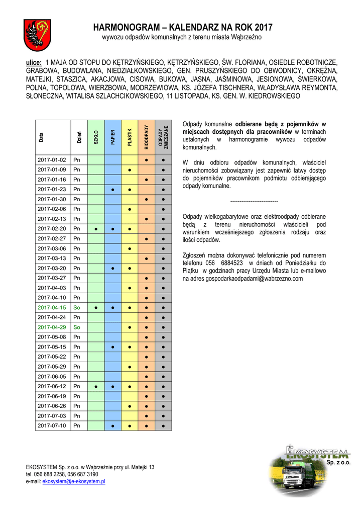 HARMONOGRAM – KALENDARZ NA ROK 2017 wywozu odpadów komunalnych z terenu miasta Wąbrzeźno 2017-01-09 Pn 2017-01-16 Pn 2017-01-23 Pn 2017-01-30 Pn 2017-02-06 Pn 2017-02-13 Pn 2017-02-20 Pn 2017-02-27 Pn 2017-03-06 Pn 2017-03-13 Pn 2017-03-20 Pn 2017-03-27 Pn 2017-04-03 Pn 2017-04-10 Pn 2017-04-15 So 2017-04-24 Pn 2017-04-29 So 2017-05-08 Pn 2017-05-15 Pn 2017-05-22 Pn 2017-05-29 Pn 2017-06-05 Pn 2017-06-12 Pn 2017-06-19 Pn 2017-06-26 Pn 2017-07-03 Pn 2017-07-10 Pn PLASTIK PAPIER ODPADY ZMIESZANE Pn BIOODPADY 2017-01-02 SZKŁO Dzień Data ulice: 1 MAJA OD STOPU DO KĘTRZYŃSKIEGO, KĘTRZYŃSKIEGO, ŚW. FLORIANA, OSIEDLE ROBOTNICZE, GRABOWA, BUDOWLANA, NIEDZIAŁKOWSKIEGO, GEN. PRUSZYŃSKIEGO DO OBWODNICY, OKRĘŻNA, MATEJKI, STASZICA, AKACJOWA, CISOWA, BUKOWA, JASNA, JAŚMINOWA, JESIONOWA, ŚWIERKOWA, POLNA, TOPOLOWA, WIERZBOWA, MODRZEWIOWA, KS. JÓZEFA TISCHNERA, WŁADYSŁAWA REYMONTA, SŁONECZNA, WITALISA SZLACHCIKOWSKIEGO, 11 LISTOPADA, KS. GEN. W. KIEDROWSKIEGO ● ● ● ● ● ● ● ● ● ● ● ● ● ● ● ● ● ● ● ● ● ● ● ● ● ● ● ● ● ● ● ● ● ● ● ● W dniu odbioru odpadów komunalnych, właściciel nieruchomości zobowiązany jest zapewnić łatwy dostęp do pojemników pracownikom podmiotu odbierającego odpady komunalne. -------------------------- ● ● ● ● Odpady komunalne odbierane będą z pojemników w miejscach dostępnych dla pracowników w terminach ustalonych w harmonogramie wywozu odpadów komunalnych. ● ● ● ● ● ● ● ● ● ● ● ● ● ● ● ● ● ● ● ● ● ● ● ● ● ● ● ● ● ● ● ● ● ● EKOSYSTEM Sp. z o.o. w Wąbrzeźnie przy ul. Matejki 13 tel. 056 688 2258, 056 687 3190 e-mail: [email protected] Odpady wielkogabarytowe oraz elektroodpady odbierane będą z terenu nieruchomości właścicieli pod warunkiem wcześniejszego zgłoszenia rodzaju oraz ilości odpadów. Zgłoszeń można dokonywać telefonicznie pod numerem telefonu 056 6884523 w dniach od Poniedziałku do Piątku w godzinach pracy Urzędu Miasta lub e-mailowo na adres [email protected] HARMONOGRAM – KALENDARZ NA ROK 2017 2017-07-24 Pn 2017-07-31 Pn 2017-08-07 Pn 2017-08-14 Pn 2017-08-21 Pn 2017-08-28 Pn 2017-09-04 Pn 2017-09-11 Pn 2017-09-18 Pn 2017-09-25 Pn 2017-10-02 Pn 2017-10-09 Pn 2017-10-16 Pn 2017-10-23 Pn 2017-10-27 Pt 2017-11-06 Pn 2017-11-13 Pn 2017-11-20 Pn 2017-11-27 Pn 2017-12-04 Pn 2017-12-11 Pn 2017-12-18 Pn 2017-12-23 So PLASTIK PAPIER ● ● ● ● ● ● ● ● ● ● ● ● ● ODPADY ZMIESZANE Pn BIOODPADY 2017-07-17 SZKŁO Dzień Data wywozu odpadów komunalnych z terenu miasta Wąbrzeźno ● ● ● ● ● ● ● ● ● ● ● ● ● ● ● ● ● ● ● ● ● ● ● ● ● ● ● ● ● ● ● ● ● ● ● ● ● ● ● ● ● ● ● ● ● ● ● ● ● EKOSYSTEM Sp. z o.o. w Wąbrzeźnie przy ul. Matejki 13 tel. 056 688 2258, 056 687 3190 e-mail: [email protected] ● ● Odpady komunalne odbierane będą z pojemników w miejscach dostępnych dla pracowników w terminach ustalonych w harmonogramie wywozu odpadów komunalnych. W dniu odbioru odpadów komunalnych, właściciel nieruchomości zobowiązany jest zapewnić łatwy dostęp do pojemników pracownikom podmiotu odbierającego odpady komunalne. -------------------------Odpady wielkogabarytowe oraz elektroodpady odbierane będą z terenu nieruchomości właścicieli pod warunkiem wcześniejszego zgłoszenia rodzaju oraz ilości odpadów. Zgłoszeń można dokonywać telefonicznie pod numerem telefonu 056 6884523 w dniach od Poniedziałku do Piątku w godzinach pracy Urzędu Miasta lub e-mailowo na adres [email protected] . HARMONOGRAM – KALENDARZ NA ROK 2017 wywozu odpadów komunalnych z terenu miasta Wąbrzeźno 2017-01-10 Wt 2017-01-17 Wt 2017-01-24 Wt 2017-01-31 Wt 2017-02-07 Wt 2017-02-14 Wt 2017-02-21 Wt 2017-02-28 Wt 2017-03-07 Wt 2017-03-14 Wt 2017-03-21 Wt 2017-03-28 Wt 2017-04-04 Wt 2017-04-11 Wt 2017-04-18 Wt 2017-04-25 Wt 2017-05-02 Wt 2017-05-09 Wt 2017-05-16 Wt 2017-05-23 Wt 2017-05-30 Wt 2017-06-06 Wt 2017-06-13 Wt 2017-06-20 Wt 2017-06-27 Wt 2017-07-04 Wt 2017-07-11 Wt PLASTIK PAPIER ODPADY ZMIESZANE Wt BIOODPADY 2017-01-03 SZKŁO Dzień Data ulice: 1 MAJA OD STOPU DO RYNKU, PONIATOWSKIEGO, PARTYZANTA, MESTWINA OD 1 MAJA DO KOPERNIKA, CHEŁMIŃSKA, MIKOŁAJA Z RYŃSKA, JEZIORNA, ŻEGLARSKA, TOWARZYSTWA JASZCZURCZEGO, PRZEJAZDOWA, NADBRZEŻNA, DOLNA, PODGÓRNA, GÓRNA, LEGIONISTÓW, 26 STYCZNIA, ŻEROMSKIEGO, DĄBROWSKIEGO, MARII KONOPNICKIEJ ● ● ● ● ● ● ● ● ● ● ● ● ● ● ● ● ● ● ● ● ● ● ● ● ● ● ● ● ● ● ● ● ● ● ● ● W dniu odbioru odpadów komunalnych, właściciel nieruchomości zobowiązany jest zapewnić łatwy dostęp do pojemników pracownikom podmiotu odbierającego odpady komunalne. -------------------------- ● ● ● ● Odpady komunalne odbierane będą z pojemników w miejscach dostępnych dla pracowników w terminach ustalonych w harmonogramie wywozu odpadów komunalnych. ● ● ● ● ● ● ● ● ● ● ● ● ● ● ● ● ● ● ● ● ● ● ● ● ● ● ● ● ● ● ● ● ● ● EKOSYSTEM Sp. z o.o. w Wąbrzeźnie przy ul. Matejki 13 tel. 056 688 2258, 056 687 3190 e-mail: [email protected] Odpady wielkogabarytowe oraz elektroodpady odbierane będą z terenu nieruchomości właścicieli pod warunkiem wcześniejszego zgłoszenia rodzaju oraz ilości odpadów. Zgłoszeń można dokonywać telefonicznie pod numerem telefonu 056 6884523 w dniach od Poniedziałku do Piątku w godzinach pracy Urzędu Miasta lub e-mailowo na adres [email protected] . HARMONOGRAM – KALENDARZ NA ROK 2017 2017-07-25 Wt 2017-08-01 Wt 2017-08-08 Wt 2017-08-16 Śr 2017-08-22 Wt 2017-08-29 Wt 2017-09-05 Wt 2017-09-12 Wt 2017-09-19 Wt 2017-09-26 Wt 2017-10-03 Wt 2017-10-10 Wt 2017-10-17 Wt 2017-10-24 Wt 2017-10-30 Pn 2017-11-07 Wt 2017-11-14 Wt 2017-11-21 Wt 2017-11-28 Wt 2017-12-05 Wt 2017-12-