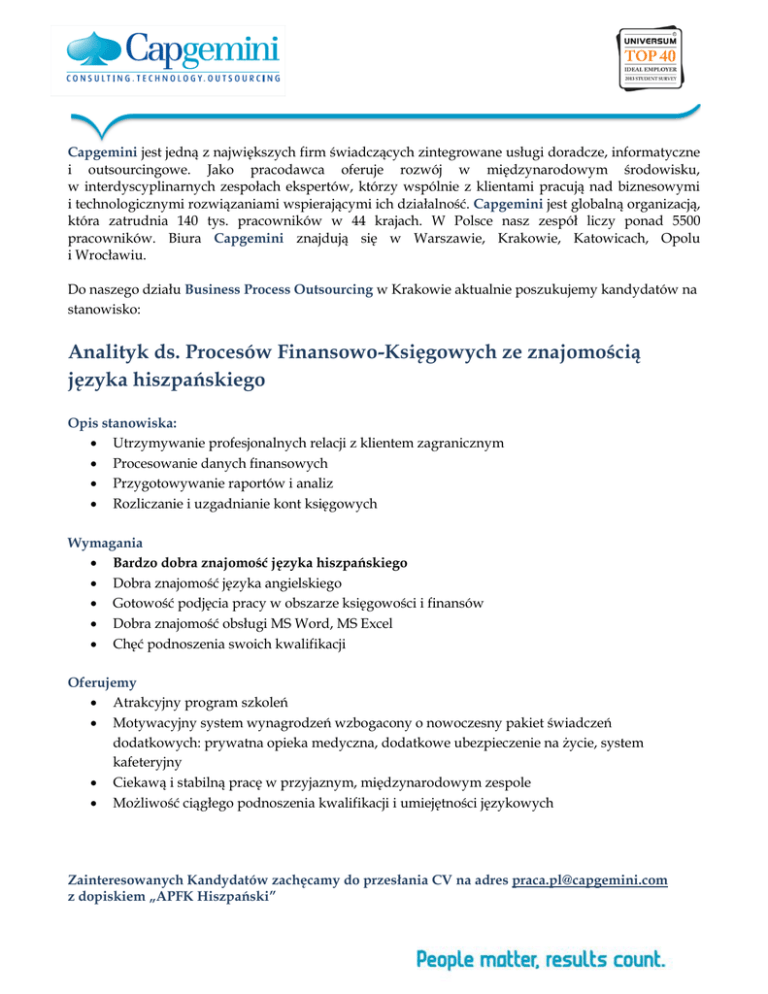 Capgemini jest jedną z największych firm świadczących zintegrowane usługi doradcze, informatyczne i outsourcingowe. Jako pracodawca oferuje rozwój w międzynarodowym środowisku, w interdyscyplinarnych zespołach ekspertów, którzy wspólnie z klientami pracują nad biznesowymi i technologicznymi rozwiązaniami wspierającymi ich działalność. Capgemini jest globalną organizacją, która zatrudnia 140 tys. pracowników w 44 krajach. W Polsce nasz zespół liczy ponad 5500 pracowników. Biura Capgemini znajdują się w Warszawie, Krakowie, Katowicach, Opolu i Wrocławiu. Do naszego działu Business Process Outsourcing w Krakowie aktualnie poszukujemy kandydatów na stanowisko: Analityk ds. Procesów Finansowo-Księgowych ze znajomością języka hiszpańskiego Opis stanowiska: Utrzymywanie profesjonalnych relacji z klientem zagranicznym Procesowanie danych finansowych Przygotowywanie raportów i analiz Rozliczanie i uzgadnianie kont księgowych Wymagania Bardzo dobra znajomość języka hiszpańskiego Dobra znajomość języka angielskiego Gotowość podjęcia pracy w obszarze księgowości i finansów Dobra znajomość obsługi MS Word, MS Excel Chęć podnoszenia swoich kwalifikacji Oferujemy Atrakcyjny program szkoleń Motywacyjny system wynagrodzeń wzbogacony o nowoczesny pakiet świadczeń dodatkowych: prywatna opieka medyczna, dodatkowe ubezpieczenie na życie, system kafeteryjny Ciekawą i stabilną pracę w przyjaznym, międzynarodowym zespole Możliwość ciągłego podnoszenia kwalifikacji i umiejętności językowych Zainteresowanych Kandydatów zachęcamy do przesłania CV na adres [email protected] z dopiskiem „APFK Hiszpański”