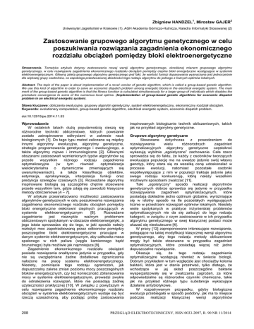 Zbigniew HANDZEL1, Mirosław GAJER2 Uniwersytet Jagielloński w Krakowie (1), AGH Akademia Górniczo-Hutnicza, Katedra Informatyki Stosowanej (2) Zastosowanie grupowego algorytmu genetycznego w celu poszukiwania rozwiązania zagadnienia ekonomicznego rozdziału obciążeń pomiędzy bloki elektroenergetyczne Streszczenie. Tematyka artykułu dotyczy zastosowania nowej wersji algorytmu genetycznego, określanej mianem grupowego algorytmu genetycznego, w celu rozwiązania zagadnienia ekonomicznego rozdziału obciążeń pomiędzy cieplne bloki energetyczne występujące w systemie elektroenergetycznym. Główną zaletą grupowego algorytmu genetycznego jest fakt, że wartość funkcji dopasowania wyznaczana jest jednocześnie dla większej grupy osobników, co zapobiega przedwczesnej zbieżności tego rodzaju algorytmu do jednego z licznych optimów lokalnych. Abstract. The topic of the paper is about implementation of a novel version of genetic algorithm, which is called a group-based genetic algorithm. We use this kind of algorithm in order to solve an economic dispatch problem among energetic blocks in the electrical energetic system. The main merit of the group-based genetic algorithm is that the fitness function is calculated simultaneously for a larger group of individuals which disables the premature convergence to some of the numerous local optima. (Implementation of group-based genetic algorithms for economic dispatch problem in an electrical energetic system). Słowa kluczowe: obliczenia ewolucyjne, grupowy algorytm genetyczny, system elektroenergetyczny, ekonomiczny rozdział obciążeń. Keywords: evolutionary computation, group-based genetic algorithm, electrical energetic system, economic dispatch problem. doi:10.12915/pe.2014.11.53 Wprowadzenie W ostatnich latach dużą popularnością cieszą się różnorodne techniki obliczeniowe, których powstanie zostało zainspirowane odkryciami w zakresie nauk biologicznych [1]. Do tego typu metod zaliczane są między innymi algorytmy ewolucyjne, algorytmy genetyczne, strategie programowania genetycznego i ewolucyjnego, a także algorytmy rojowe i immunologiczne [2]. Głównymi obszarami zastosowań wymienionych typów algorytmów są przede wszystkim różnego rodzaju zagadnienia optymalizacyjne (w tym również optymalizacja wielokryterialna o dynamicznie zmieniających się uwarunkowaniach), a także klasyfikacja obiektów, estymacja, aproksymacja, interpolacja funkcji oraz predykcja szeregów czasowych [3]. Rozważane algorytmy inspirowane biologią są szczególnie chętnie stosowane przede wszystkim tam, gdzie zdają się zawodzić klasyczne metody obliczeniowe [4 – 7]. W artykule przeanalizowano możliwości zastosowania algorytmów genetycznych w celu poszukiwania rozwiązania zagadnienia ekonomicznego rozdziału obciążeń pomiędzy bloki energetyczne elektrowni cieplnych pracujących w systemie elektroenergetycznym [8]. Rozważane zagadnienie jest niezwykle ważnym problemem obliczeniowym spotykanym w obszarze elektroenergetyki, a jego istota sprowadza się do tego, w jaki sposób należy rozłożyć moc zapotrzebowaną przez odbiorców pomiędzy poszczególne bloki elektroenergetyczne pracujące w danym systemie elektroenergetycznym, aby całkowita masa spalonego w nich paliwa (węgla kamiennego bądź brunatnego) była możliwie jak najmniejsza [9]. Zagadnienie ekonomicznego rozdziału obciążeń posiada rozwiązania analityczne jedynie w przypadku, gdy nie są uwzględniane żadne dodatkowe ograniczenia nałożone na pracę systemu elektroenergetycznego. Niestety, pominięcie tego rodzaju ograniczeń, jak dopuszczalny zakres zmian poziomu mocy poszczególnych bloków energetycznych, czy też konieczność zbilansowania mocy w systemie elektroenergetycznym, prowadzi zwykle do odnalezienia rozwiązań, które nie posiadają żadnej użyteczności praktycznej [10]. W związku z powyższym w celu rozwiązania zagadnienia ekonomicznego rozdziału obciążeń w systemie elektroenergetycznym wydaje się być rzeczą uzasadnioną, aby podając próbę zastosowania 208 inspirowanych biologicznie technik obliczeniowych, takich jak na przykład algorytmy genetyczne. Grupowe algorytmy genetyczne Stosowane dotychczas z powodzeniem do rozwiązywania wielu różnorodnych zagadnień optymalizacyjnych algorytmy genetyczne częstokroć wykazują wybitnie „egoistyczne” zachowanie. Cała rzecz sprowadza się do faktu, że każdy z osobników tworzących ewoluująca populację ma na uwadze jedynie swój własny genotyp, który stara się za wszelką cenę udoskonalać w procesie ewolucji, natomiast pozostałe osobniki współwystępujące z nim w populacji traktuje jedynie jako swego rodzaju konkurencję, którą należy wszelkimi możliwymi sposobami zwalczać [11]. Taki „egoistyczny” sposób realizacji algorytmów genetycznych dobrze sprawdza się jedynie w przypadku rozwiązywania zagadnień optymalizacyjnych, które posiadają dokładnie jedno optimum globalne, wyróżniające się w istotny sposób na tle pozostałych występujących licznie w przestrzeni rozwiązań optimów lokalnych. Niestety wiele spotykanych w praktyce inżynierskiej problemów optymalizacyjnych nie da się zaliczyć do tego rodzaju kategorii, w związku z czym zastosowanie w ich przypadku algorytmu genetycznego w swej klasycznej postaci może okazać się nieskuteczne [4]. W pracy [12] zaproponowano interesujące rozwiązanie, polegające na takiej modyfikacji klasycznej wersji algorytmu genetycznego, aby tego rodzaju metody obliczeniowe mogły być także stosowane w przypadku zagadnień optymalizacyjnych, które posiadają więcej niż jedno dopuszczalne rozwiązanie. Okazuje się, że tego rodzaju zagadnienia optymalizacyjne występują również w świecie biologii. Dobrym przykładem w tym względzie jest chociażby kolonia bakterii, która jest w stanie przetrwać, tylko dlatego, że wchodzące w jej skład poszczególne bakterie wyspecjalizował