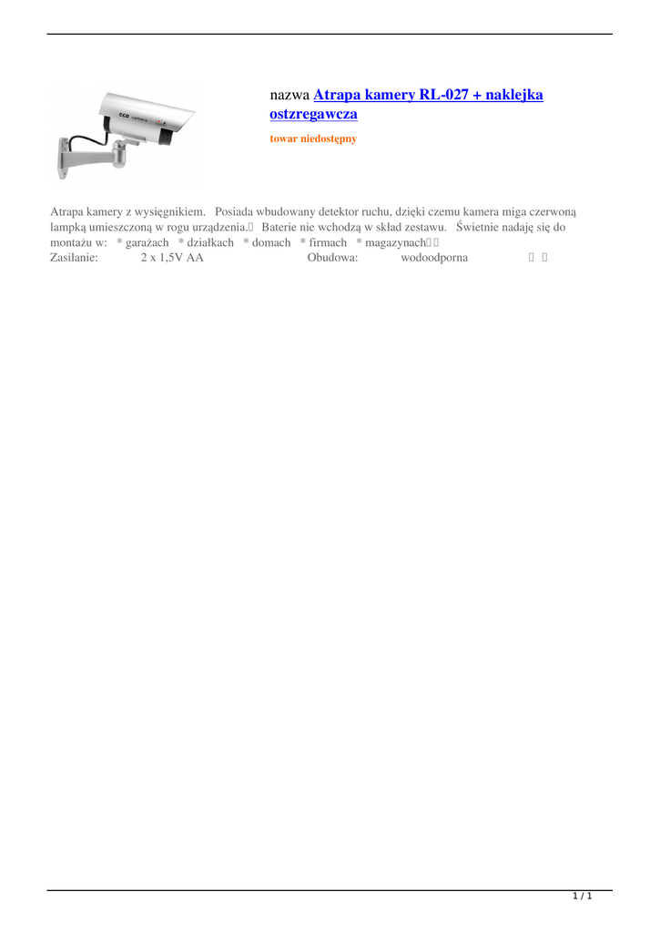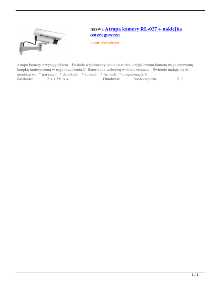 nazwa Atrapa kamery RL-027 + naklejka ostzregawcza towar niedostępny Atrapa kamery z wysięgnikiem. Posiada wbudowany detektor ruchu, dzięki czemu kamera miga czerwoną lampką umieszczoną w rogu urządzenia. Baterie nie wchodzą w skład zestawu. Świetnie nadaję się do montażu w: * garażach * działkach * domach * firmach * magazynach Zasilanie: 2 x 1,5V AA Obudowa: wodoodporna 1/1