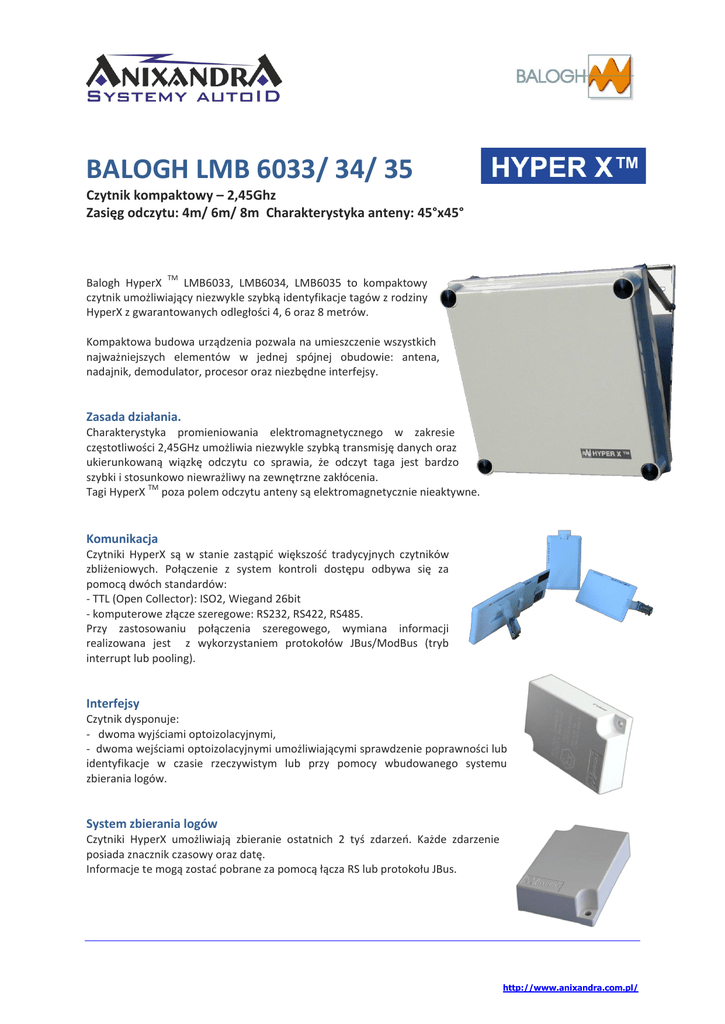 BALOGH LMB 6033/ 34/ 35 Czytnik kompaktowy – 2,45Ghz Zasięg odczytu: 4m/ 6m/ 8m Charakterystyka anteny: 45°x45° TM Balogh HyperX LMB6033, LMB6034, LMB6035 to kompaktowy czytnik umożliwiający niezwykle szybką identyfikacje tagów z rodziny HyperX z gwarantowanych odległości 4, 6 oraz 8 metrów. Kompaktowa budowa urządzenia pozwala na umieszczenie wszystkich najważniejszych elementów w jednej spójnej obudowie: antena, nadajnik, demodulator, procesor oraz niezbędne interfejsy. Zasada działania. Charakterystyka promieniowania elektromagnetycznego w zakresie częstotliwości 2,45GHz umożliwia niezwykle szybką transmisję danych oraz ukierunkowaną wiązkę odczytu co sprawia, że odczyt taga jest bardzo szybki i stosunkowo niewrażliwy na zewnętrzne zakłócenia. TM Tagi HyperX poza polem odczytu anteny są elektromagnetycznie nieaktywne. Komunikacja Czytniki HyperX są w stanie zastąpić większość tradycyjnych czytników zbliżeniowych. Połączenie z system kontroli dostępu odbywa się za pomocą dwóch standardów: - TTL (Open Collector): ISO2, Wiegand 26bit - komputerowe złącze szeregowe: RS232, RS422, RS485. Przy zastosowaniu połączenia szeregowego, wymiana informacji realizowana jest z wykorzystaniem protokołów JBus/ModBus (tryb interrupt lub pooling). Interfejsy Czytnik dysponuje: - dwoma wyjściami optoizolacyjnymi, - dwoma wejściami optoizolacyjnymi umożliwiającymi sprawdzenie poprawności lub identyfikacje w czasie rzeczywistym lub przy pomocy wbudowanego systemu zbierania logów. System zbierania logów Czytniki HyperX umożliwiają zbieranie ostatnich 2 tyś zdarzeń. Każde zdarzenie posiada znacznik czasowy oraz datę. Informacje te mogą zostać pobrane za pomocą łącza RS lub protokołu JBus. http://www.anixandra.com.pl/ Budowa Zastosowanie Szybka identyfikacja pojazdów - kontrola pojazdów przejeżdżających zarówno wąskimi jak i szerokimi pasami ruchu - doskonale zdefiniowane/znane pole odczytu Zarządzanie flotą - daleki zasięg odczytu - szybka identyfikacja pojazdów - identyfikacja wielu kierowców, ciężarówek lub kontenerów Transport kolejowy - Czytniki przystosowane do środowiska pracy - wiele czytników może pracować w tym samym obszarze - wbudowany system zbierania logów Kontrola dostępu pojazdów specjalnych - jednoczesna kontrola posiadacza taga oraz pojazdu - identyfikacja taga w każdej pozycji - solidna konstrukcja Specyfikacja Częstotliwość Wymiary Waga Temperatura pracy: Temperatura przechowywania: Klasa czelności: Wilgotność: Napięcie zasilania: Moc emisji (LMB_6033/34/35): Zasięg odczytu: (LMB_6033/34/35): Certyfikaty: Anixandra Hanna Czajkowska ul. Wilanowska 4A/28; 05-510 Konstancin Jeziorna Tel. (48 22) 646 6972, (48 22) 646 4190, (48 22) 853 4165 Biuro Handlowe: ul. Wita Stwosza 10A; 02-661 Warszawa 2,45Ghz 300 x 300 x 85 mm 5kg -20°C - +70°C -25°C - +80°C IP56 90% nie skondensowane 12-24 V DC, 12 W 75mW / 200mW / 350mW 4m / 6m / 8m ETS 300.440 - CE 0165 http://www.anixandra.com.pl/ e-mail: [email protected] NIP: 123-000-07-54 REGON: 015648005