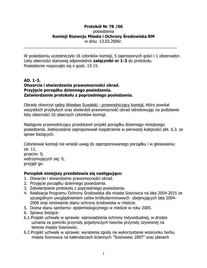 Protokół Nr 78 /06 posiedzenia Komisji Rozwoju Miasta i Ochrony Środowiska RM w dniu 13.03.2006r. _____________________________________________________________________ W posiedzeniu uczestniczyło 16 członków komisji, 5 zaproszonych gości i 1 obserwator. Listy obecności stanowią odpowiednio załączniki nr 1-3 do protokołu. Posiedzenie rozpoczęło się o godz. 15:15. AD. 1-3. Otwarcie i stwierdzenie prawomocności obrad. Przyjęcie porządku dziennego posiedzenia. Zatwierdzenie protokołu z poprzedniego posiedzenia. Obrady otworzył radny Wiesław Suwalski - przewodniczący komisji, który powitał wszystkich przybyłych oraz stwierdził prawomocność obrad odnotowując na podstawie listy obecności 16 obecnych członków komisji. Następnie przewodniczący przedstawił projekt porządku dziennego niniejszego posiedzenia. Jednocześnie zaproponował rozpatrzenie w pierwszej kolejności pkt. 6.3. ze spraw bieżących. Członkowie komisji nie wnieśli uwag do zaproponowanego porządku i w głosowaniu: za: 11, przeciw: 0, wstrzymujących się: 0, przyjęli go. Porządek niniejszy przedstawia się następująco: 1. Otwarcie i stwierdzenie prawomocności obrad. 2. Przyjęcie porządku dziennego posiedzenia. 3. Zatwierdzenie protokołu z poprzedniego posiedzenia. 4. Realizacja Programu Ochrony Środowiska dla miasta Sosnowca na lata 2004-2015 ze szczególnym uwzględnieniem celów krótkoterminowych obejmujących lata 20042006 oraz omówienie stanu ochrony środowiska w mieście. 5. Ocena stanu sanitarno- epidemiologicznego w mieście w roku 2005. 6. Sprawy bieżące: 6.1.Projekt uchwały w sprawie: wprowadzenia ochrony indywidualnej, w drodze uznania za pomniki przyrody pojedynczych tworów przyrody ożywionej na terenie miasta Sosnowiec. 6.2.Projekt uchwały w sprawie: wyrażenia zgody na wykorzystanie wizerunku herbu miasta Sosnowca na kalendarzach ściennych ”Sosnowiec 2007” oraz planach 1 miasta Sosnowca, które zamierza wydać Agencja Reklamowa CRUX z Katowic. 6.3.Projekt uchwały w sprawie: zmiany uchwały o przystąpieniu do sporządzenia Miejscowego planu zagospodarowania przestrzennego miasta Sosnowca dla obszaru Ludmiła-Staszic. 6.4.Informacja Wojewódzkiego Inspektoratu Ochrony Środowiska w sprawie uciążliwych zapachów występujących w dzielnicy Milowice, 6.5.Zarządzenie Nr 112 Prezydenta Miasta Sosnowca z dnia 22 lutego 2006r. Z kolei przewodniczący W.Suwalski przedstawił Protokół Nr 76/06 z posiedzenia komisji w dniu 13.02.2006r. Członkowie komisji nie wnieśli uwag do w/w protokołu i w głosowaniu : za: 12, przeciw: 0, wstrzymujących się: 0, przyjęli go. AD.6.3. Projekt uchwały w sprawie: zmiany uchwały o przystąpieniu do sporządzenia Miejscowego planu zagospodarowania przestrzennego miasta Sosnowca dla obszaru Ludmiła-Staszic. Pani Barbara Knapik - reprezentująca Pracownie Projektowo-Urbanistyczną zreferowała całość spraw związanych z powyższym projektem. Tekst rzeczonego projektu stanowi załącznik nr 4 do protokołu. Przewodniczący W.Suwalski wobec braku uwag i pytań ze strony radnych zaproponował przyjęcie pozytywnej opinii do przedstawionego projektu uchwały, którego treść odczytał. Komisja w wyniku głosowania: za: 13, przeciw: 0, wstrzymało się: 0, przyjęła w/w opinię. AD.4. Realizacja Programu Ochrony Środowiska dla miasta Sosnowca na lata 20042015 ze szczególnym uwzględnieniem celów krótkoterminowych obejmujących lata 2004-2006 oraz omówienie stanu ochrony środowiska w mieście. 2 Przewodniczący W.Suwalski wskazał na obszerny materiał tematyczny nadesłany przez Wydział Ochrony Środowiska i Rolnictwa. Stanowi on załącznik nr 5 do protokołu. Naczelnik WŚR W.Orlińska w skrócie omówiła w/w materiał zwracając uwagę na najistotniejsze sprawy wynikające z konieczności realizacji programu. Radny T.Bańbuła nawiązując do kwestii ograniczenia niskiej emisji przypomniał, że w II kadencji samorządu, w 1996r. wprowadzono dopłaty do zmiany paliwa węglowego na ekologiczne. Radny zapytał: Czy obecna sytuacja ekonomiczna nie weźmie góry nad ekologią, ponieważ w tej chwili olej opałowy jest znacznie droższy niż wtedy, kiedy rozpoczęto realizację przedsięwzięcia? Czy nie grozi nam sytuacja, że ludzie z powrotem będą przechodzili na paliwo nieekologiczne i znowu pojawią się problemy? W nawiązaniu do konserwacji cieków wodnych zwrócił uwagę, że koryta rzek wyglądają tragicznie i powinny być czyszczone. Radny zapytał: Czy te prace dalej będą prowadzone? Zdaniem radnego samorząd sosnowiecki powinien przyjąć wniosek w tej sprawie i skierować go pod adresem właścicieli, aby wreszcie zaczęli porządkować koryta rzek. Z kolei radny odniósł się do stanu drzew w mieście. Zapytał: Czy nie należałoby przymierzyć się do wymiany drzewostanu, szczególnie topól, które „przerosły” i stają się zagrożeniem dla otoczenia? Naczelnik WŚR Orlińska odpowiedziała, że wymiana drzewostanu topól jest sukcesywnie realizowana i to w bardzo dużym zakresie. Przygotowany materiał pisemny zawiera informacje na ten temat, ale nie ujęto w nim podsumowania: ile drzew jest rocznie usuwanych, w tym topól. Dane w tym zakresie mogą być przygotowane. Usuwane drzewa są zastępowane drzewami innych gatunków, takich które są bardziej długowieczne niż topole, odporne na zanieczyszczenia i nie stanowią zagrożenia dla otoczenia. Natomiast problem polega na tym, że nie da się w prosty sposób zastępować topól innymi drzewami, ponieważ rozwój infrastruktury miejskiej, sieci gazowych i kanalizacyjnych jaki nastąpił powoduje, że sadzenie drzew w tych samych miejscach jest już niemożliwe. Również nie zgadza się na to Wydział Organizacji Zarządzania Drogami i Ruchem Drogowym i Wydział Gospodarki Komunalnej i Mieszkaniowej. Większość usuwanych drzew stanowią topole. Zgodnie z zapisem obecnie obowiązującej ustawy o ochronie przyrody stare topole można 