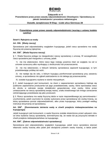 Załącznik nr 4 Przewidziane przez prawo zasady odpowiedzialności Dewelopera / Sprzedawcy za jakość świadczenia i procedura reklamacyjna Osiedle Jarzębinowe III Etap - Łódź ulica Górnicza 28 I. Przewidziane przez prawo zasady odpowiedzialności (wyciąg z ustawy kodeks cywilny) Dział II. Rękojmia za wady Art. 556. [Wady rzeczy] Sprzedawca jest odpowiedzialny względem kupującego, jeżeli rzecz sprzedana ma wadę fizyczną lub prawną (rękojmia). Art. 5561. [Wada fizyczna rzeczy] § 1. Wada fizyczna polega na niezgodności rzeczy sprzedanej z umową. W szczególności rzecz sprzedana jest niezgodna z umową, jeżeli: 1) nie ma właściwości, które rzecz tego rodzaju powinna mieć ze względu na cel w umowie oznaczony albo wynikający z okoliczności lub przeznaczenia; 2) nie ma właściwości, o których istnieniu sprzedawca zapewnił kupującego, w tym przedstawiając próbkę lub wzór; 3) nie nadaje się do celu, o którym kupujący poinformował sprzedawcę przy zawarciu umowy, a sprzedawca nie zgłosił zastrzeżenia co do takiego jej przeznaczenia; 4) została kupującemu wydana w stanie niezupełnym. § 2. Jeżeli kupującym jest konsument, na równi z zapewnieniem sprzedawcy traktuje się publiczne zapewnienia producenta lub jego przedstawiciela, osoby, która wprowadza rzecz do obrotu w zakresie swojej działalności gospodarczej, oraz osoby, która przez umieszczenie na rzeczy sprzedanej swojej nazwy, znaku towarowego lub innego oznaczenia odróżniającego przedstawia się jako producent. § 3. Rzecz sprzedana ma wadę fizyczną także w razie nieprawidłowego jej zamontowania i uruchomienia, jeżeli czynności te zostały wykonane przez sprzedawcę lub osobę trzecią, za którą sprzedawca ponosi odpowiedzialność, albo przez kupującego, który postąpił według instrukcji otrzymanej od sprzedawcy. Art. 5562. [Domniemanie istnienia wady w chwili przejścia niebezpieczeństwa na kupującego] Jeżeli kupującym jest konsument, a wada fizyczna została stwierdzona przed upływem roku od dnia wydania rzeczy sprzedanej, domniemywa się, że wada lub jej przyczyna istniała w chwili przejścia niebezpieczeństwa na kupującego. Art. 5563. [Zakres odpowiedzialności sprzedawcy] Sprzedawca jest odpowiedzialny względem kupującego, jeżeli rzecz sprzedana stanowi własność osoby trzeciej albo jeżeli jest obciążona prawem osoby trzeciej, a także jeżeli Strona 1 z 8 Załącznik nr 4 Przewidziane przez prawo zasady odpowiedzialności Dewelopera / Sprzedawcy za jakość świadczenia i procedura reklamacyjna Osiedle Jarzębinowe III Etap - Łódź ulica Górnicza 28 ograniczenie w korzystaniu lub rozporządzaniu rzeczą wynika z decyzji lub orzeczenia właściwego organu; w razie sprzedaży prawa sprzedawca jest odpowiedzialny także za istnienie prawa (wada prawna). Art. 557. [Zwolnienie od odpowiedzialności] § 1. Sprzedawca jest zwolniony od odpowiedzialności z tytułu rękojmi, jeżeli kupujący wiedział o wadzie w chwili zawarcia umowy. § 2. Gdy przedmiotem sprzedaży są rzeczy oznaczone tylko co do gatunku albo rzeczy mające powstać w przyszłości, sprzedawca jest zwolniony od odpowiedzialności z tytułu rękojmi, jeżeli kupujący wiedział o wadzie w chwili wydania rzeczy. Przepisu tego nie stosuje się, gdy kupującym jest konsument. § 3. Sprzedawca nie jest odpowiedzialny względem kupującego będącego konsumentem za to, że rzecz sprzedana nie ma właściwości wynikających z publicznych zapewnień, o których mowa w art. 5561 § 2, jeżeli zapewnień tych nie znał ani, oceniając rozsądnie, nie mógł znać albo nie mogły one mieć wpływu na decyzję kupującego o zawarciu umowy sprzedaży, albo gdy ich treść została sprostowana przed zawarciem umowy sprzedaży. Art. 558. [Modyfikacja odpowiedzialności] § 1. Strony mogą odpowiedzialność z tytułu rękojmi rozszerzyć, ograniczyć lub wyłączyć. Jeżeli kupującym jest konsument, ograniczenie lub wyłączenie odpowiedzialności z tytułu rękojmi jest dopuszczalne tylko w przypadkach określonych w przepisach szczególnych. § 2. Wyłączenie lub ograniczenie odpowiedzialności z tytułu rękojmi jest bezskuteczne, jeżeli sprzedawca zataił podstępnie wadę przed kupującym. Art. 559. [Chwila powstania wad] Sprzedawca jest odpowiedzialny z tytułu rękojmi za wady fizyczne, które istniały w chwili przejścia niebezpieczeństwa na kupującego lub wynikły z przyczyny tkwiącej w rzeczy sprzedanej w tej samej chwili. Art. 560. [Odstąpienie, obniżenie ceny, wymiana rzeczy] § 1. Jeżeli rzecz sprzedana ma wadę, kupujący może złożyć oświadczenie o obniżeniu ceny albo odstąpieniu od umowy, chyba że sprzedawca niezwłocznie i bez nadmiernych niedogodności dla kupującego wymieni rzecz wadliwą na wolną od wad albo wadę usunie. Ograniczenie to nie ma zastosowania, jeżeli rzecz była już wymieniona lub naprawiana przez sprzedawcę albo sprzedawca nie uczynił zadość obowiązkowi wymiany rzeczy na wolną od wad lub usunięcia wady. § 2. Jeżeli kupującym jest konsument, może zamiast zaproponowanego przez sprzedawcę usunięcia wady żądać wymiany rzeczy na wolną od wad albo zamiast wymiany rzeczy żądać usunięcia wady, chyba że doprowadzenie rzeczy do zgodności z umową w sposób wybrany przez kupującego jest niemożliwe albo wymagałoby nadmiernych kosztów w porównaniu ze sposobem proponowanym przez sprzedawcę. Przy ocenie nadmierności kosztów Strona 2 z 8 Załącznik nr 4 Przewidziane przez prawo zasady odpowiedzialności Dewelopera / Sprzedawcy za jakość świadczenia i procedura reklamacyjna Osiedle Jarzębinowe III Etap - Łódź ulica Górnicza 28 uwzględnia się wartość rzeczy wolnej od wad, rodzaj i znaczenie stwierdzonej wady, a także bierze się pod uwagę niedogodności, na jakie narażałby kupującego inny sposób zaspokojenia. § 3. Obniżona cena powinna pozostawać w takiej proporcji do ceny wynikającej z umowy, w jakiej wa